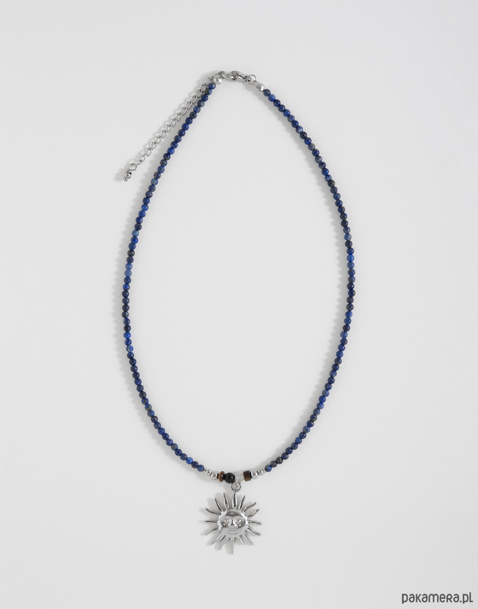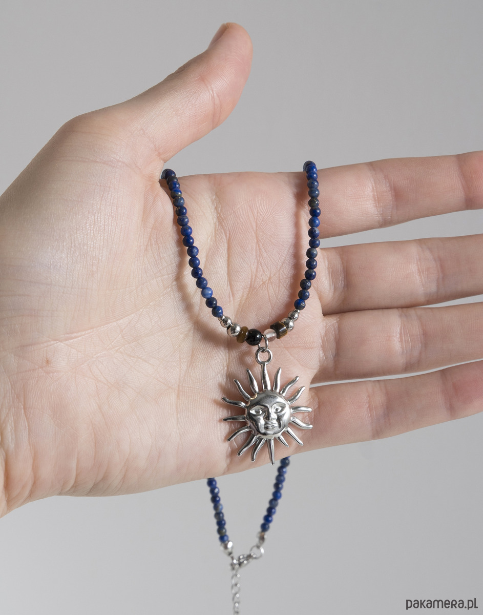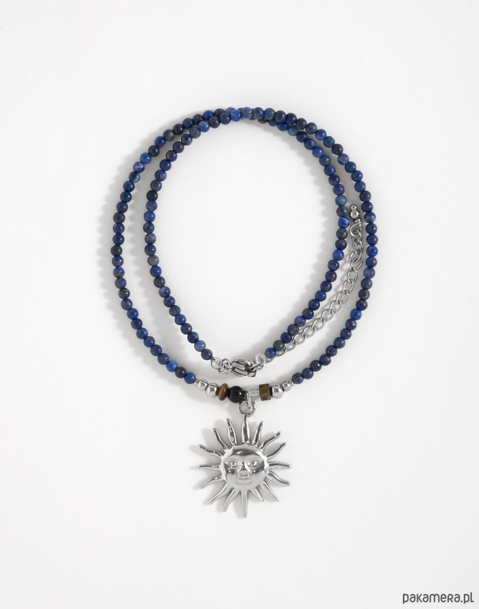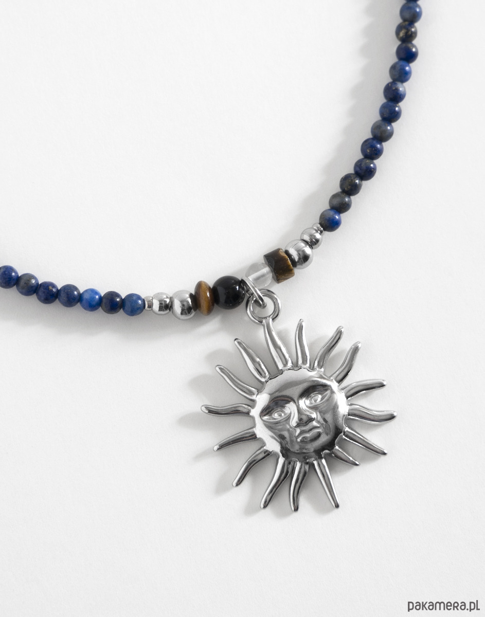 Bazą naszyjnika jest lapis lazuli, a w centralnej części znajdują się kamienie o różnych wielkościach:tygrysie oko, agat i kryształ górski.