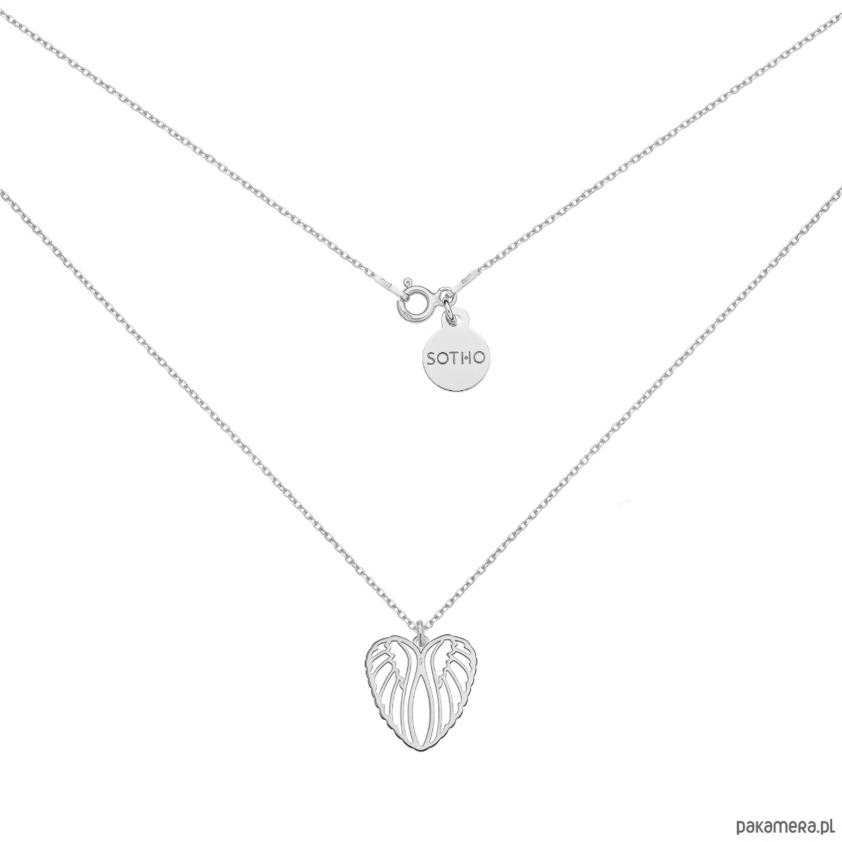 Srebrny naszyjnik łańcuszkowy zdobiony skrzydełkami w kształcie sercem i zawieszką z logo marki. Całość wykonana ze srebra 925.