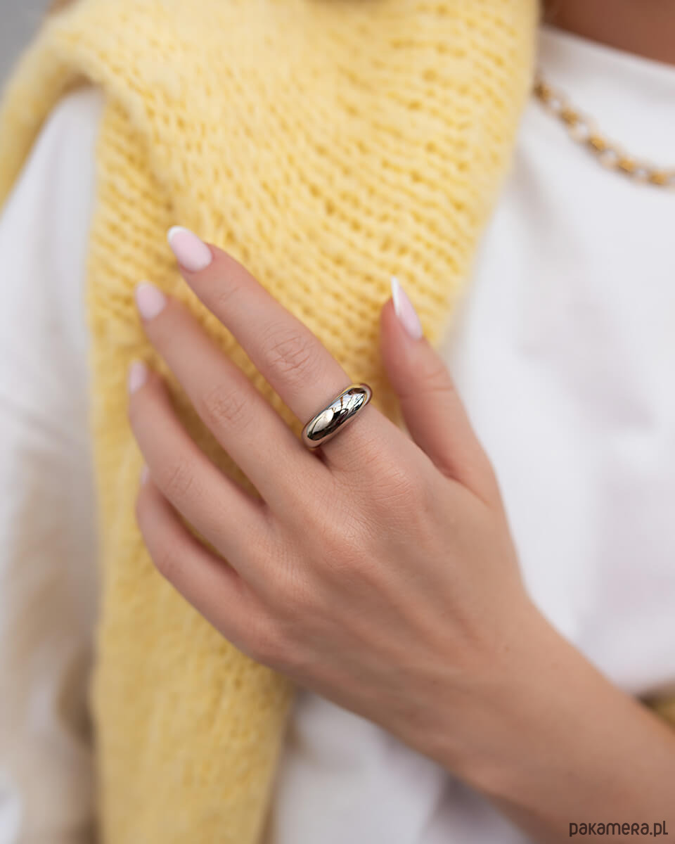 Ten pierścionek ze stali chirurgicznej to kwintesencja nowoczesnej elegancji – prosty, wyrazisty i niesamowicie uniwersalny. Jeśli cenisz sobie biżuterię, która dopełnia stylizację bez zbędnych zdobień, właśnie go znalazłaś.Zaokrąglona forma i masywna linia (szerokość 0,8 cm, średnica 2,8 cm) nadają mu charakteru, który pasuje zarówno do minimalistycznych outfitów, jak i bardziej ekstrawaganckich zestawień. Z powodzeniem możesz nosić go solo jako główny akcent, albo zestawiać z innymi pierścionkami dla bardziej efektownego looku.