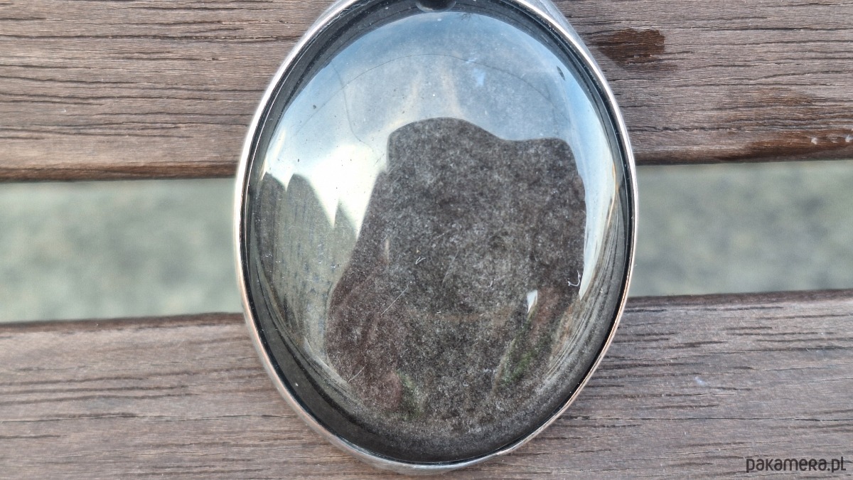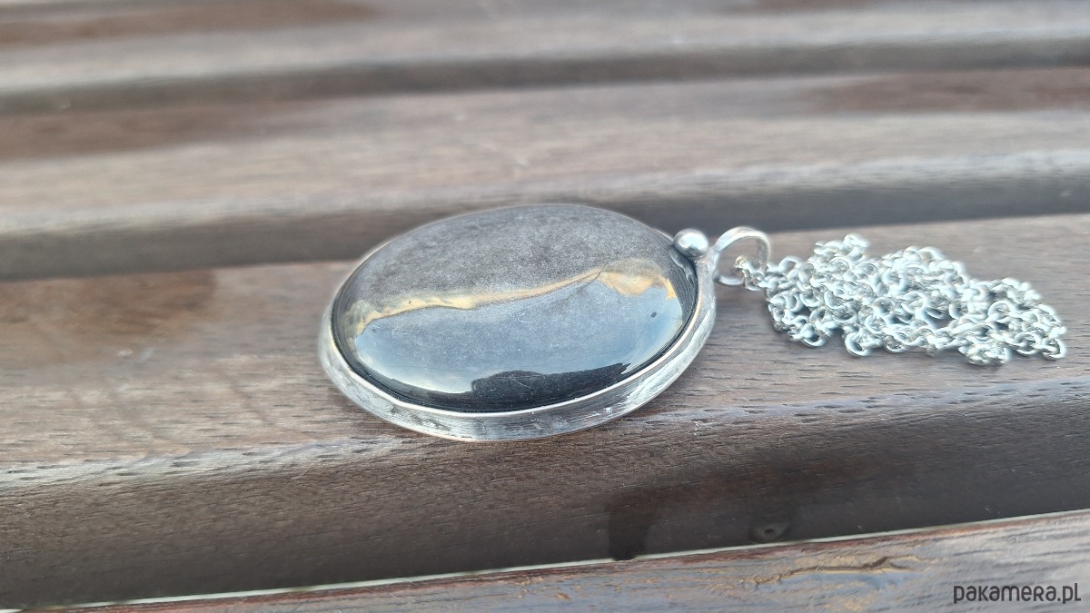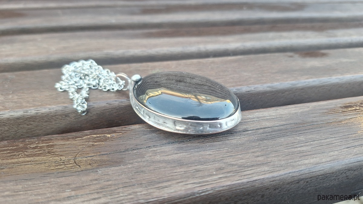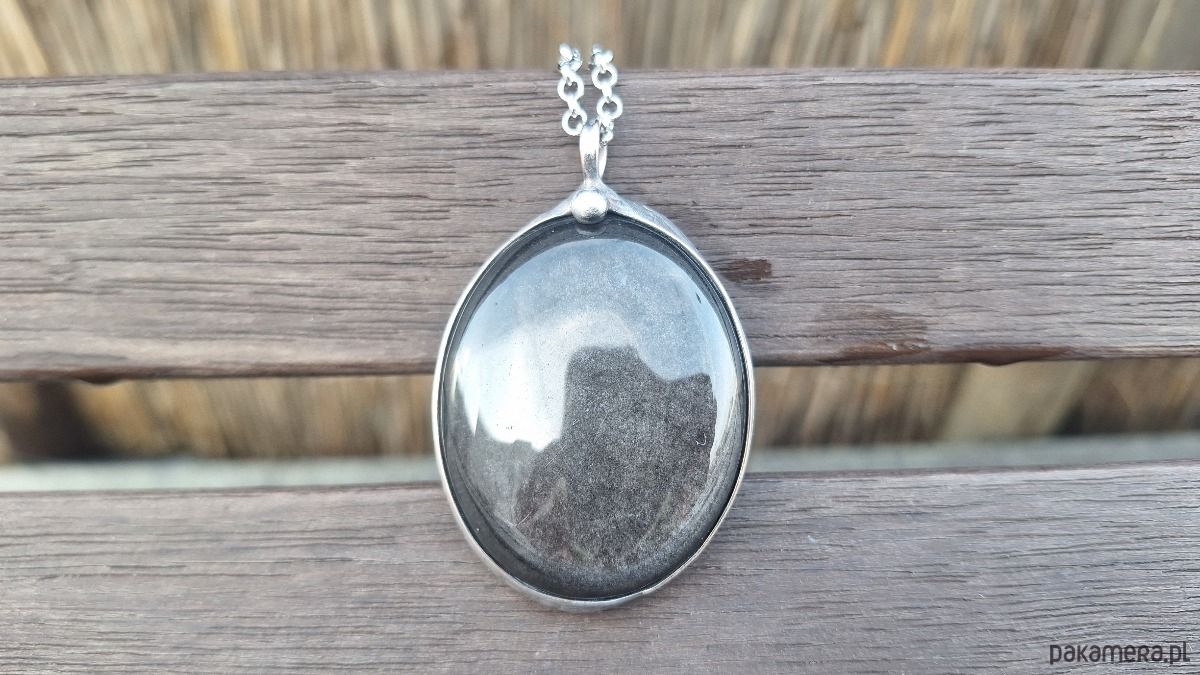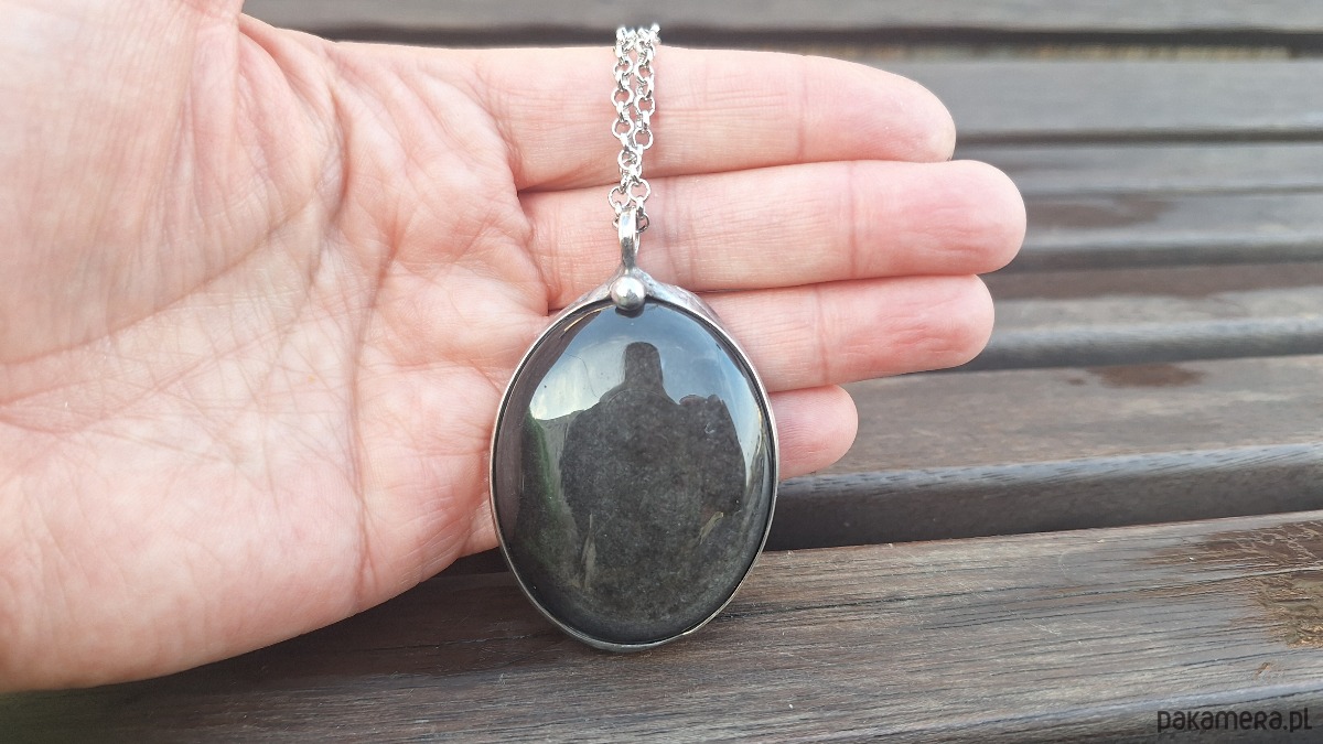 Wisiorek wykonany z miedzi, cyny i obsydianu. Wymiary ok. 5.5 na 4 cm. Zawieszony na łańcuszku o długości ok. 50 cm.