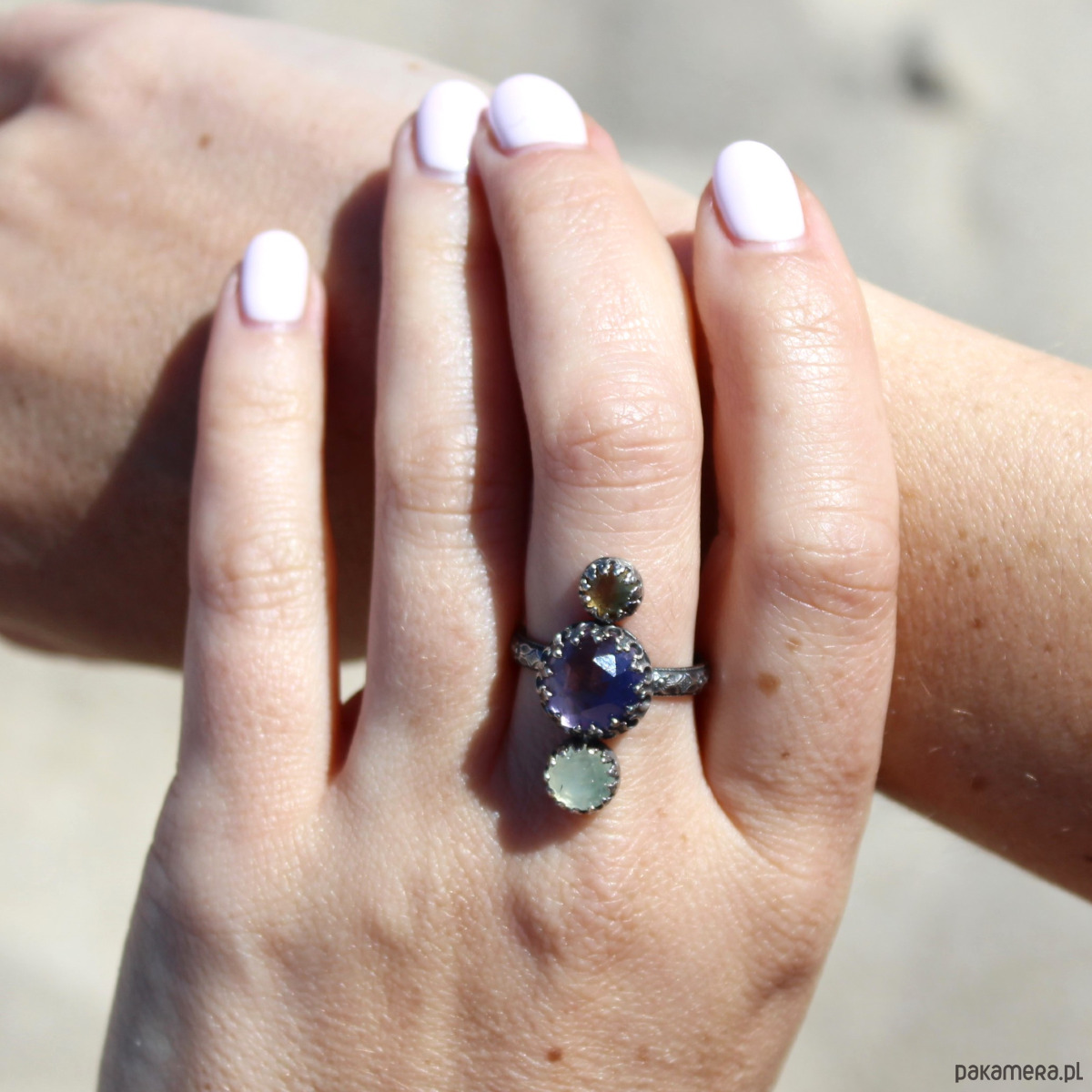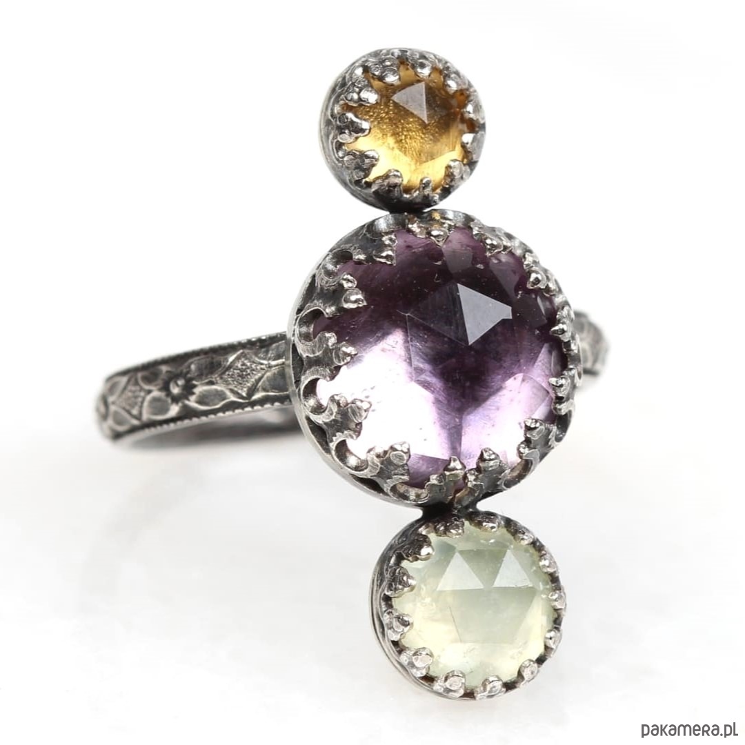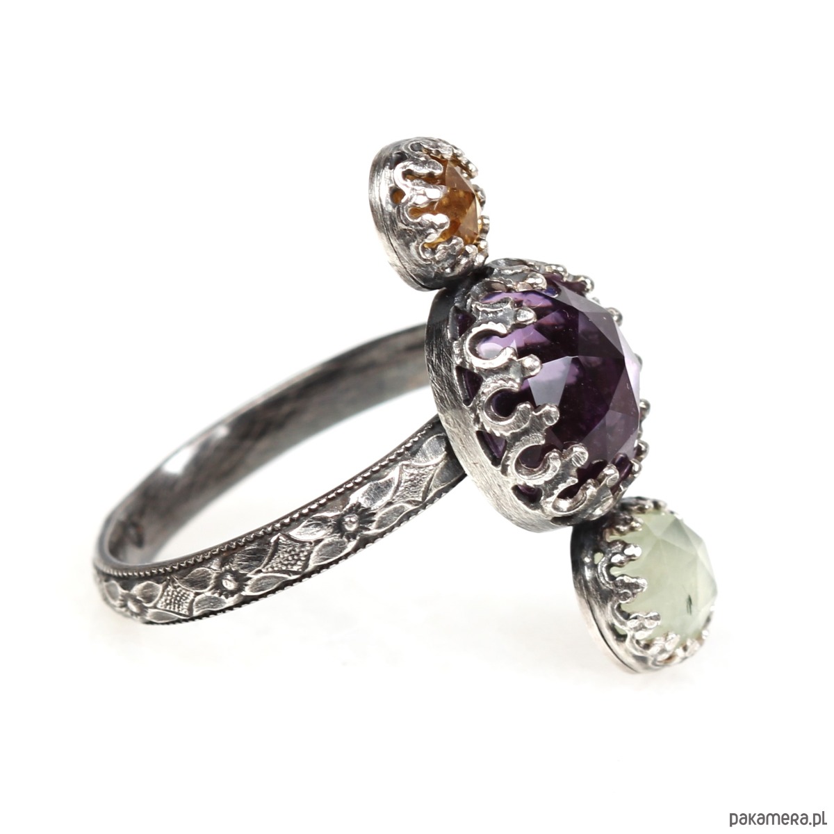 Ręcznie wykonany pierścionek z bajecznymi kamieniami szlachetnymi - ametystem, prehnitem i cytrynem z oksydowanego srebra z przepięknie fakturowaną obrączką i ozdobną cargą wokół kamienia w stylu Vintage.