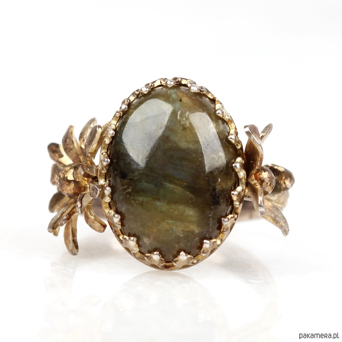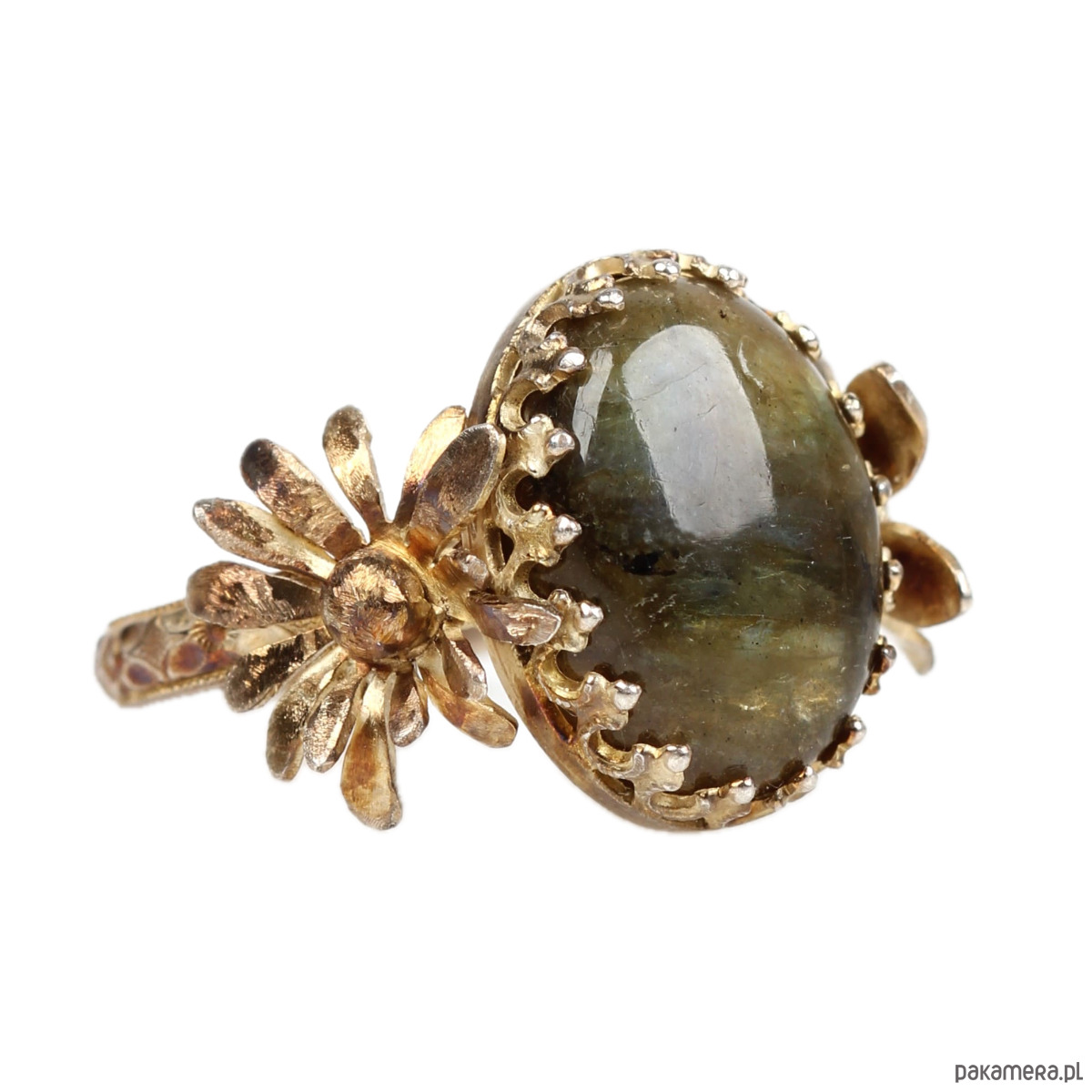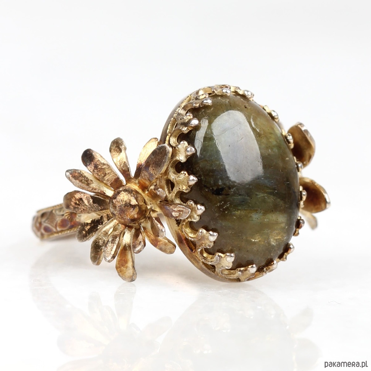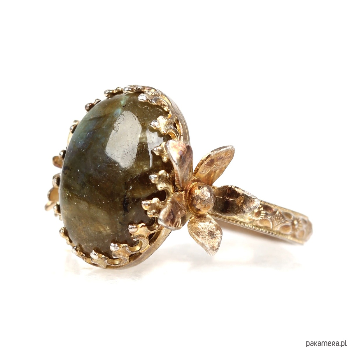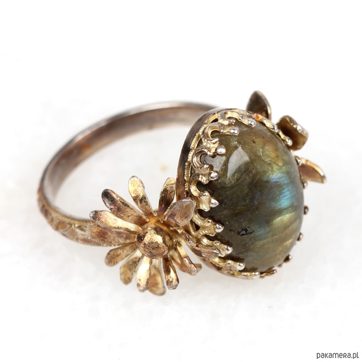 Ręcznie wykonany pierścionek z labradorytem ze srebra pokrytego oksydą tęczową z przepięknie fakturowaną obrączką, ozdobną cargą wokół kamienia w stylu Vintage oraz dwoma trójwymiarowymi kwiatami po bokach kamienia.