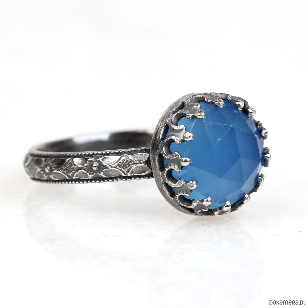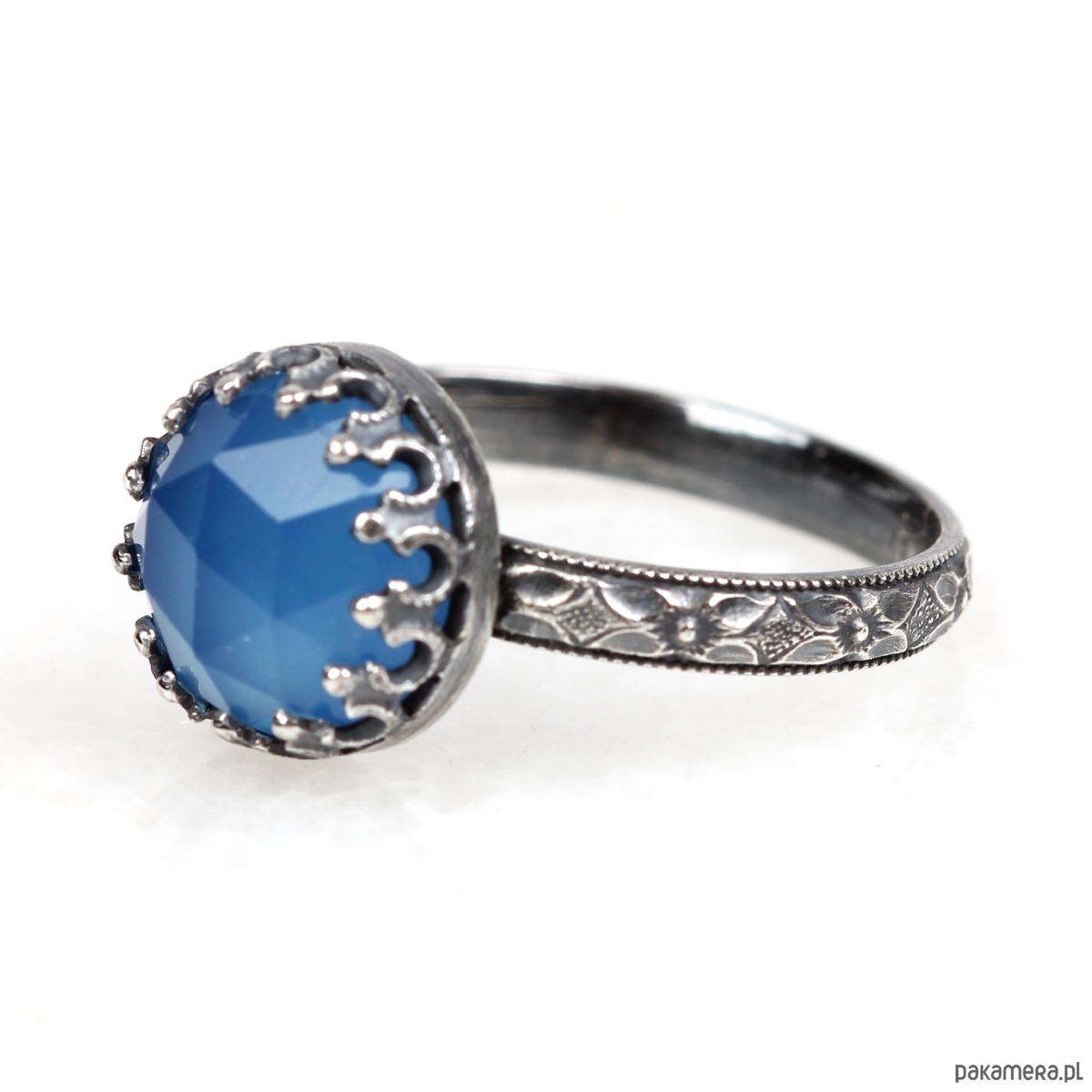 Ręcznie wykonany pierścionek ze agatem niebieskim ze srebra pokrytego oksydą z przepięknie fakturowaną obrączką i ozdobną cargą wokół kamienia w stylu Vintage. Spód pierścionka ozdobiony kwiatami aby dodać mu jeszcze bardziej unikatowego charakteru (każdy egzemplarz jest zdobiony w inny sposób:)