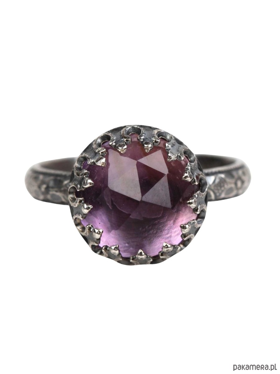 Ręcznie wykonany pierścionek z ametystem ze srebra pokrytego oksydą z przepięknie fakturowaną obrączką i ozdobną cargą wokół kamienia w stylu Vintage. Spód pierścionka ozdobiony kwiatami aby dodać mu jeszcze bardziej unikatowego charakteru (każdy egzemplarz jest zdobiony w inny sposób:)