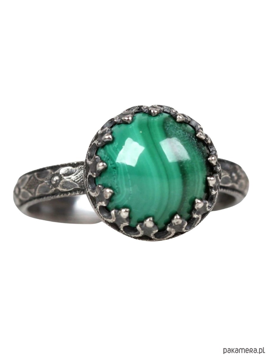 Ręcznie wykonany pierścionek z malachitem ze srebra pokrytego oksydą z przepięknie fakturowaną obrączką i ozdobną cargą wokół kamienia w stylu Vintage. Spód pierścionka ozdobiony kwiatami aby dodać mu jeszcze bardziej unikatowego charakteru (każdy egzemplarz jest zdobiony w inny sposób:)