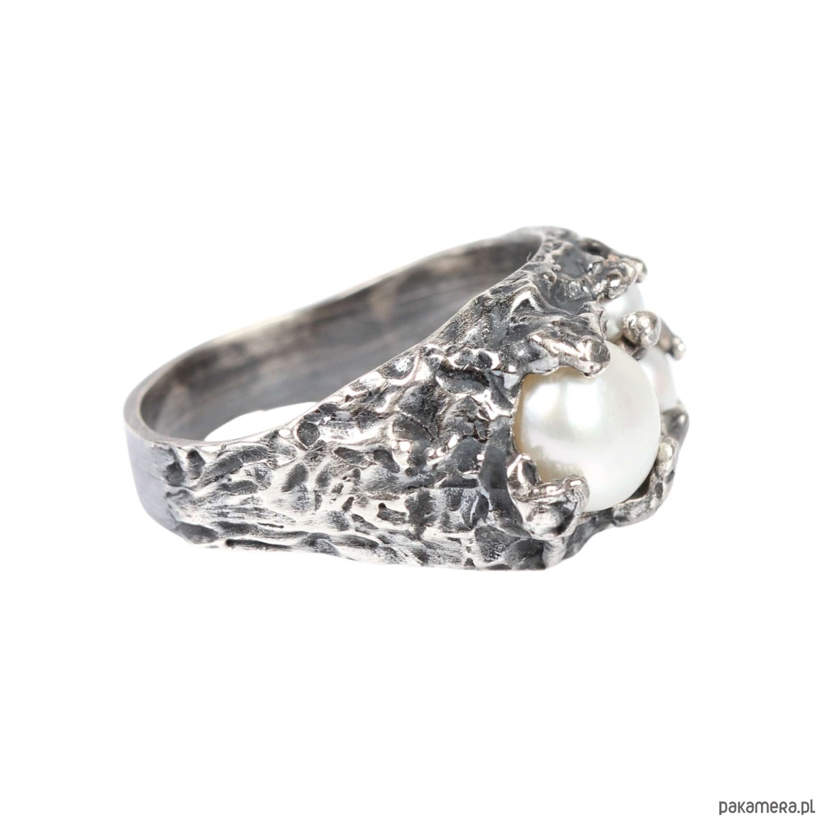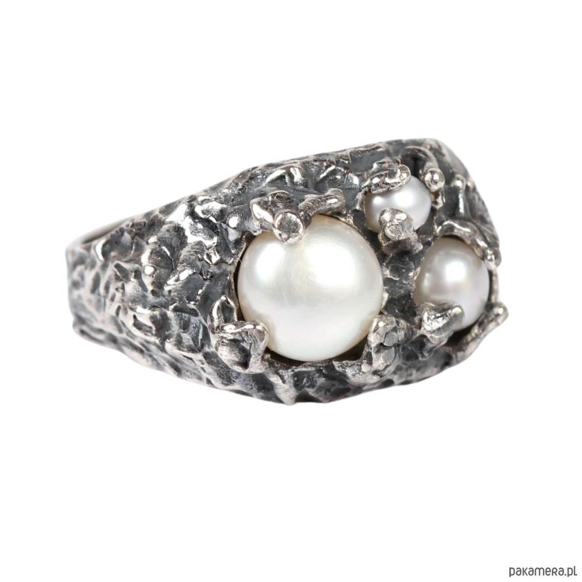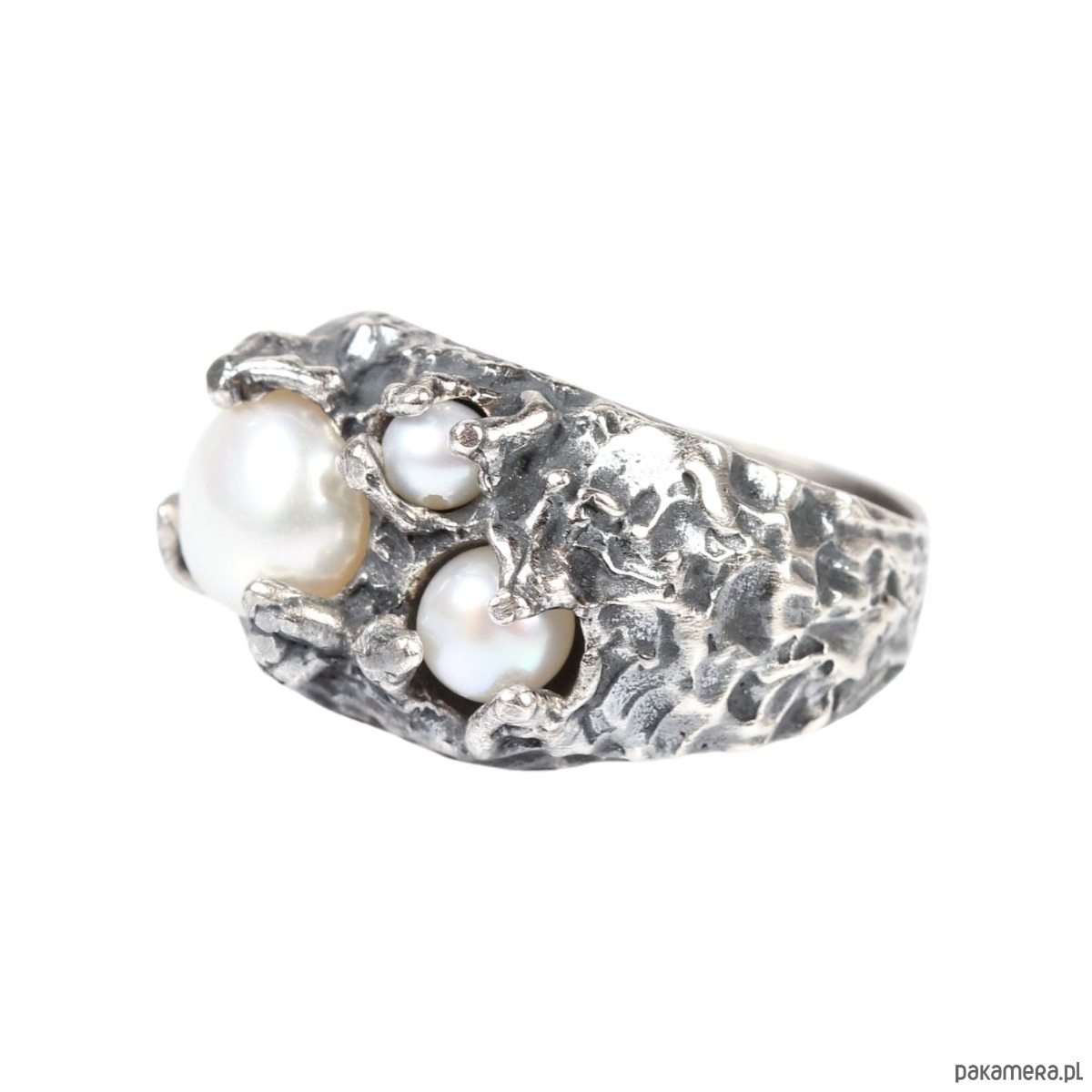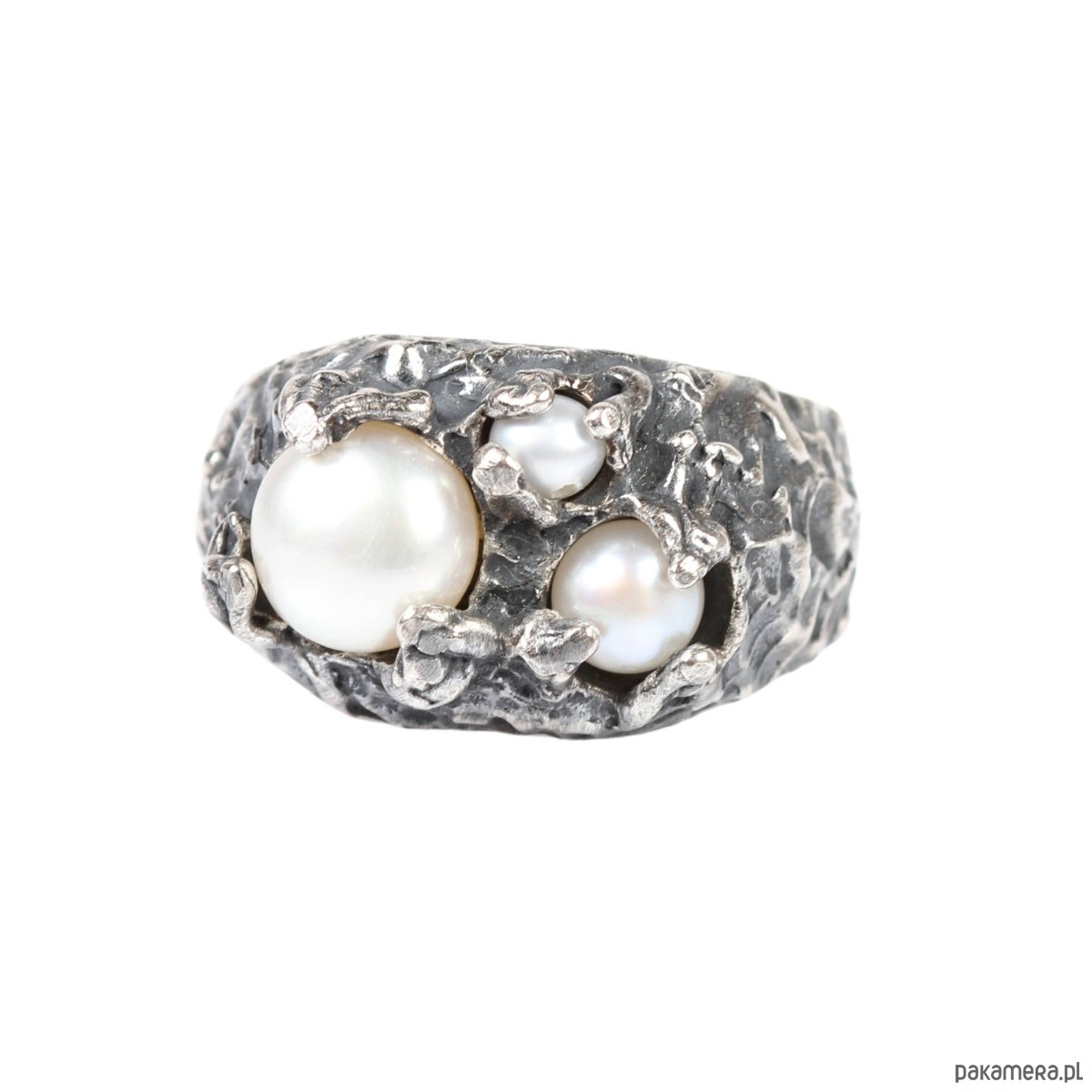Srebrny, oksydowany , duży sygnet o organicznych kształtach z trzema naturalnymi perłami różnej wielkości. Baza pierścionka została ręcznie, niepowtarzalnie wyrzeźbiona w wosku a następnie odlana w srebrze pr 925. Pierścionek został wykończony klasycznymi technikami jubilerskimi.