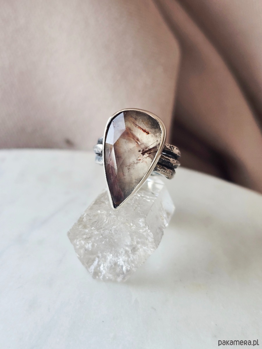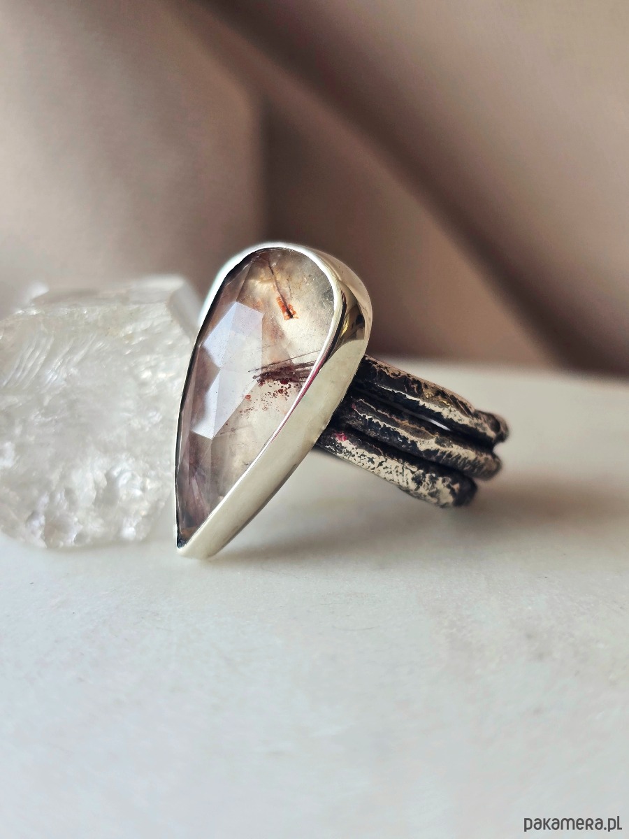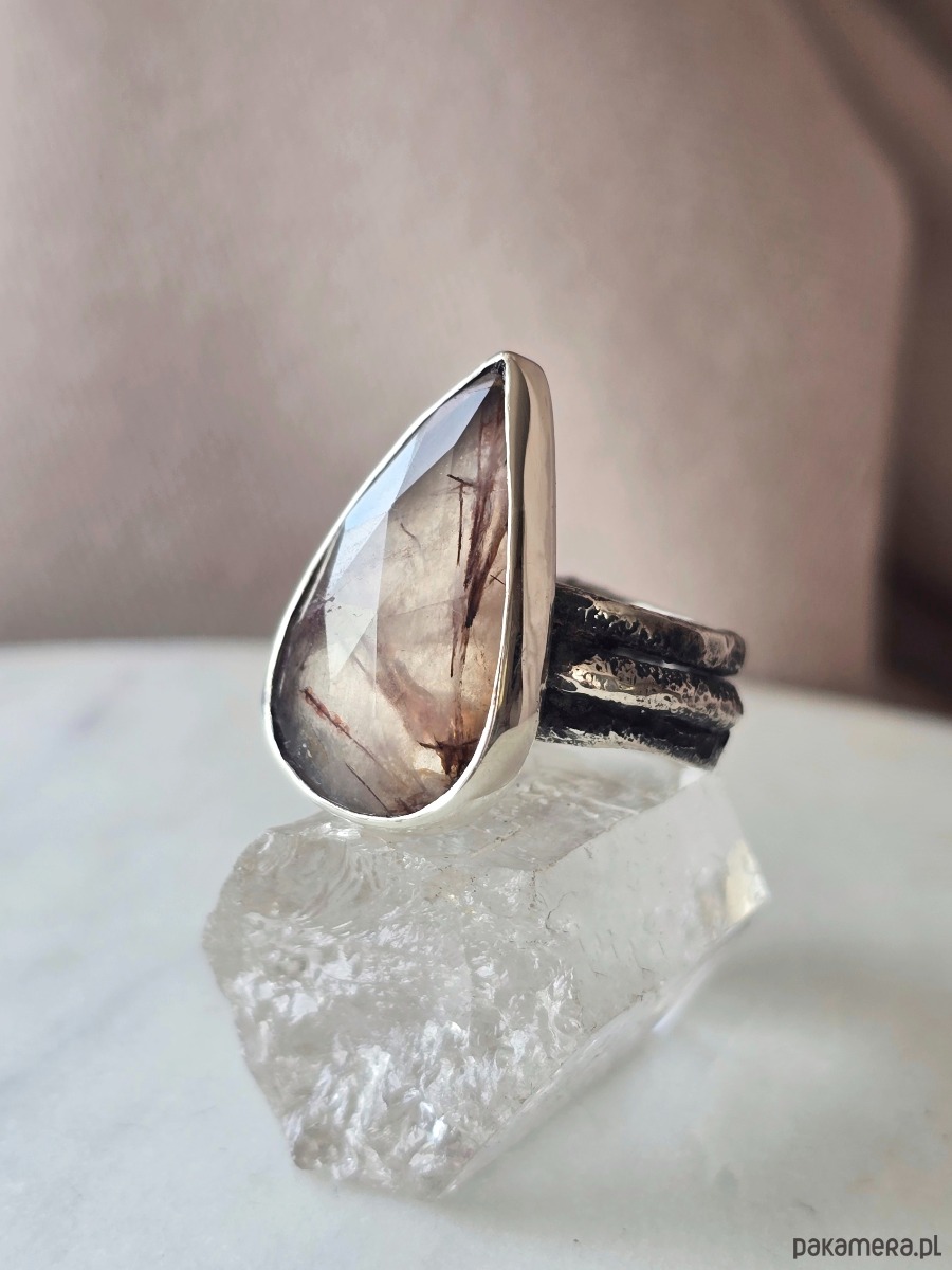 Bardzo ciekawy artystyczny srebrny pierścionek kwarcem rutylowym