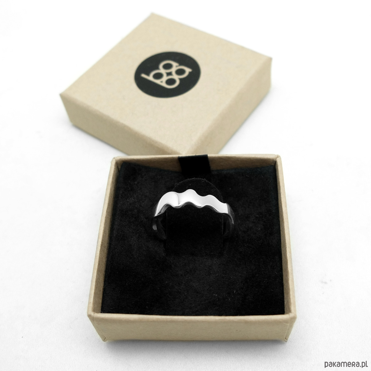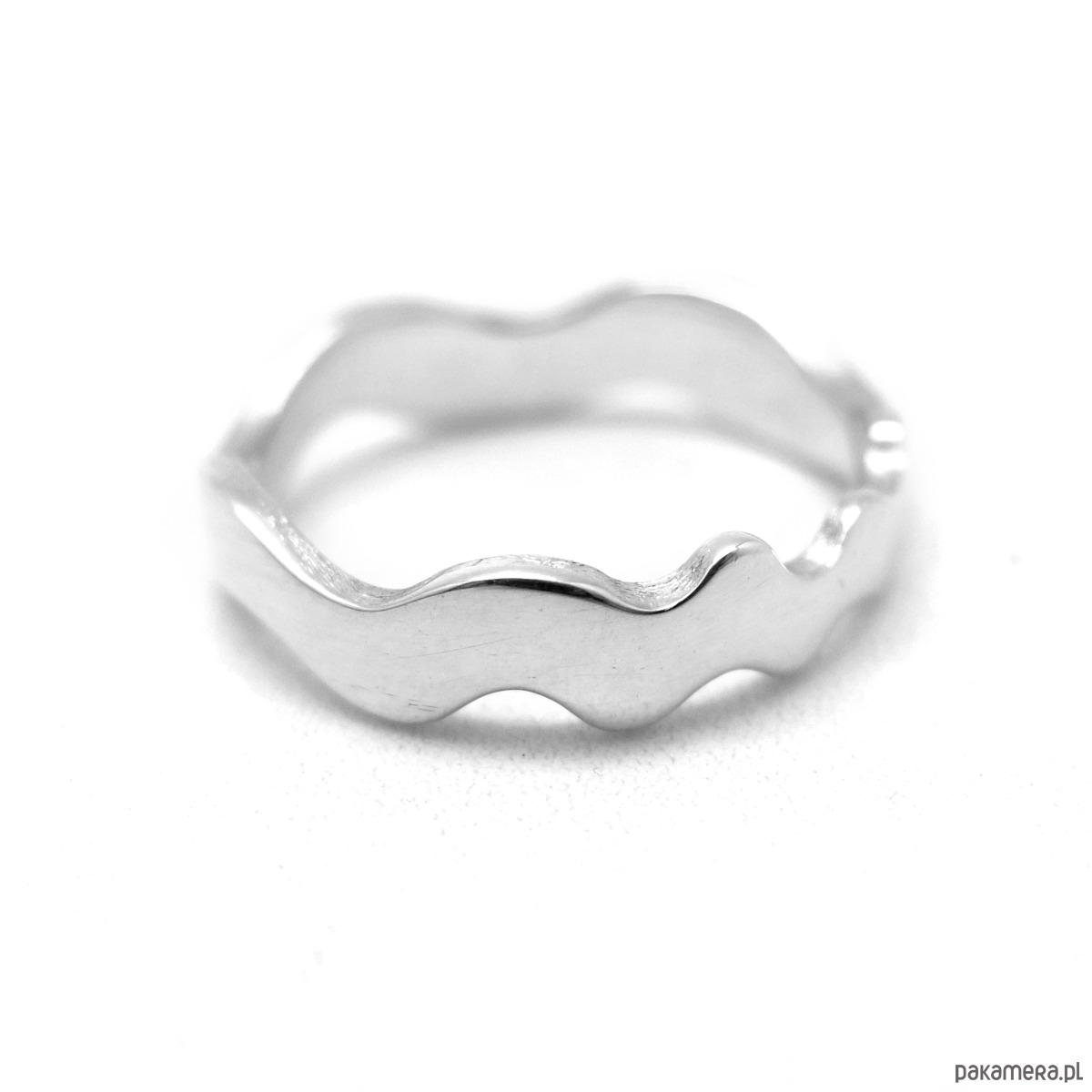 Srebrny pierścionek Fala to wynika zabawy z formą. Lekka w stylu i zabawna obrączka wykonana jest ze srebra. Fale o różnej szerokości nawiązują do sposobu w jaki fala przybija do brzegu morza. Tak jak woda odbijająca światło, wypolerowane srebro migocze w ruchu. Nowoczesny pierścionek ma wybitą próbę srebra 0,925.