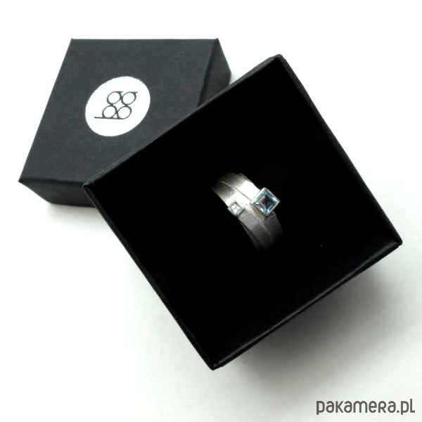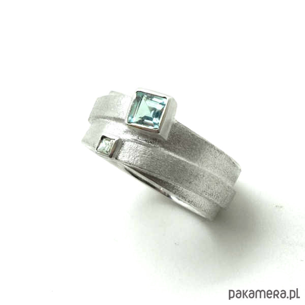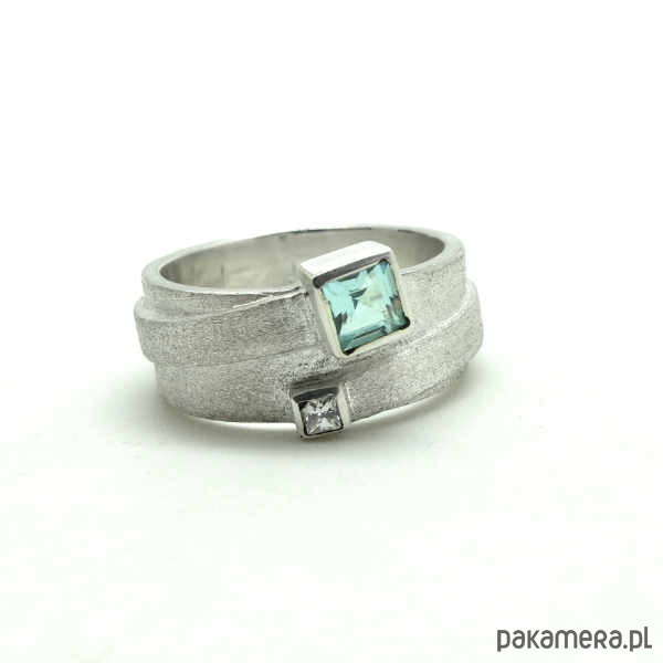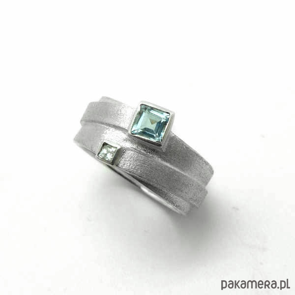 Pierścionek srebrny z topazami. Satynowy, szeroki na 1 cm pierścień ma oprawione dwa kwadratowe topazy: 2 mm bezbarwny i 4 mm niebieski. Delikatne odcienie błękitu bieli tworzą lekką kopozycję.