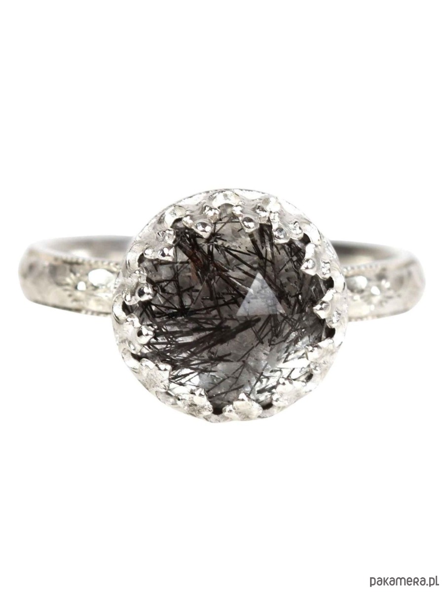 Ręcznie wykonany pierścionek z kwarcem z turmalinem ze srebra z przepięknie fakturowaną obrączką i ozdobną cargą wokół kamienia w stylu Vintage. Spód pierścionka ozdobiony kwiatami aby dodać mu jeszcze bardziej unikatowego charakteru (każdy egzemplarz jest zdobiony w inny sposób:)