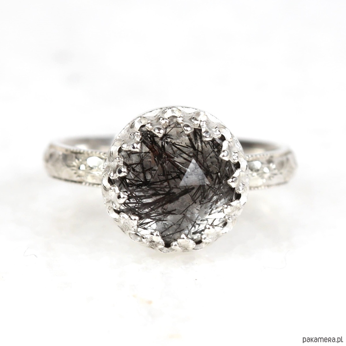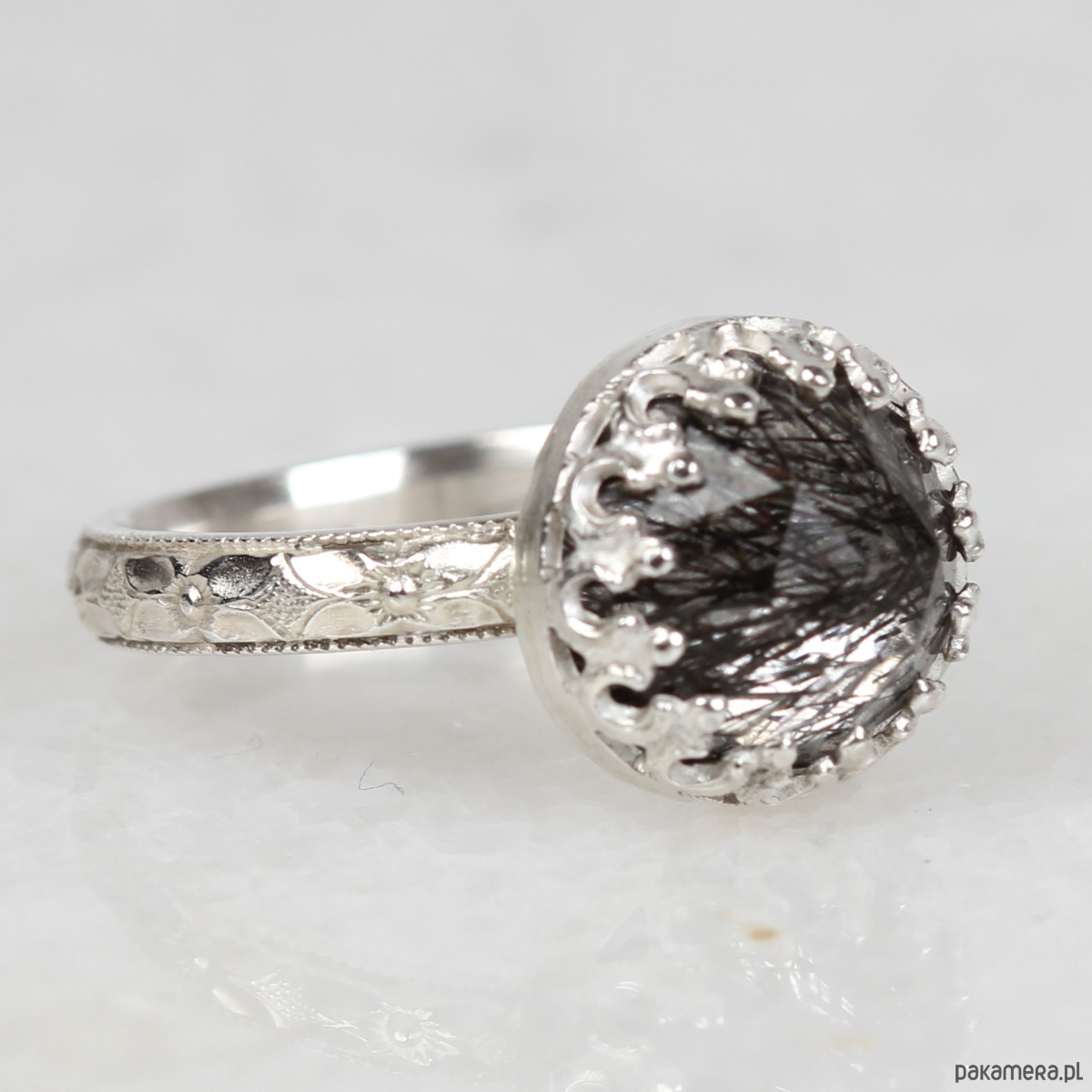 Ręcznie wykonany pierścionek z kwarcem z turmalinem ze srebra z przepięknie fakturowaną obrączką i ozdobną cargą wokół kamienia w stylu Vintage. Spód pierścionka ozdobiony kwiatami aby dodać mu jeszcze bardziej unikatowego charakteru (każdy egzemplarz jest zdobiony w inny sposób:)