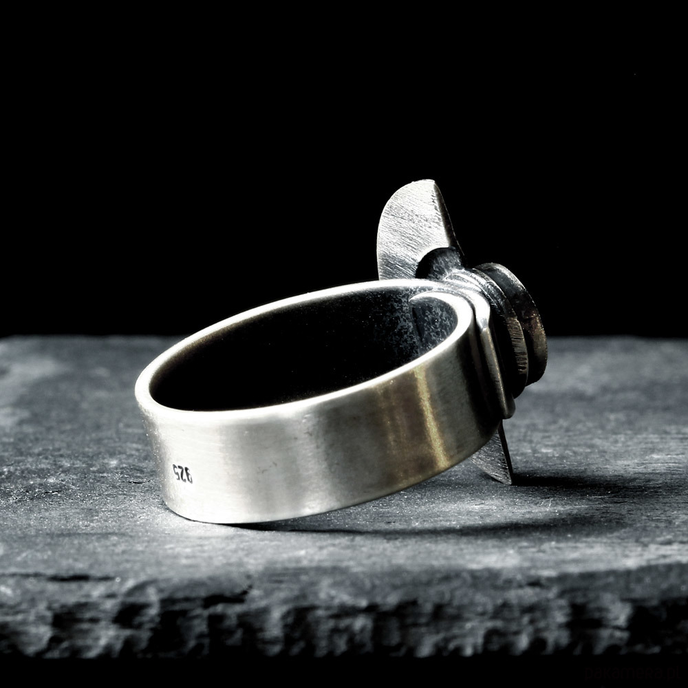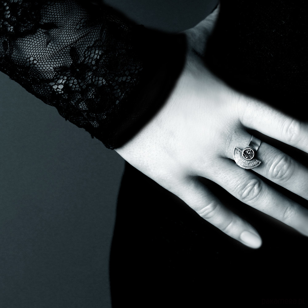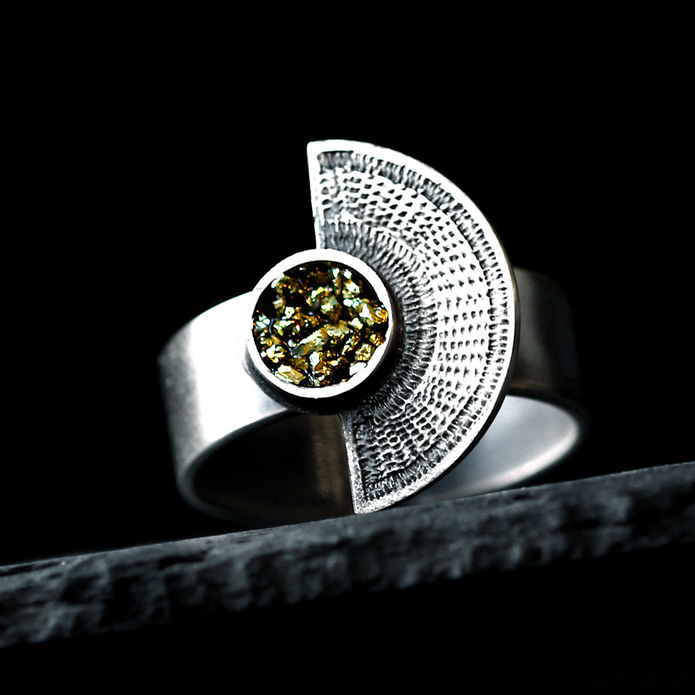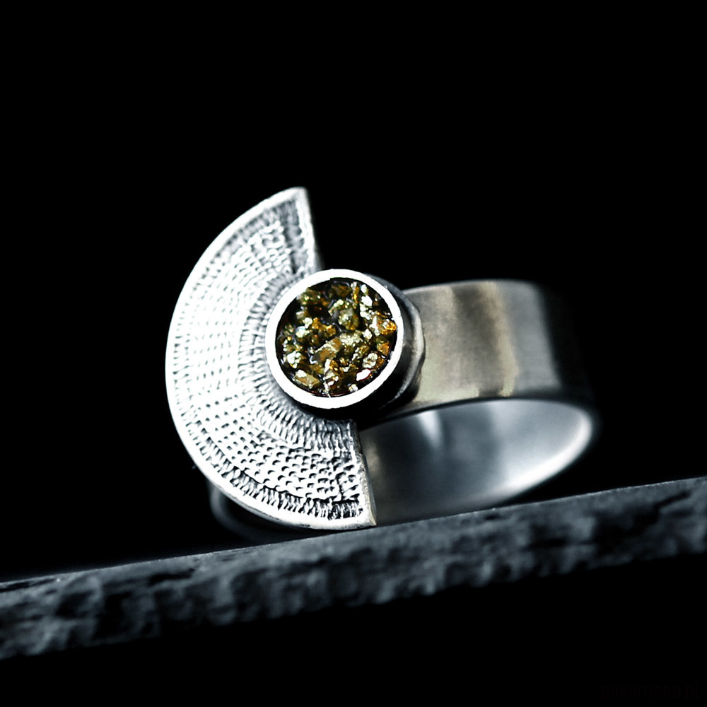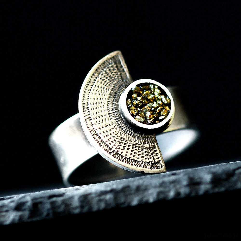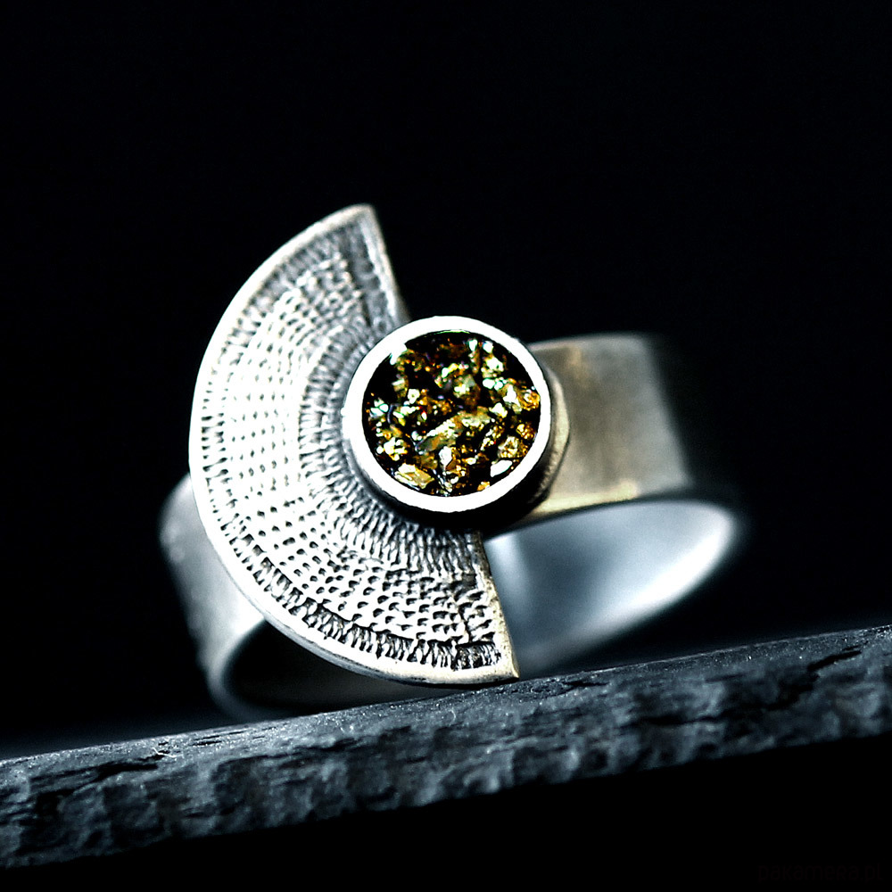 Unikatowy, etniczny pierścionek wykonany z oksydowanego srebra próby 925. Inspirowany wzornictwem starożytnego Egiptu. Dzięki swojej nowoczesnej formie jest ponadczasowy. Idealny dla kobiet, które preferują delikatną biżuterię w egzotycznym stylu. Wnętrze pierścionka wypełnia piryt - minerał mieniący się złotymi refleksami.