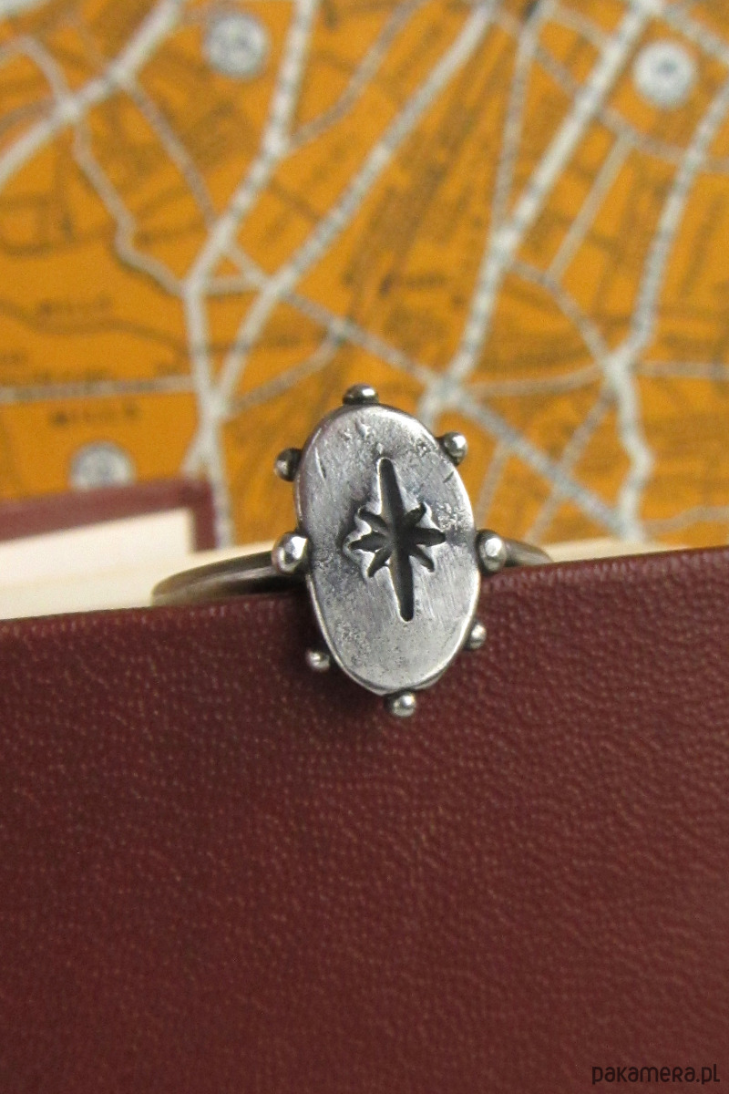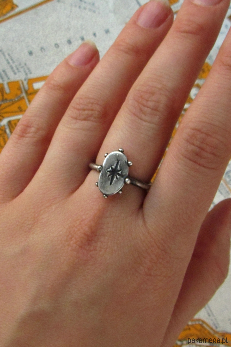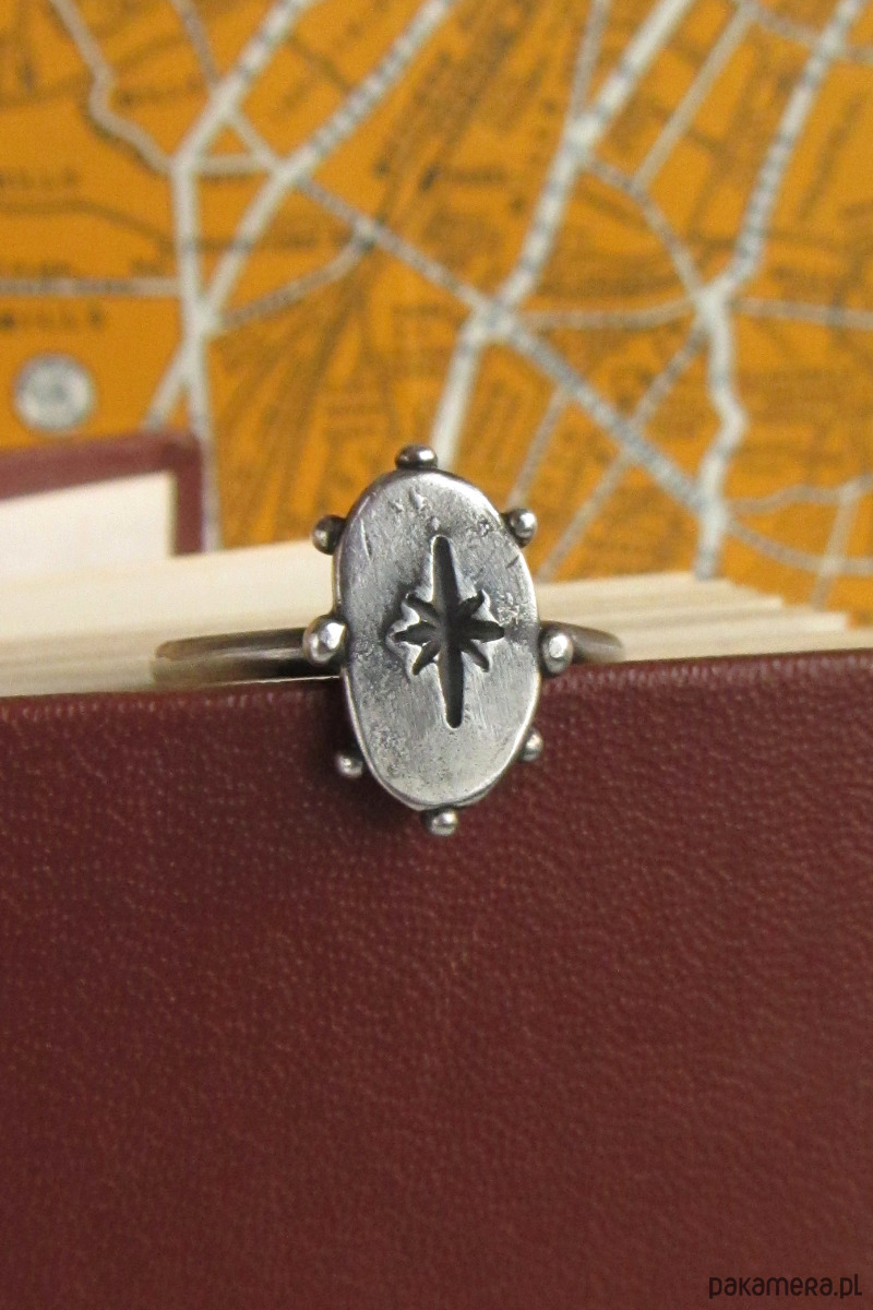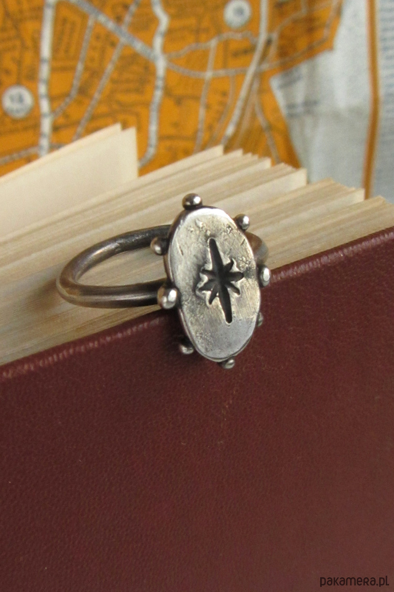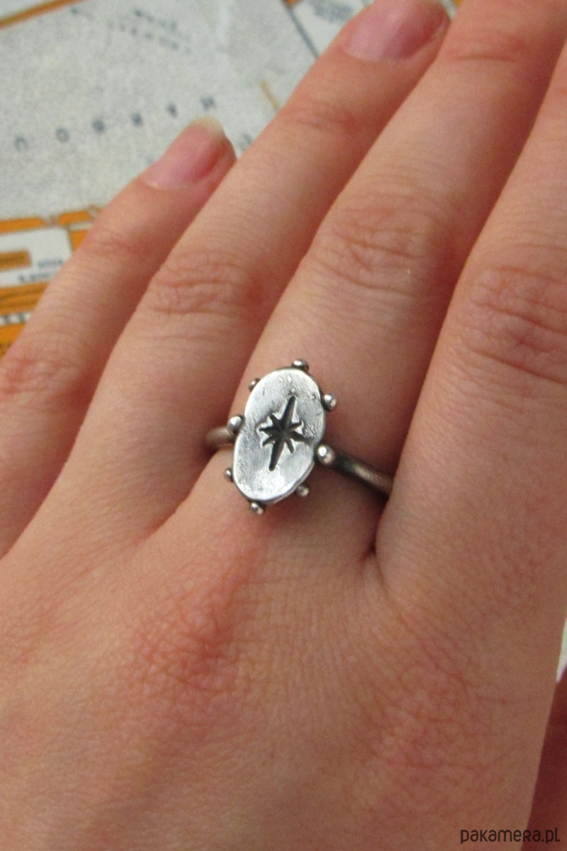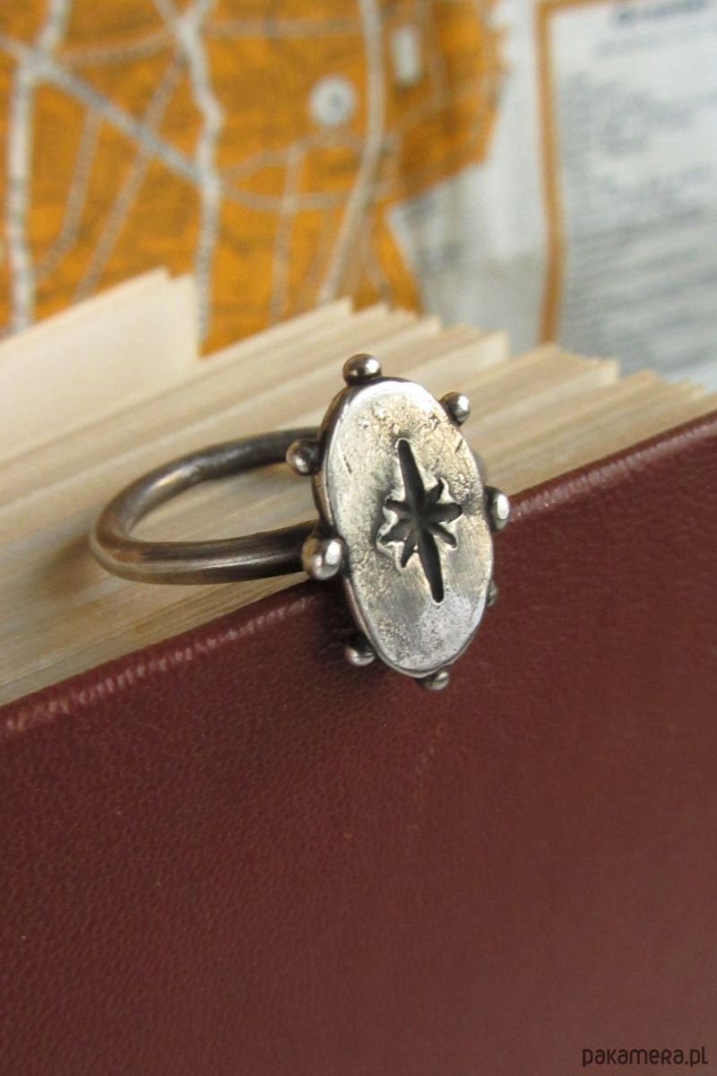Ręcznie rzeźbiony rustykalny pierścionek z gwiazdą. Wykonany w całości ze srebra metodą wosku traconego w krakowskiej pracowni.