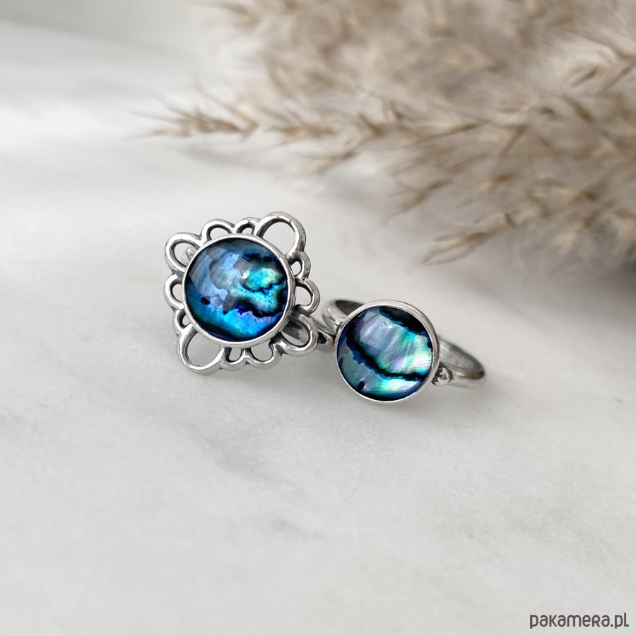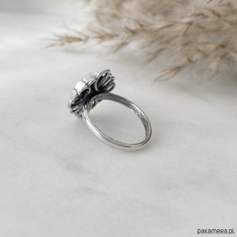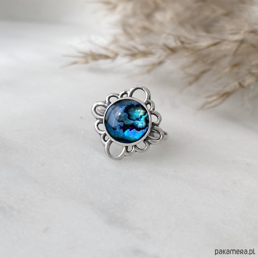 Oryginalny, niezwykle efektowny pierścionek wykonany ręcznie ze srebra próby 925 oraz pięknie połyskującej muszli.