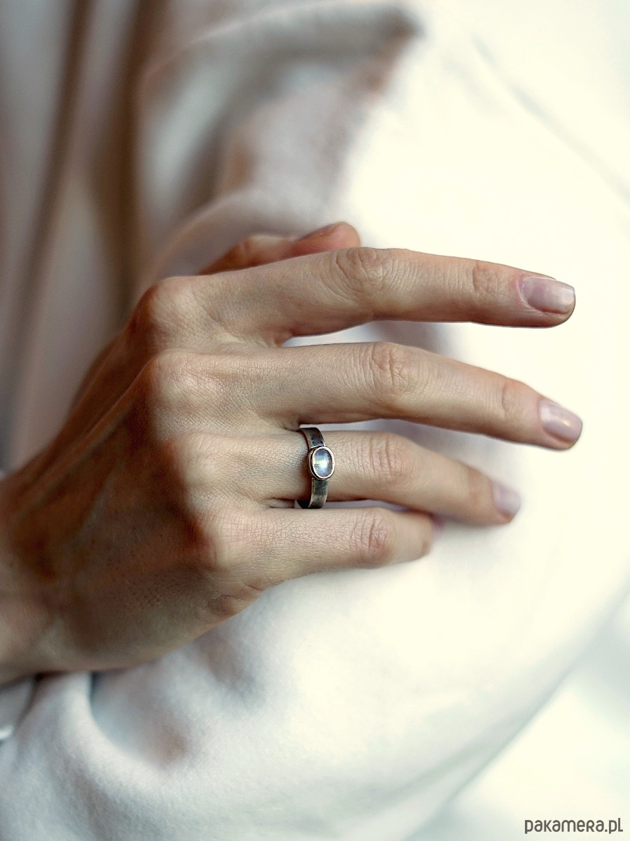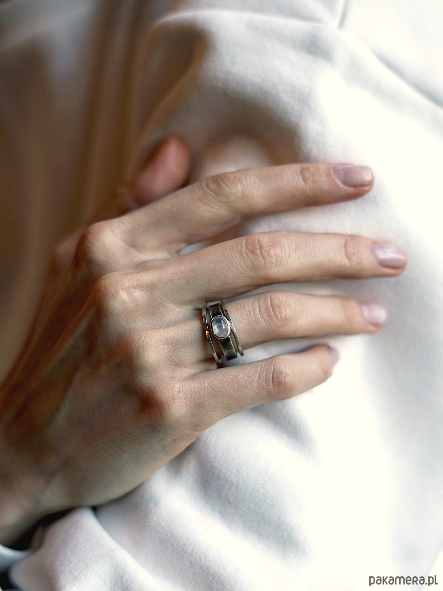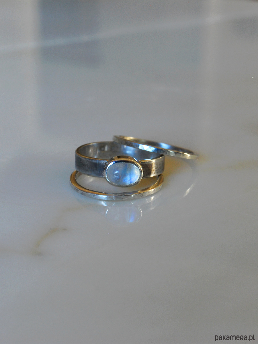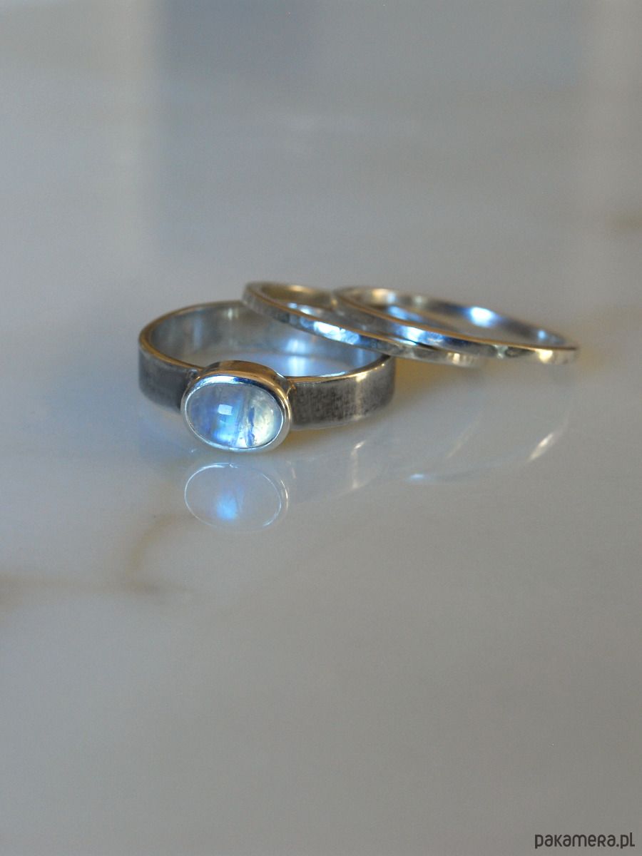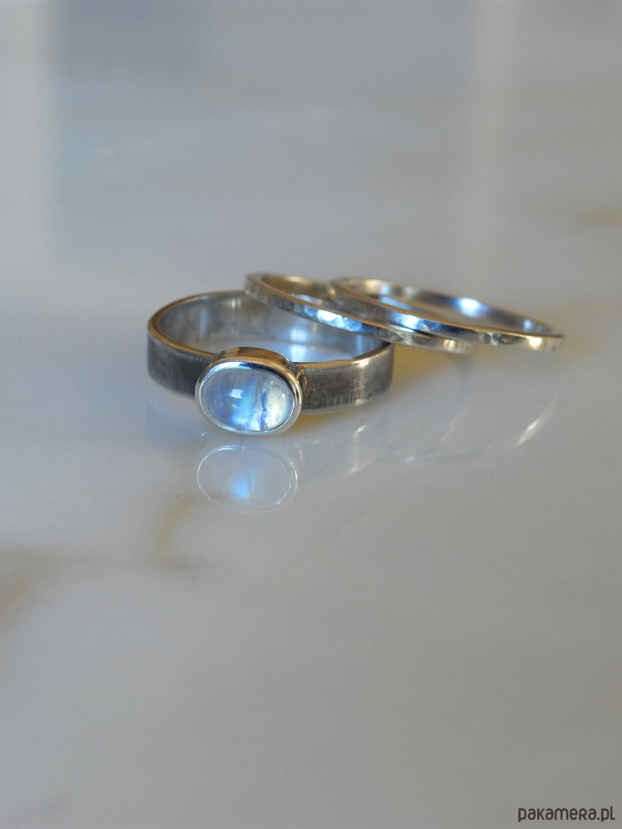 Pierścionek, który można nosić na różne sposoby: samodzielnie lub w towarzystwie dwóch obrączek. Kamień księżycowy ma wymiary 8x6 mm, pasek pierścionka ma zmatowioną powierzchnię i jest lekko oksydowany. Obrączki są delikatnie młotkowane. Pierścionek wykonam ręcznie ze srebra próby 925 w zamówionym rozmiarze. Wyrób wyślę w eleganckim czarnym pudełeczku z logo.