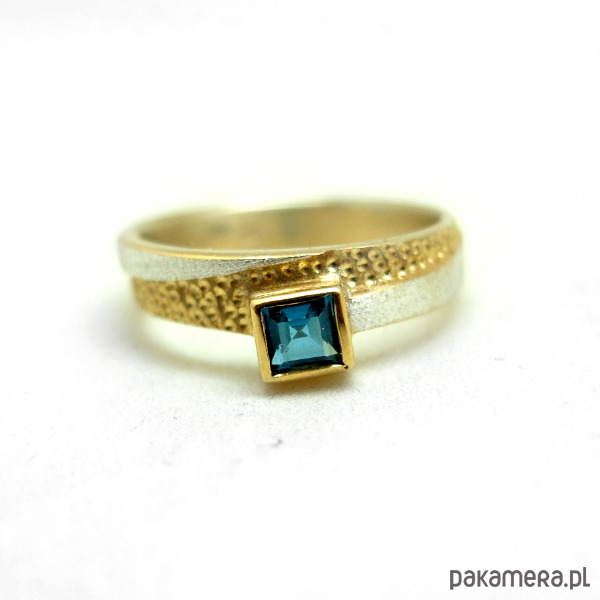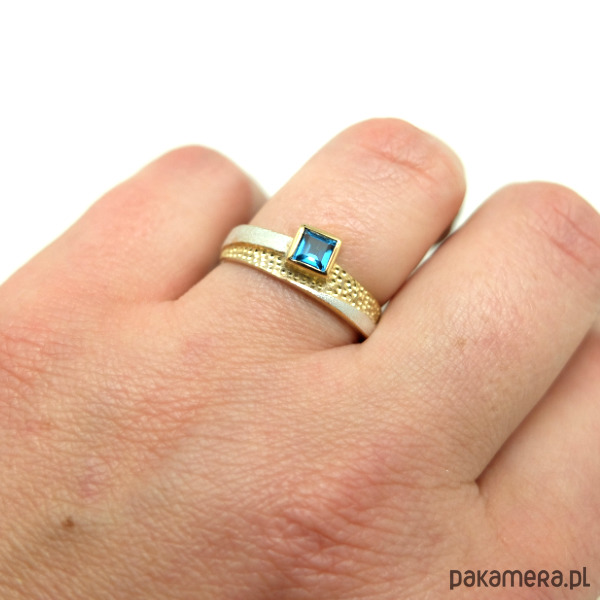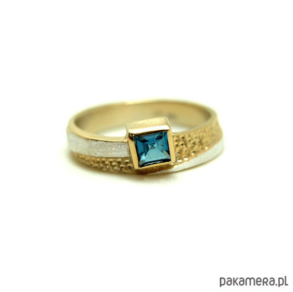 Pierścień srebrny, częściowo pozłacany z 4 mm kwadratowym niebieskiem topazem. Powierzchnia złoto-srebrnego pierścienia jest wykończona dwoma różnymi fakturami. Jest szeroki na 7 mm.