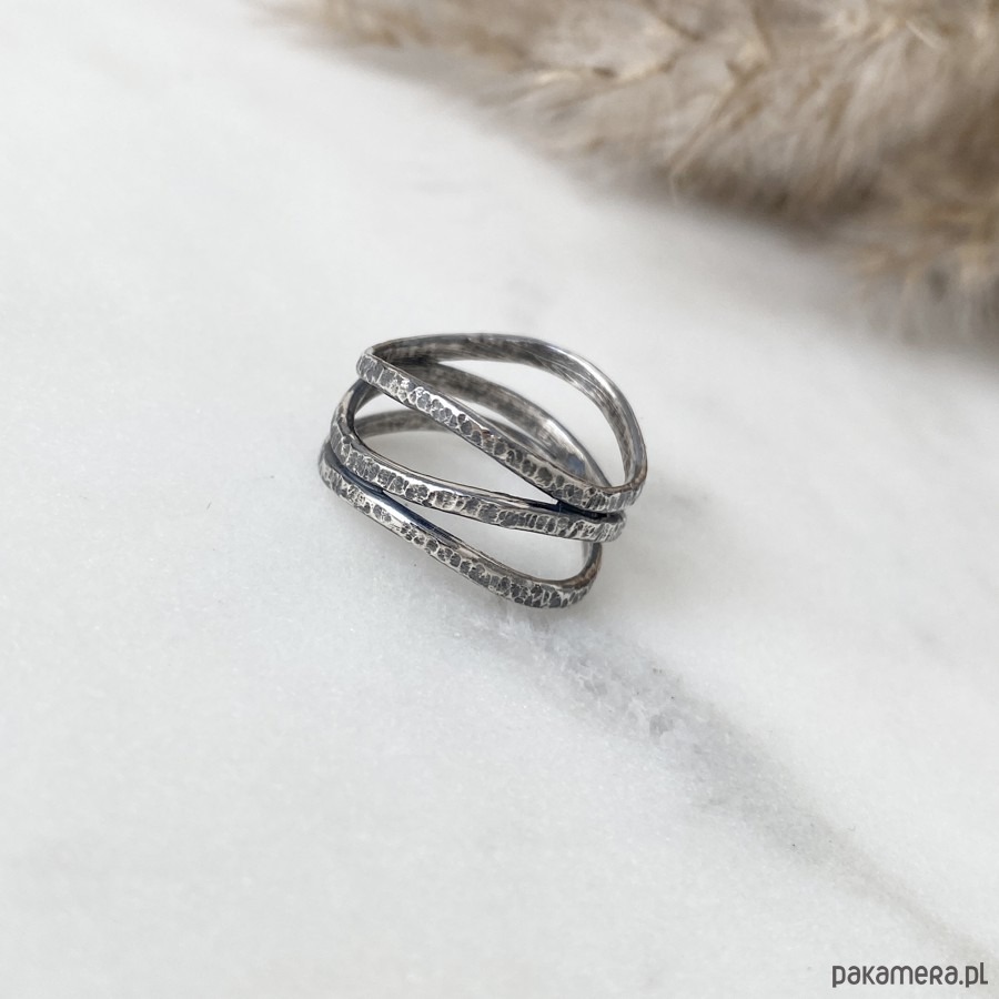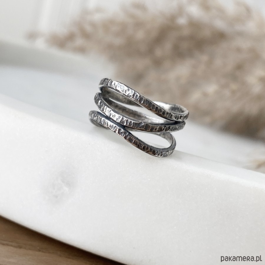 Surowy w formie pierścionek o nieregularnej linii, wykonany ze srebra próby 925.