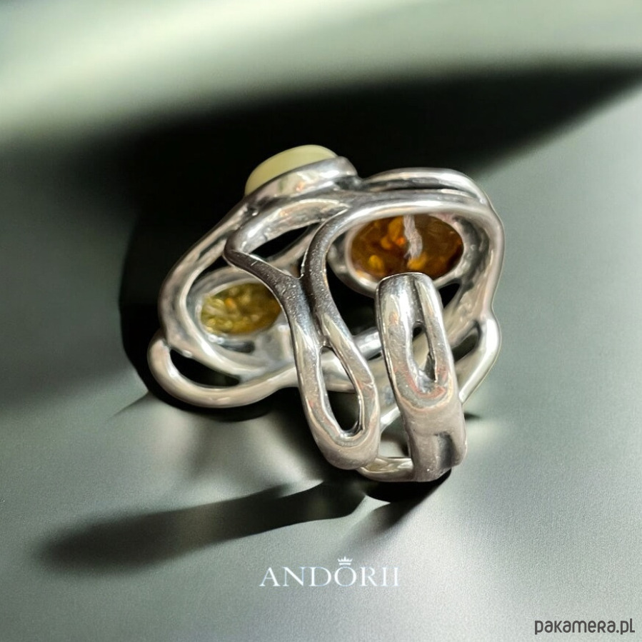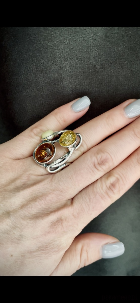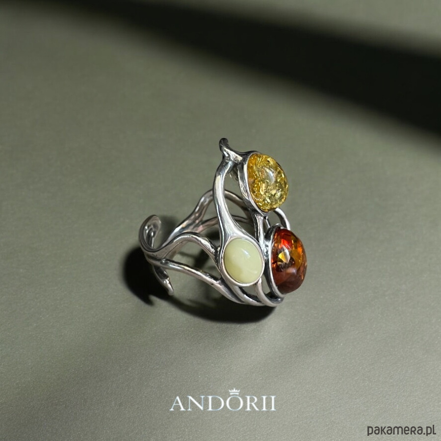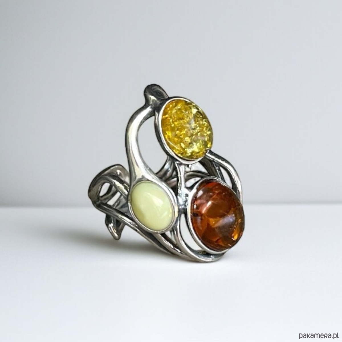 Wyjątkowy pierścionek o artystycznym charakterze, w którym spotykają się trzy odcienie bursztynu – klasyczny koniakowy, miodowy i mleczny. Każdy bursztyn ma owalny kształt i został starannie osadzony w srebrze, tworząc harmonijną i elegancką kompozycję.