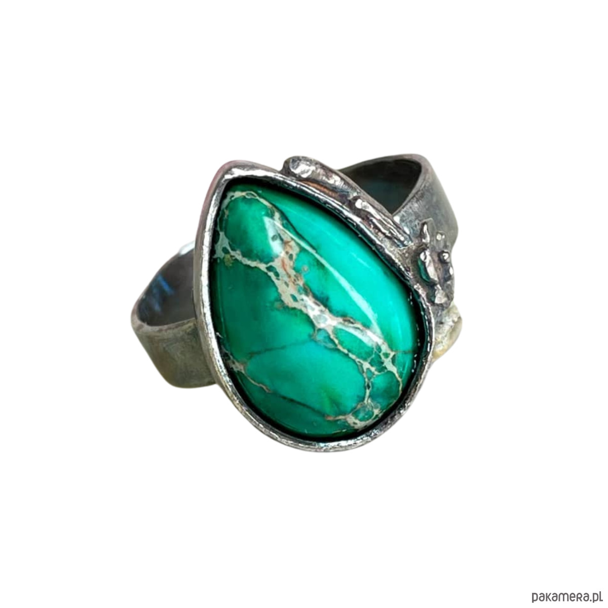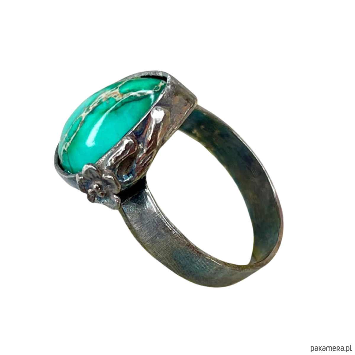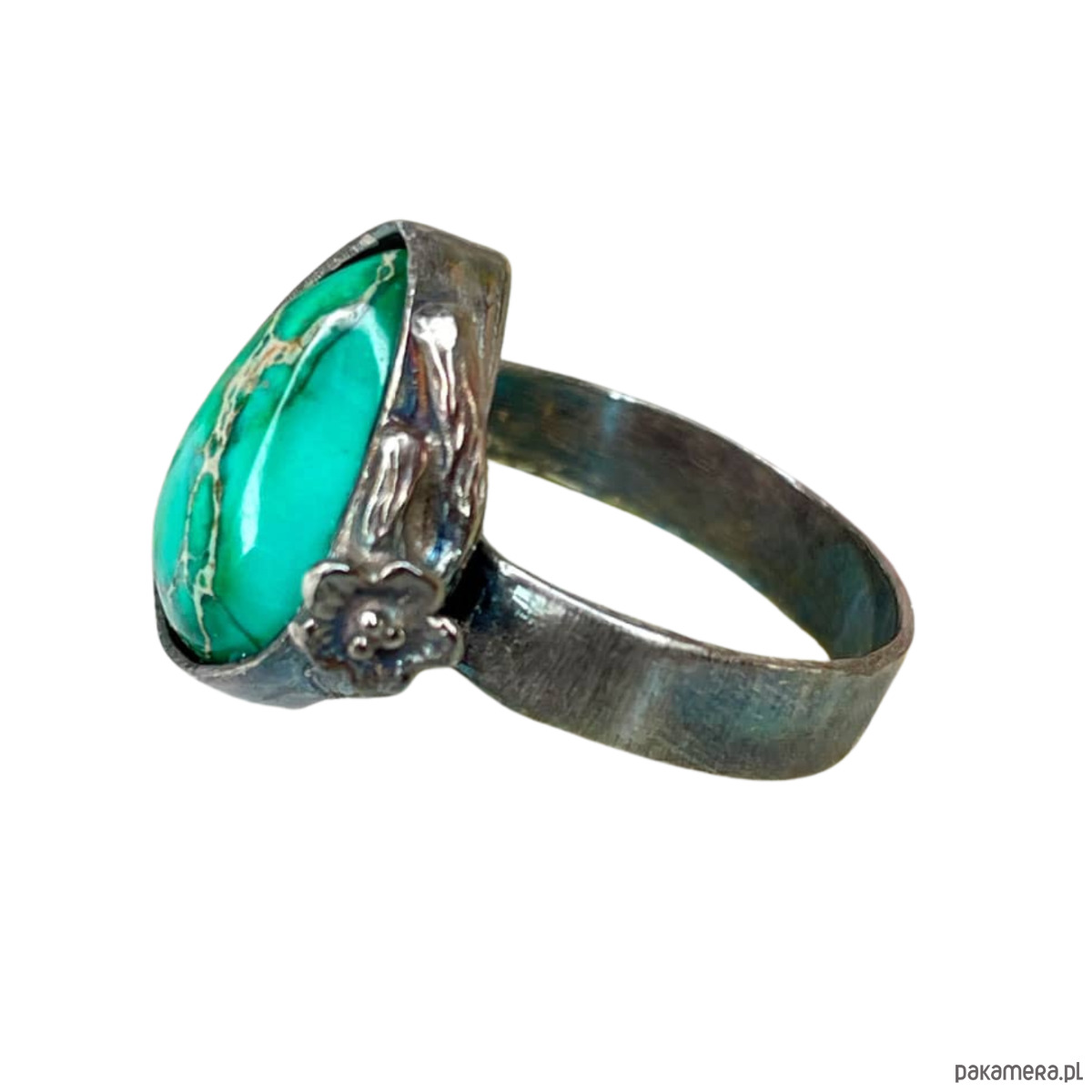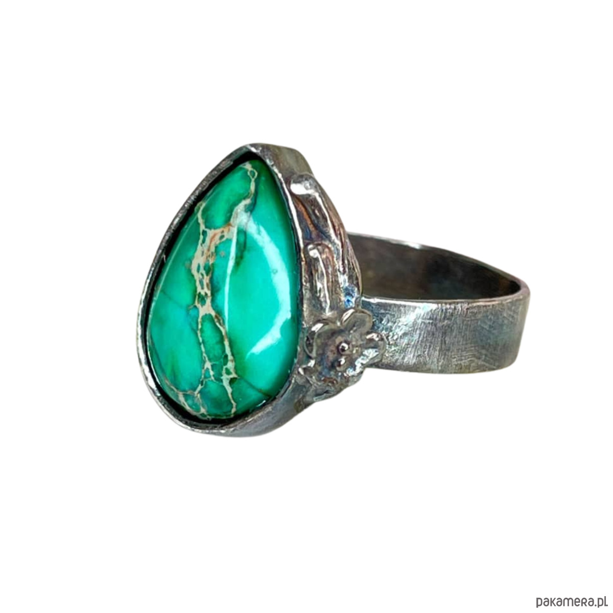 Ten srebrny pierścionek z jaspisem cesarskim to połączenie wyrazistego koloru i subtelnej formy, inspirowanej naturą. Intensywnie turkusowy kamień o charakterystycznym wzorze przywołuje na myśl mapy nieznanych miejsc – dodając biżuterii nuty tajemnicy i świeżości. Osadzony w ręcznie fakturowanym srebrze i ozdobiony kwiatowym akcentem, pierścionek zachwyca lekkością i dopracowaniem detali.