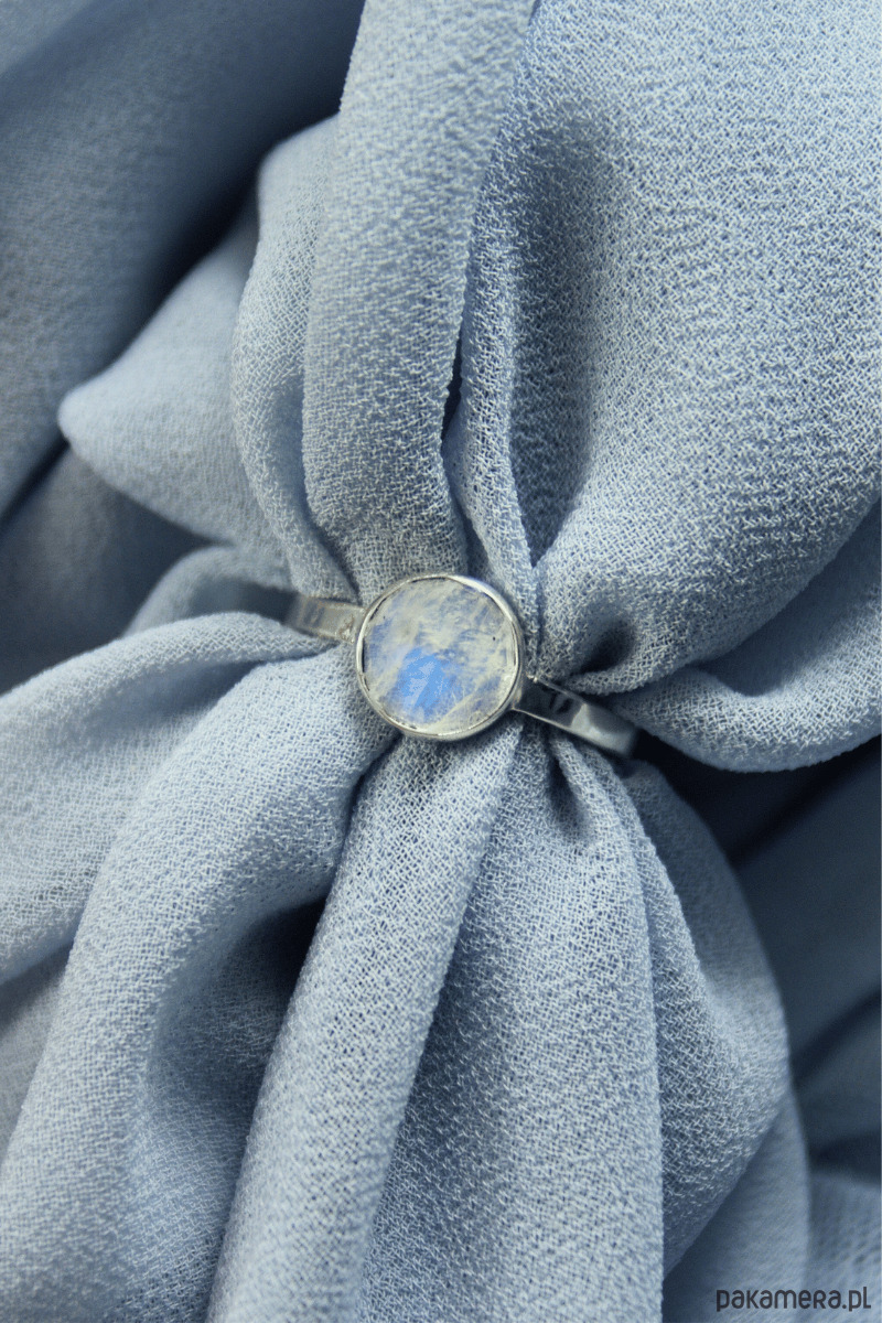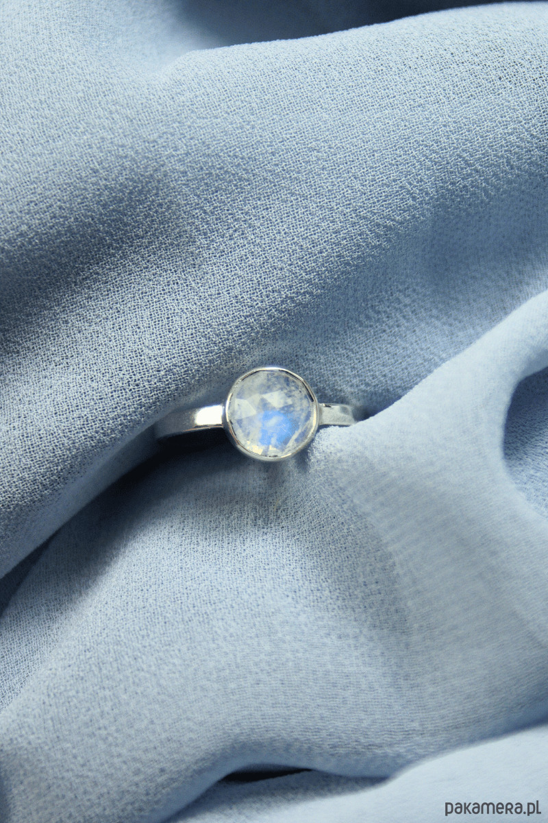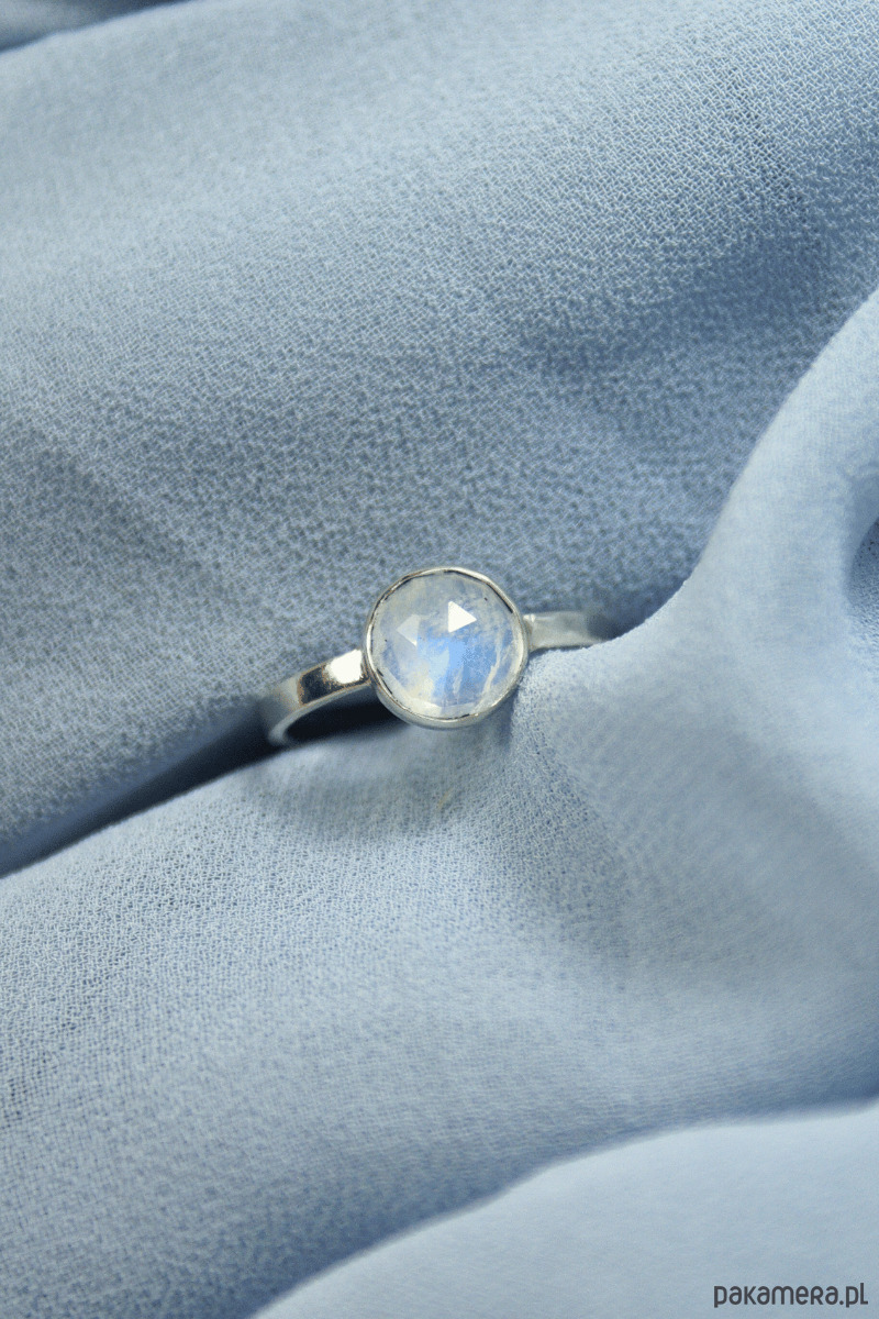 Odkryj biżuterię, która przyciąga wzrok swoją subtelnością. Ten pierścionek z kamieniem księżycowym wykonałam własnoręcznie w mojej małej pracowni Her-Ring. Naturalny kamień w szlifie rozetowym zachwyca biało-szarą barwą, która pod wpływem światła ożywa niebieskim blaskiem.