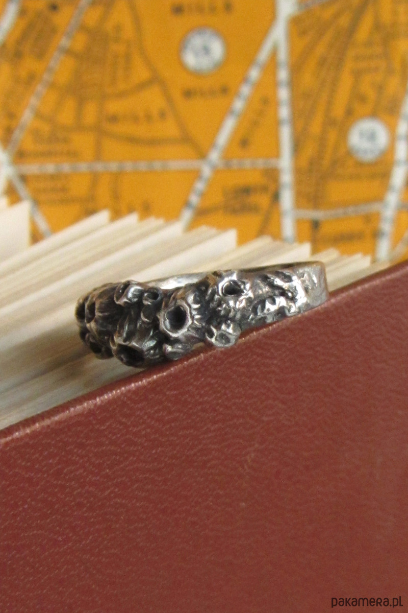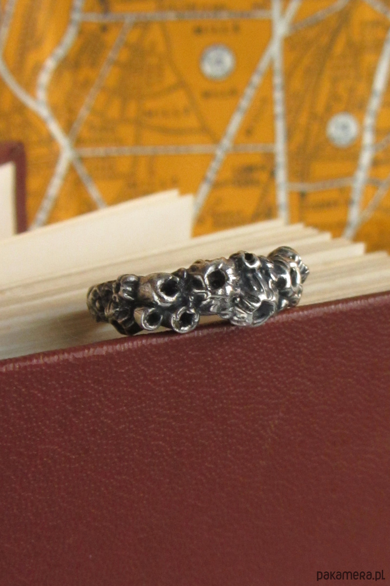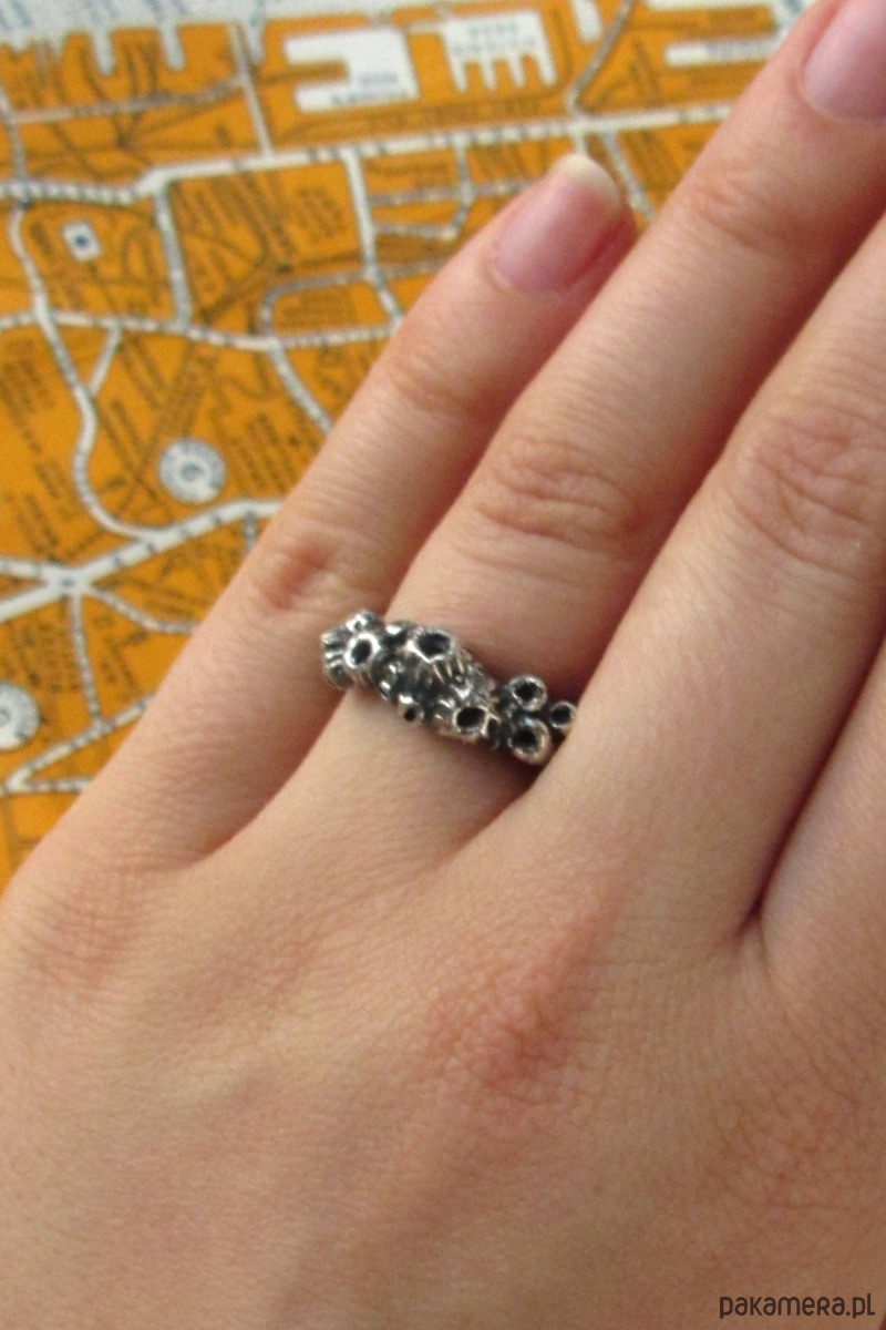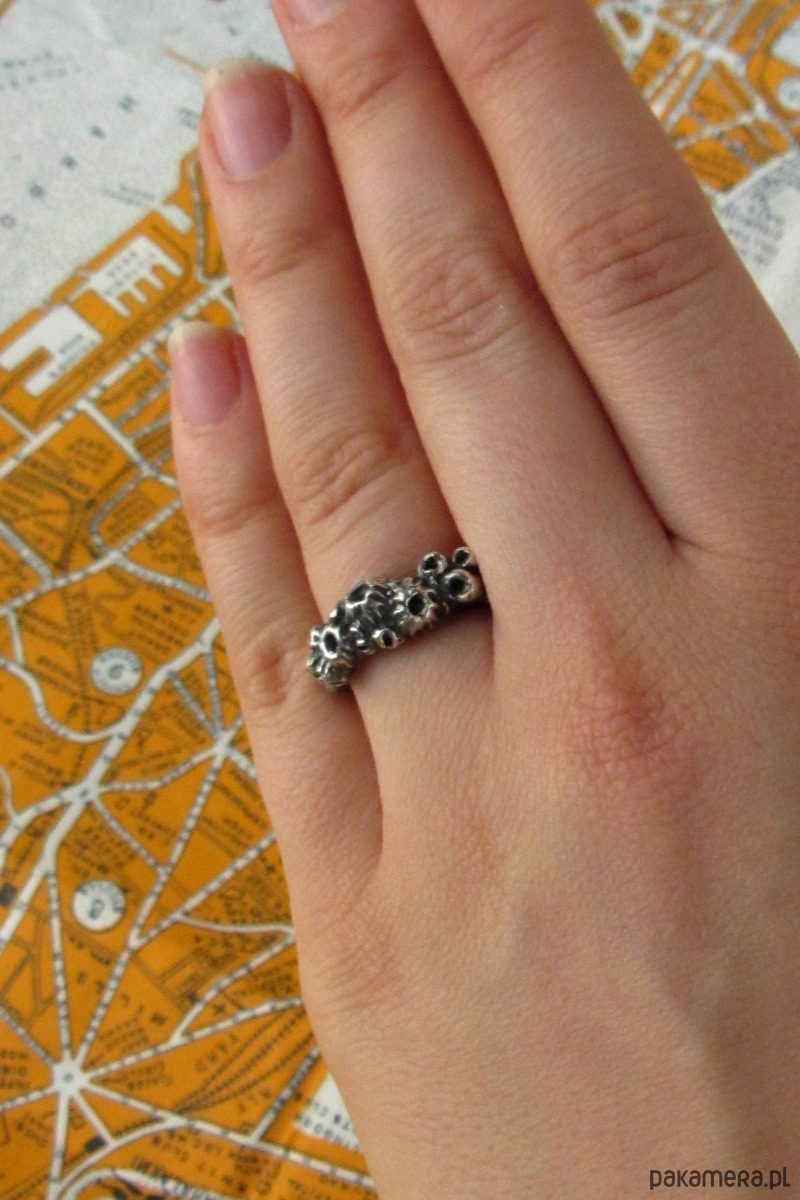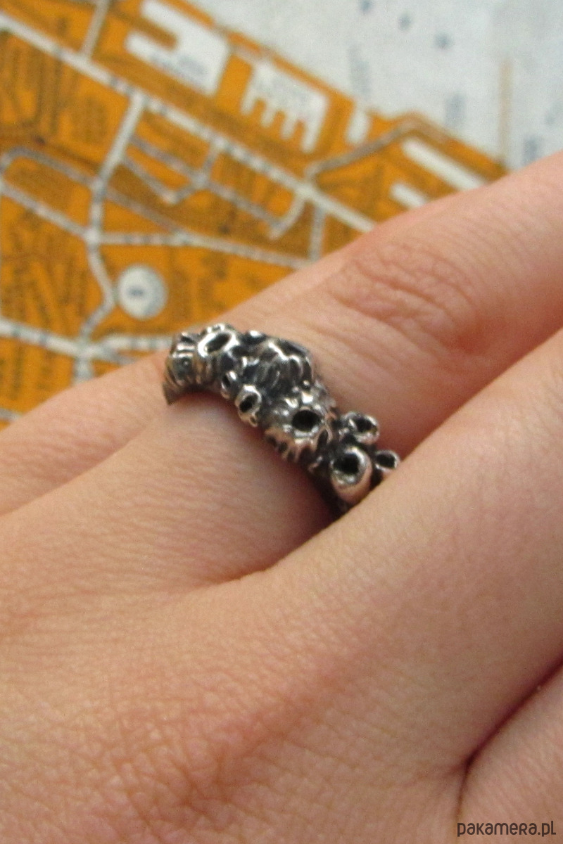Ręcznie rzeźbiony pierścionek przedstawiający pąkle- stworzenia często spotykane na morskich skałach oraz burtach statków. Pierścionek został wykonany w całości ze srebra metodą wosku traconego w krakowskiej pracowni.