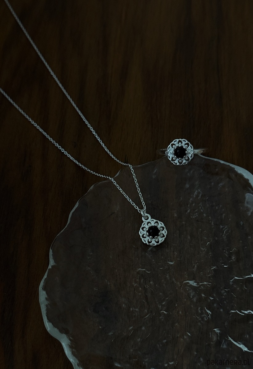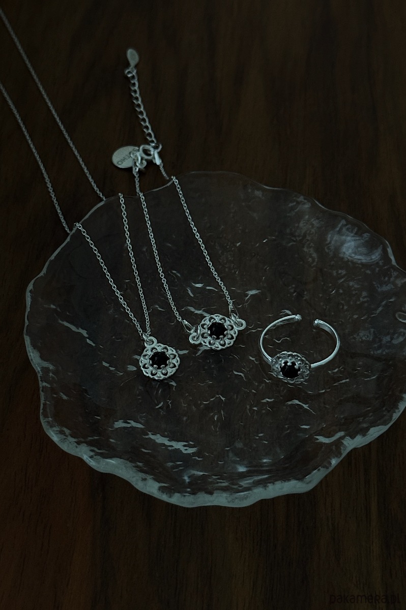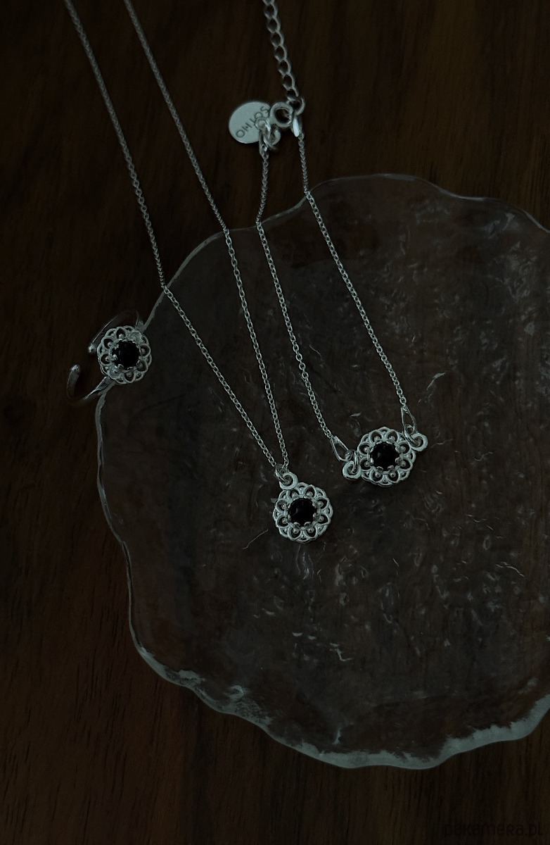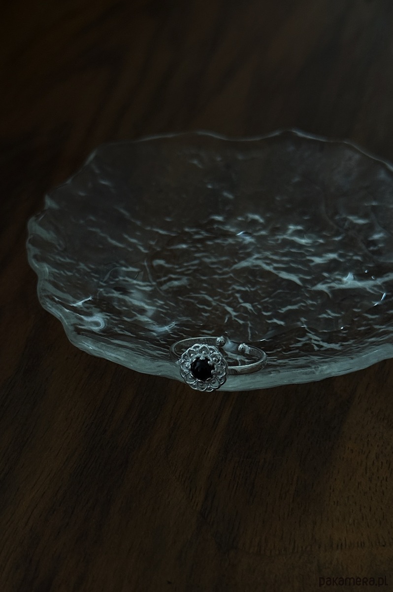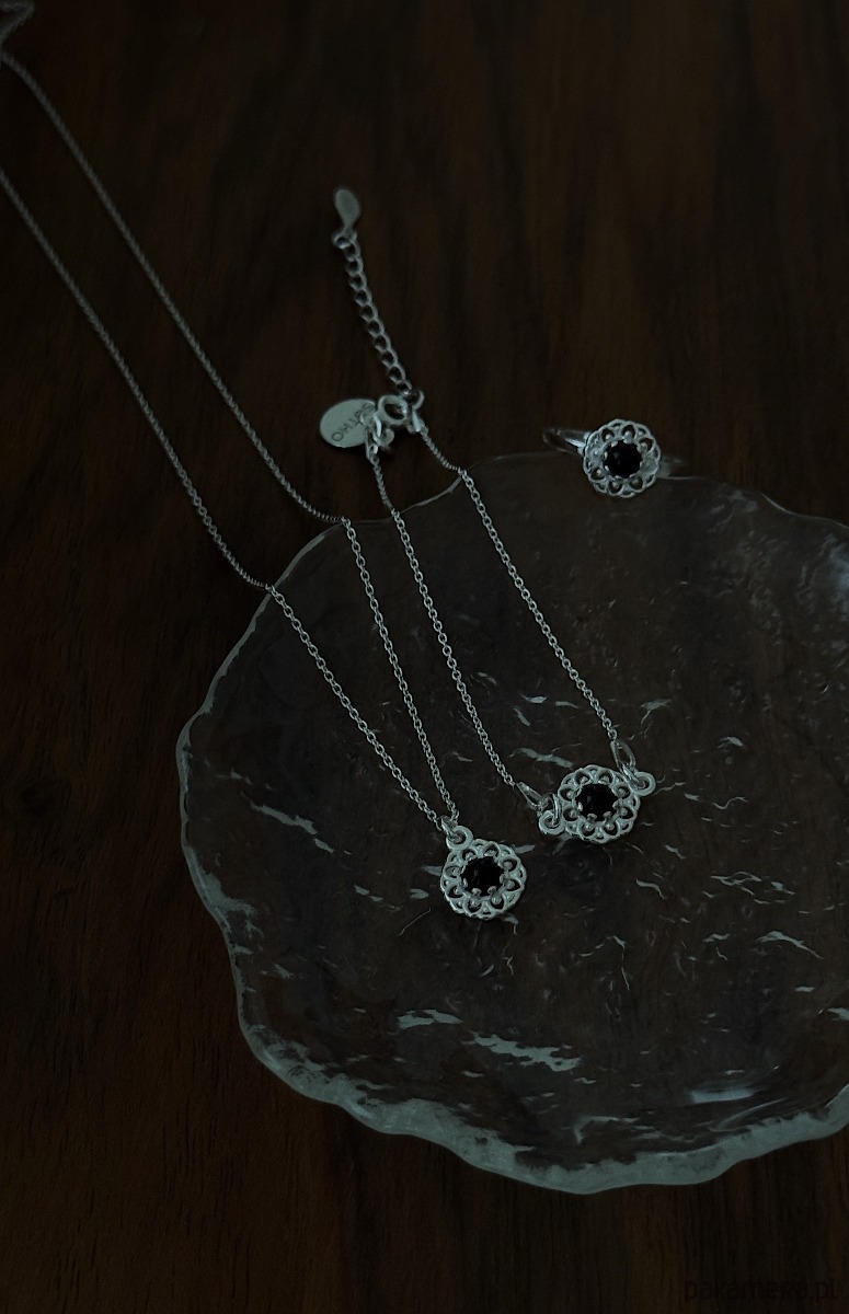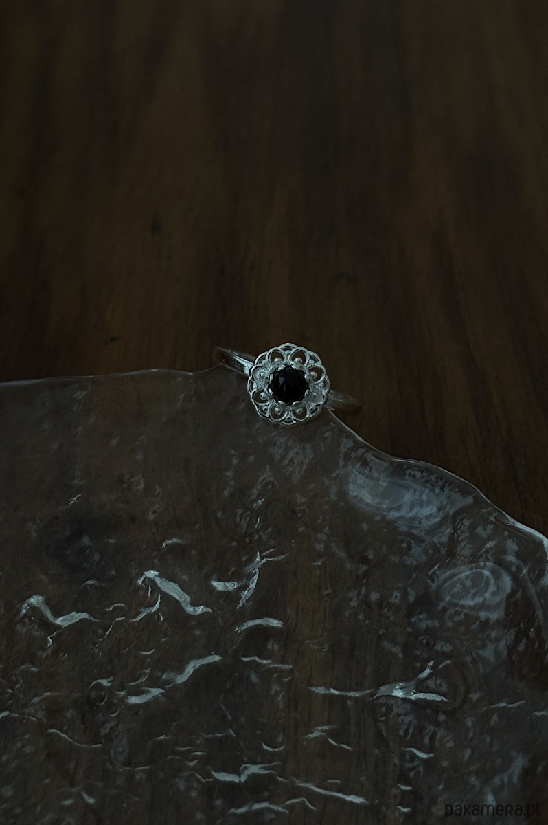 Srebrny pierścionek z rozetą i onyksem wykonany ze srebra 925.