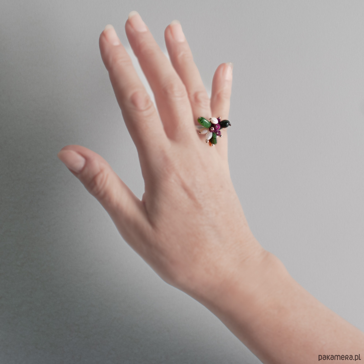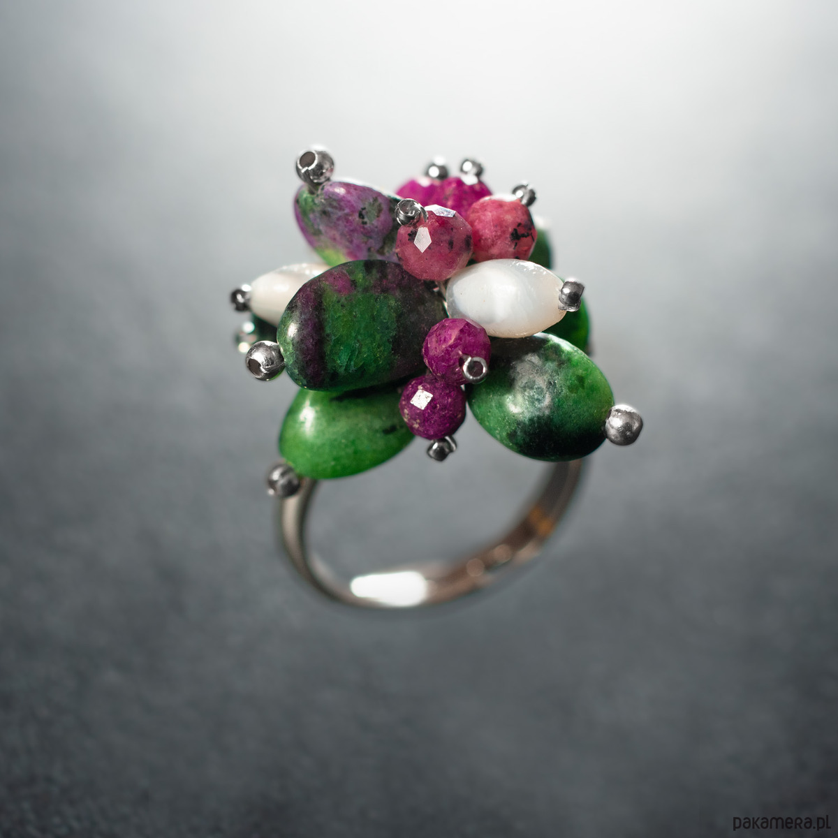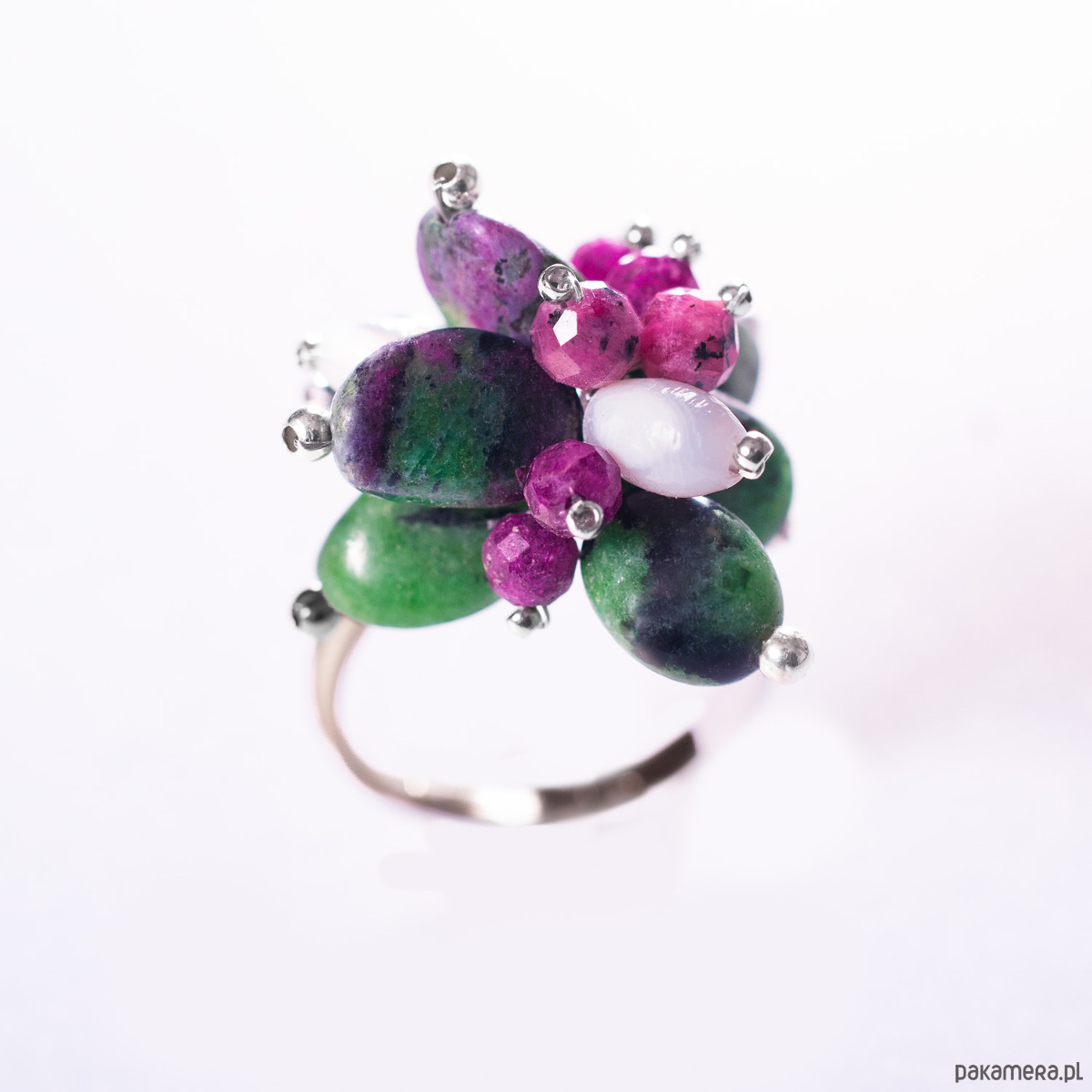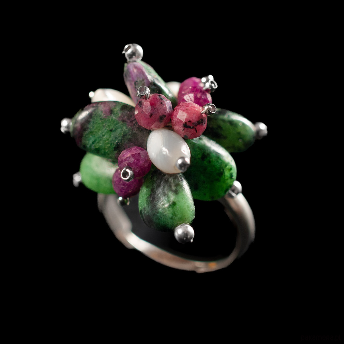 Pierścionek z kolekcji ŁĄKA z fasetowanym rubinem, nieregularnym zoisytem i białą muszlą w kształcie oliwki. Piękne, przenikające się kolory kamieni, od perłowej bieli przez bordo po różne odcienie zieleni. Regulowana obrączka wykonana jest ze srebra 925 (rozmiar od 13 do 17). Pierścionek ze względu na to, iż kamienie naturalne występują w niepowtarzalnych kształtach i odcieniach jest jedyny w swoim rodzaju, unikatowy. Biżuterię wykonujemy ręcznie według własnych projektów w pracowni Anillo. Pierścionek prześlemy w eleganckim pudełeczku.