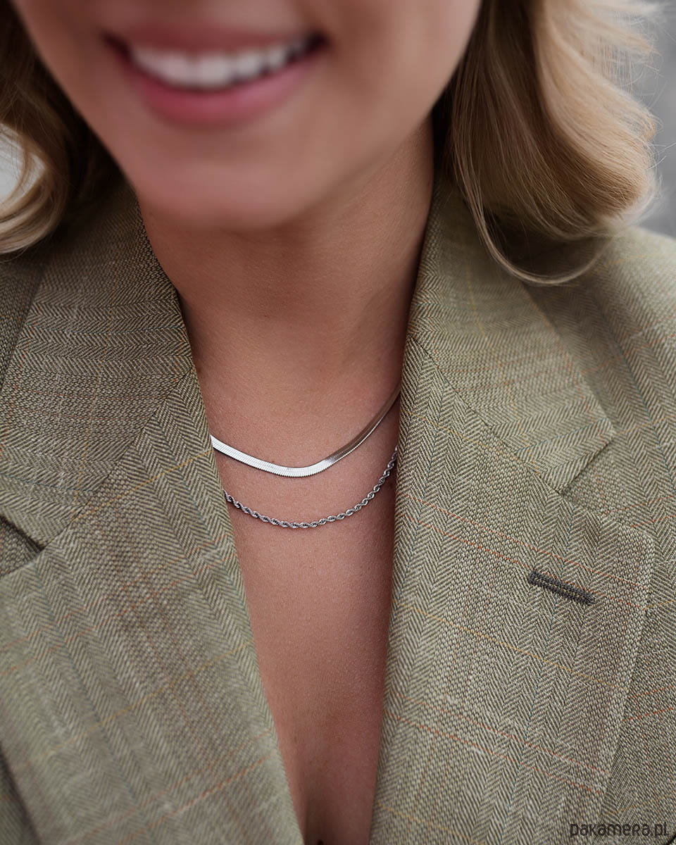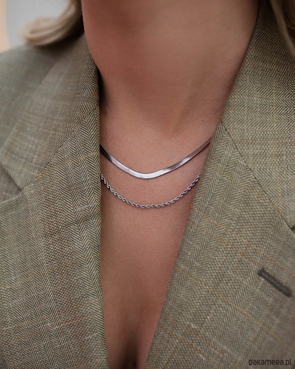 Dwie warstwy, jeden gotowy efekt. Ten srebrny naszyjnik łączy gładki splot żmijki z delikatnym, cienkim łańcuszkiem typu kordel. Dzięki temu wygląda jak perfekcyjnie ułożony zestaw.To idealna opcja, jeśli lubisz modny naszyjnik ze stali chirurgicznej, który wygląda jak stylizacja warstwowa, ale nie plącze się i nie przesuwa.Wykonany ze stali chirurgicznej premium - nie ciemnieje, nie rdzewieje i jest wodoodporny. Możesz nosić go codziennie bez zdejmowania.Założysz go do T-shirtu, koszuli, marynarki czy sukienki. Bez niego stylizacja będzie poprawna. Z nim - dopracowana.Wymiary:Długość: 41/46 cm + 5 cm regulacji Materiał: stal chirurgiczna premiumWodoodporna i hipoalergiczna