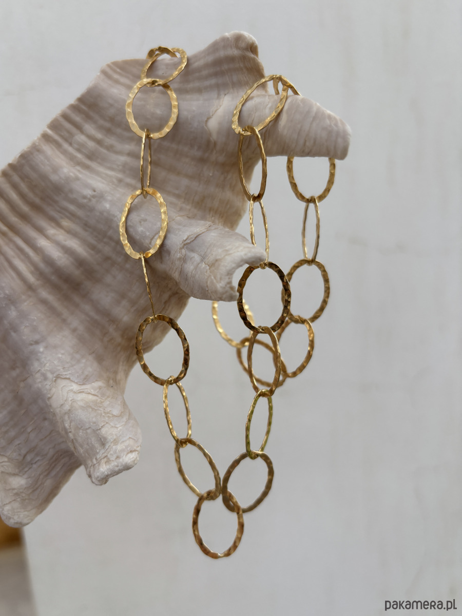 Jeśli szukasz biżuterii, która od razu przyciąga wzrok, a jednocześnie zachowuje minimalistyczny charakter, pozłacany choker z dużych ogniw będzie idealnym wyborem. Młotkowane ogniwa pokryte grubą warstwą złota subtelnie połyskują, dodając całości wyrazistości i elegancji. Nieregularna faktura sprawia, że naszyjnik ma niepowtarzalny charakter.
