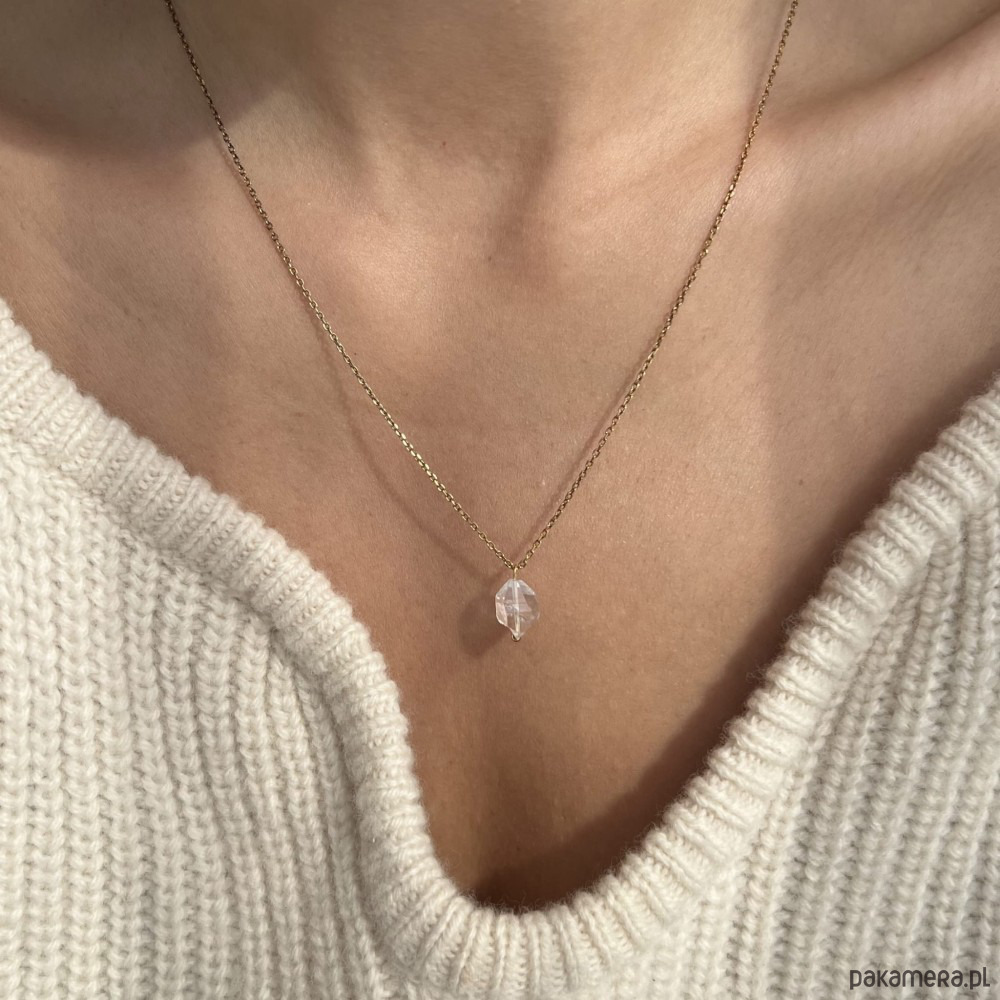 Centralnym punktem naszyjnika jest diament Herkimer – w rzeczywistości naturalny, podwójnie zakończony kwarc górski, znany z przejrzystości i pięknego połysku. To kamień symbolizujący czystość, harmonię i wewnętrzną energię.