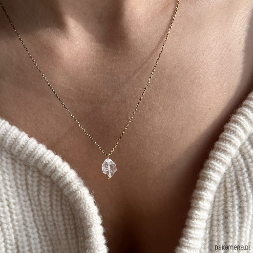 Naszyjnik DIAMENT HERKIMER to wyjątkowa biżuteria dla kobiet ceniących delikatne formy i znaczenie kamieni naturalnych. Wykonany z wysokiej jakości srebra próby 925, został pokryty warstwą 24-karatowego złota, co nadaje mu elegancki, ciepły odcień.