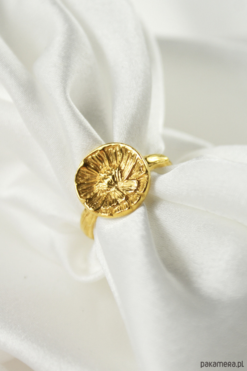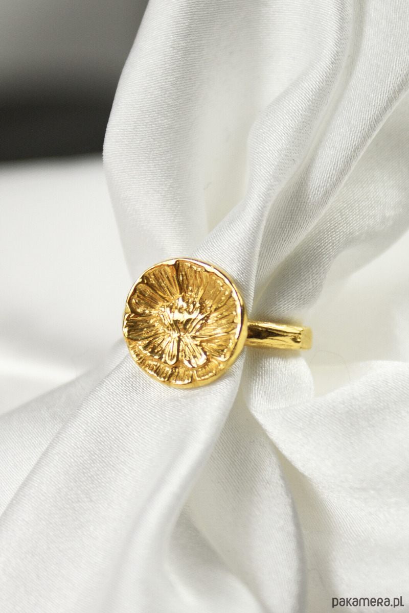 Srebrny pozłacany pierścionek Piwonia Peony Ring, rzeźbiony kwiat