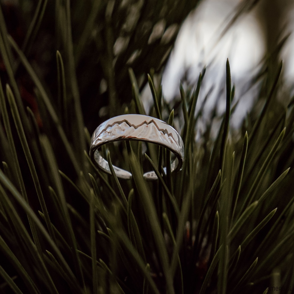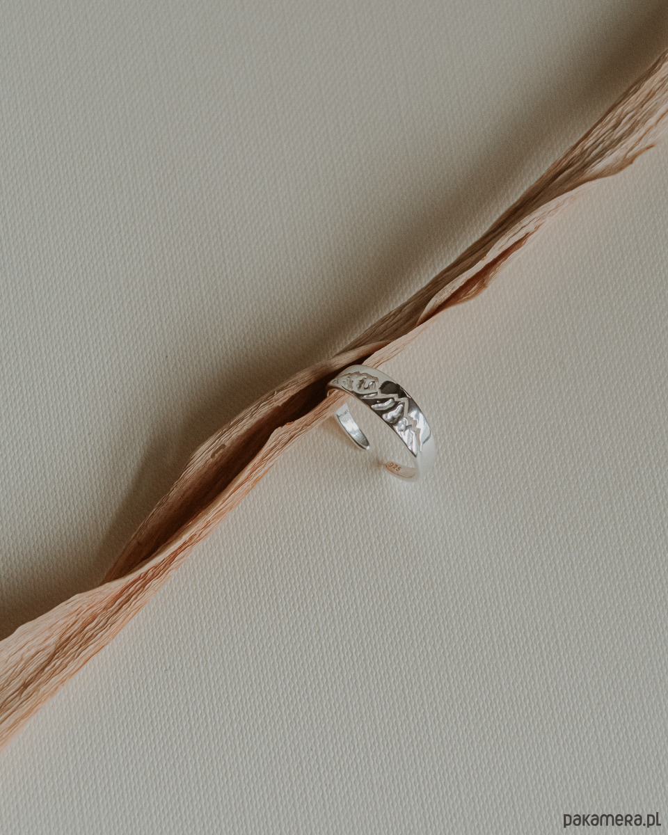 Elegancki pierścionek został wykonany ze srebra (925) i ozdobiony motywem gór. Góry, dzięki nieregularnej formie, odbijają światło w załamaniach, a wycięcie nad szczytami, tworzy unikalny i subtelny wzór.
