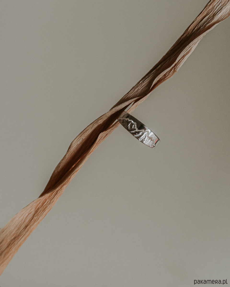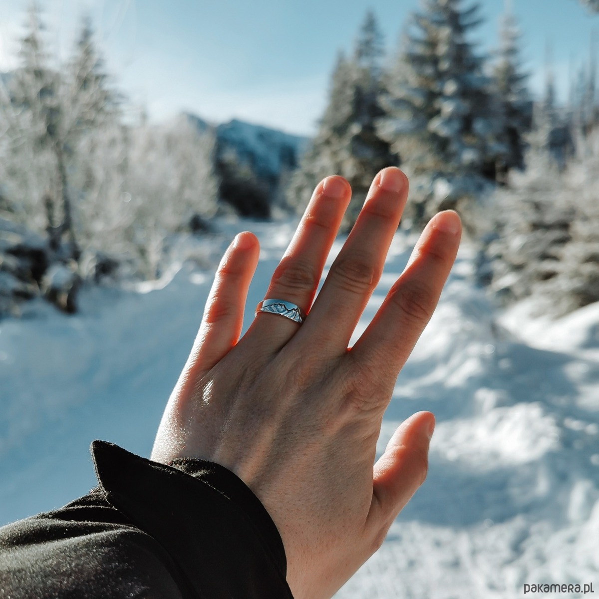 Elegancki pierścionek został wykonany ze srebra (925) i ozdobiony motywem gór. Góry, dzięki nieregularnej formie, odbijają światło w załamaniach, a wycięcie nad szczytami, tworzy unikalny i subtelny wzór.