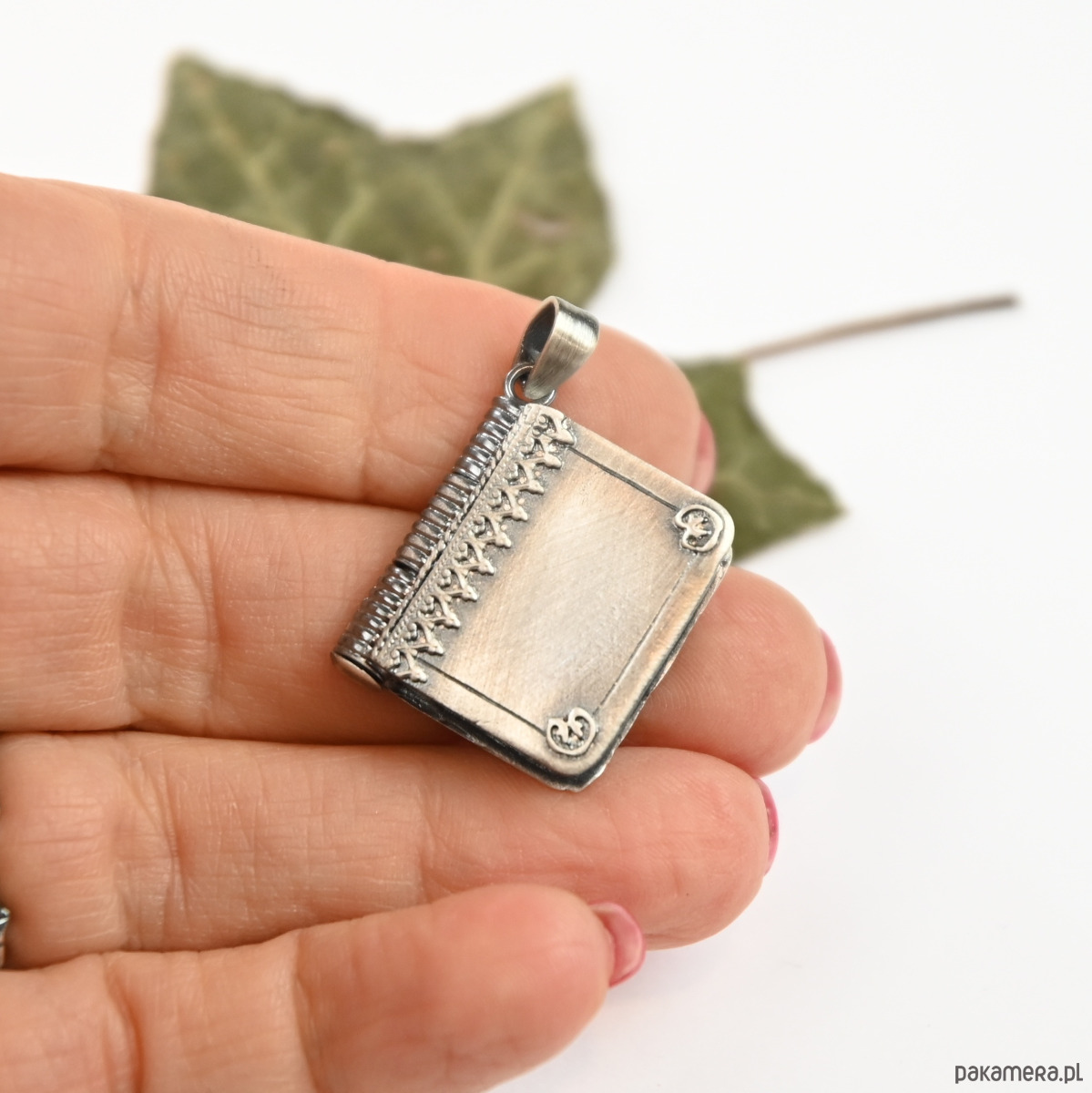 Oksyda grafitowa dodaje srebru głębi i sprawia, że całość zyskuje charakter lekko postarzonego przedmiotu o wyjątkowej duszy. Delikatne detale przypominają oprawę starej księgi, dzięki czemu sekretnik wygląda jak maleńkie dzieło sztuki.