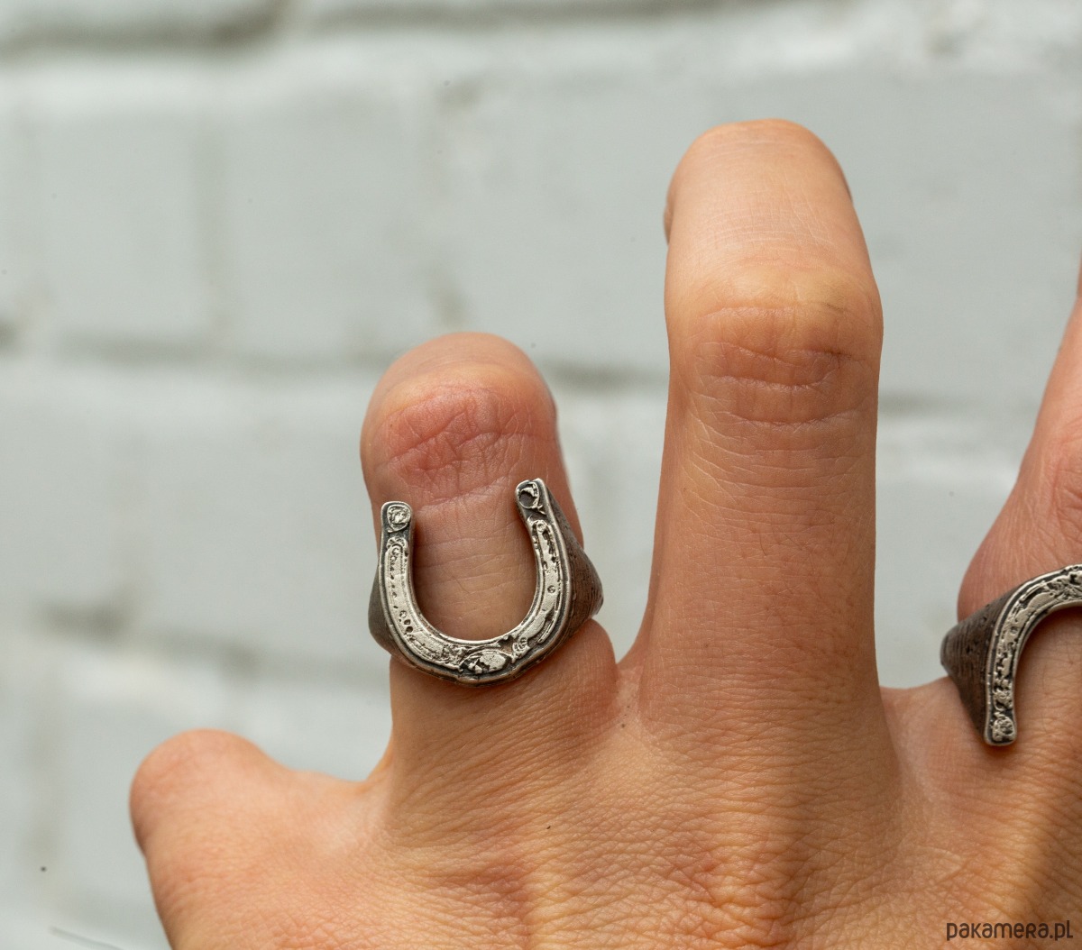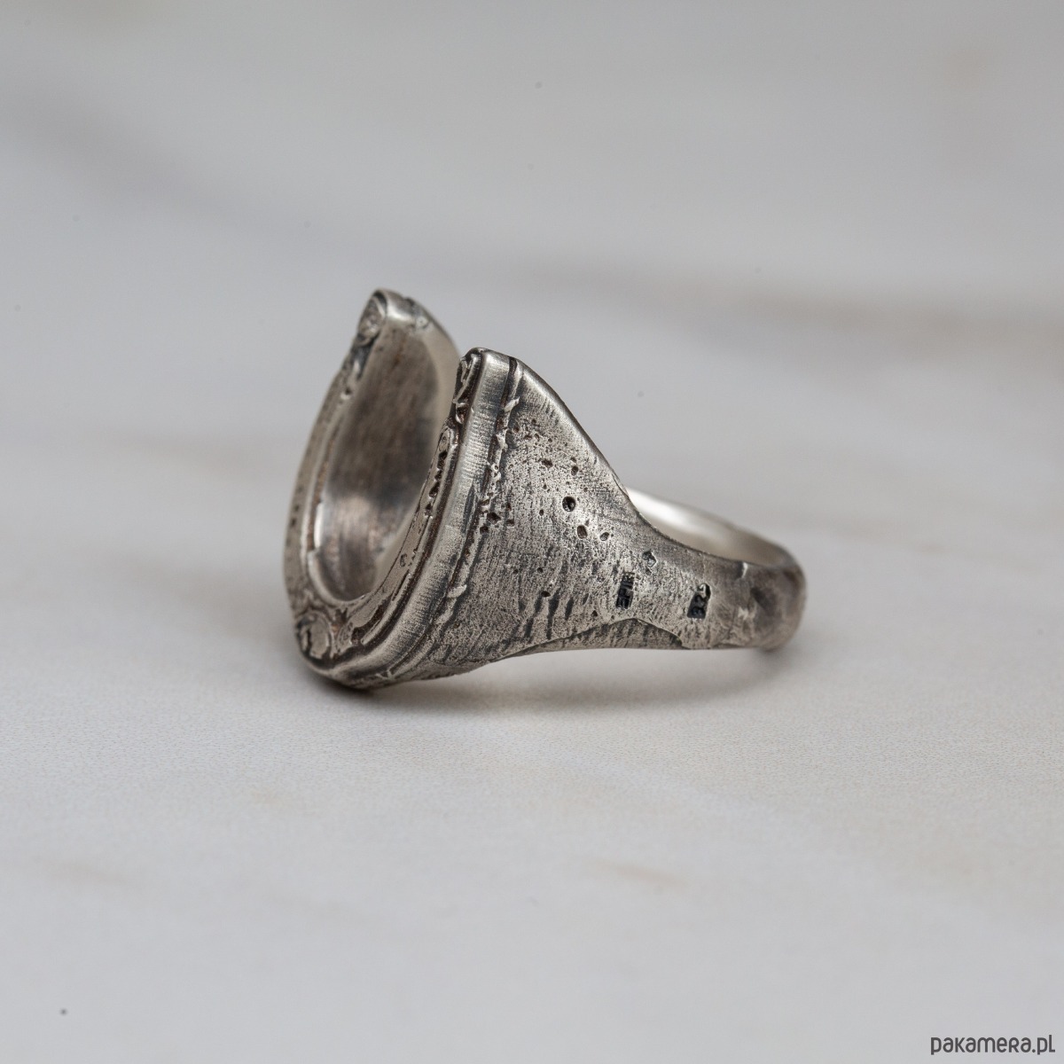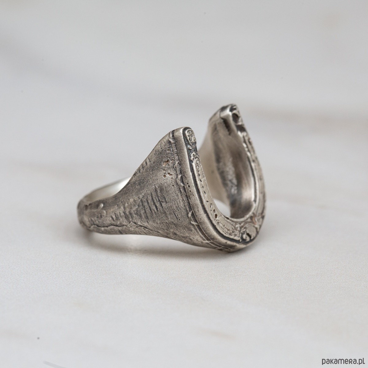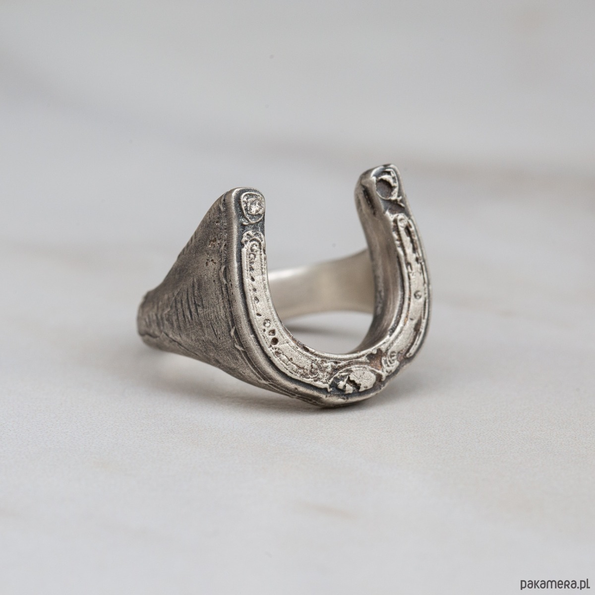 Ręcznie wykonany sygnet ze srebra 925, którego centralnym motywem jest realistycznie odwzorowana podkowa zdjęta prosto z końskiego kopyta — ze śladami zużycia, nierównościami i fakturą nadającą jej wyjątkowo autentyczny charakter. To nie jest gładka, produkcyjna biżuteria, lecz symbol szczęścia w swojej najbardziej pierwotnej, surowej formie.