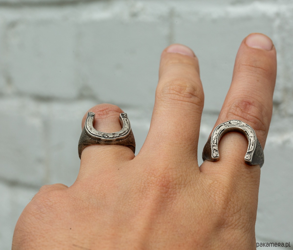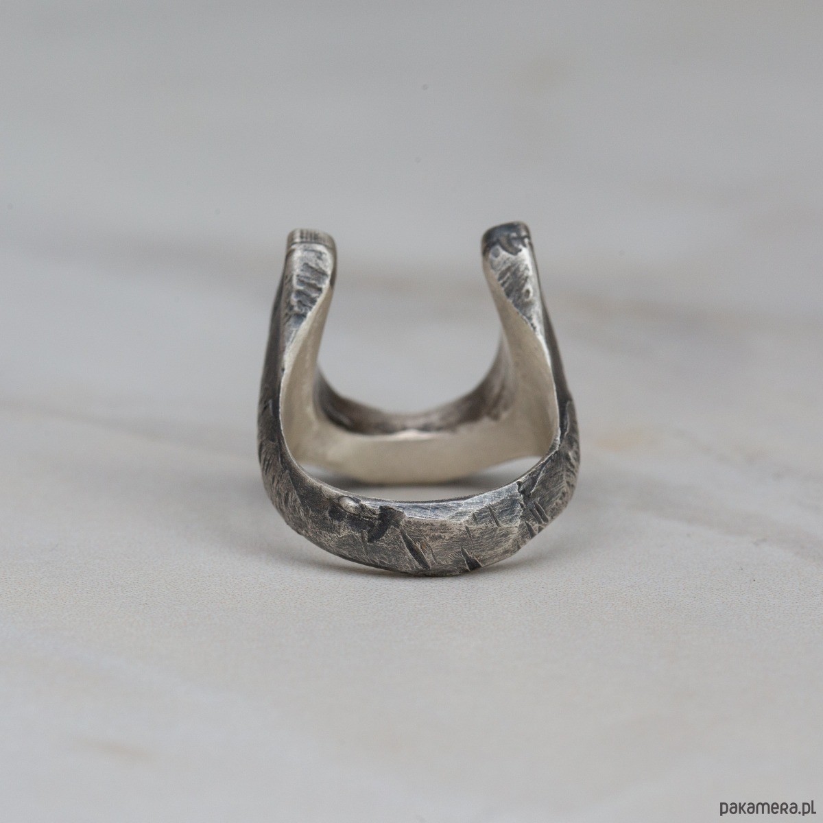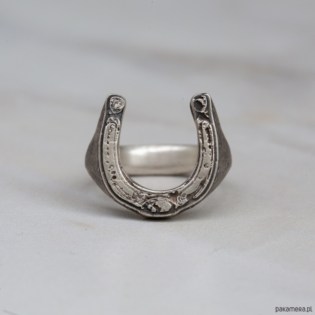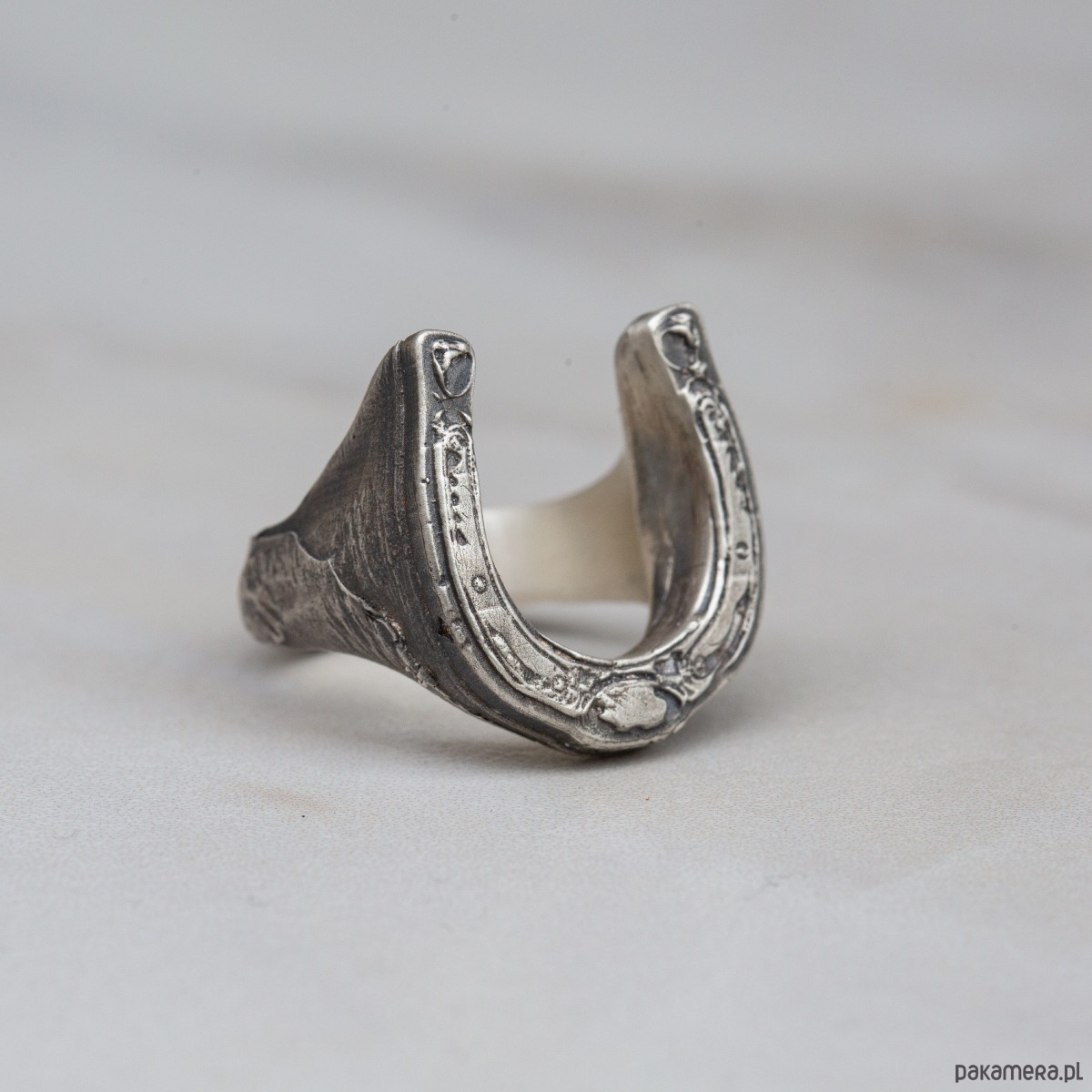Ręcznie wykonany sygnet ze srebra 925, którego centralnym motywem jest realistycznie odwzorowana podkowa zdjęta prosto z końskiego kopyta — ze śladami zużycia, nierównościami i fakturą nadającą jej wyjątkowo autentyczny charakter. To nie jest gładka, produkcyjna biżuteria, lecz symbol szczęścia w swojej najbardziej pierwotnej, surowej formie.