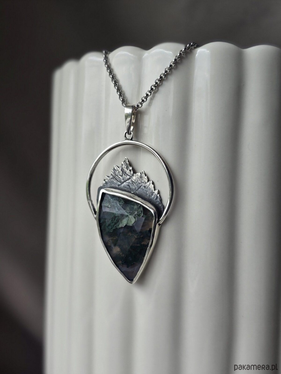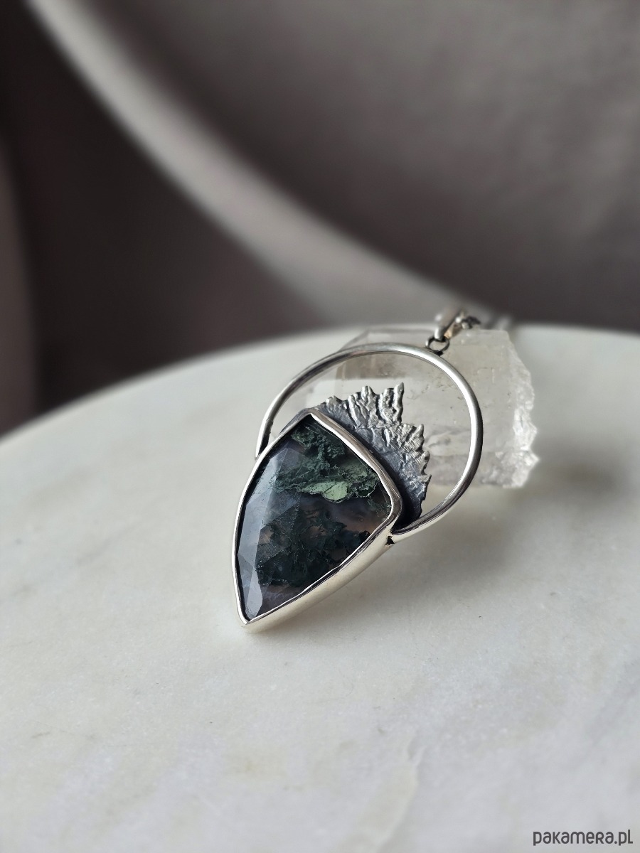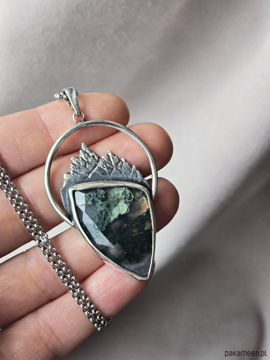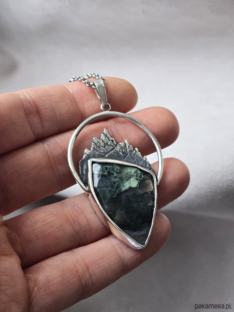 Srebrny wisior z górami i agatem mszystym