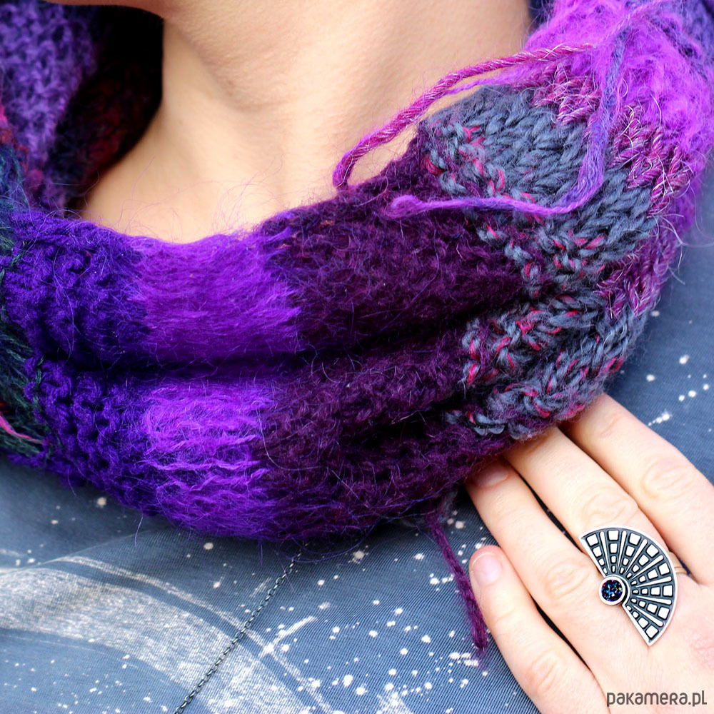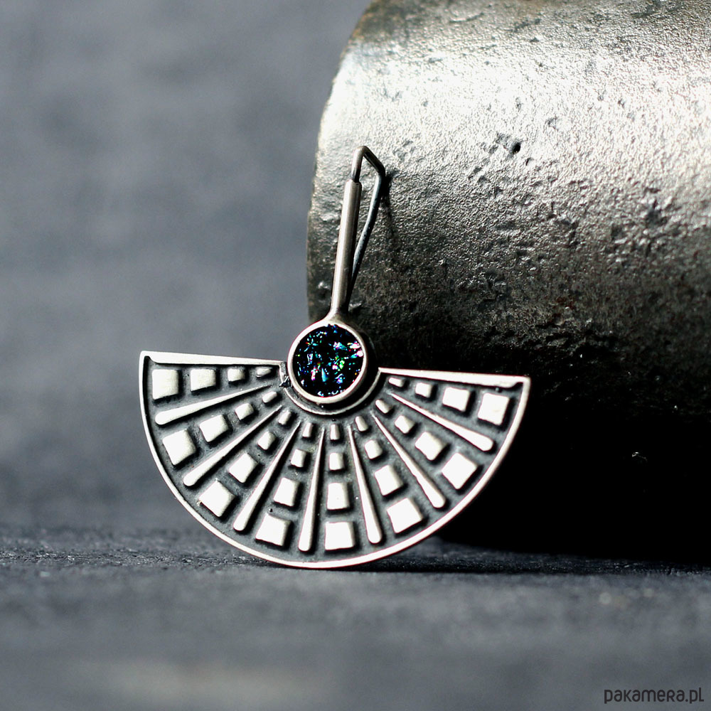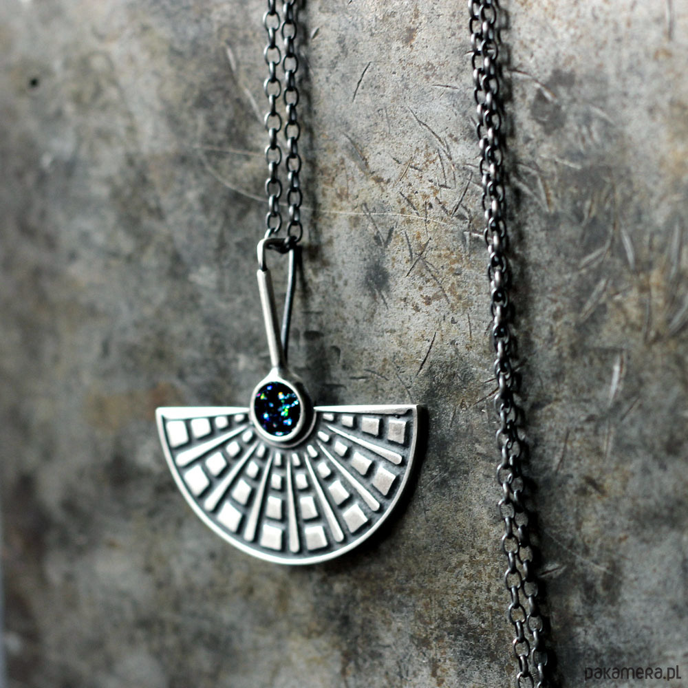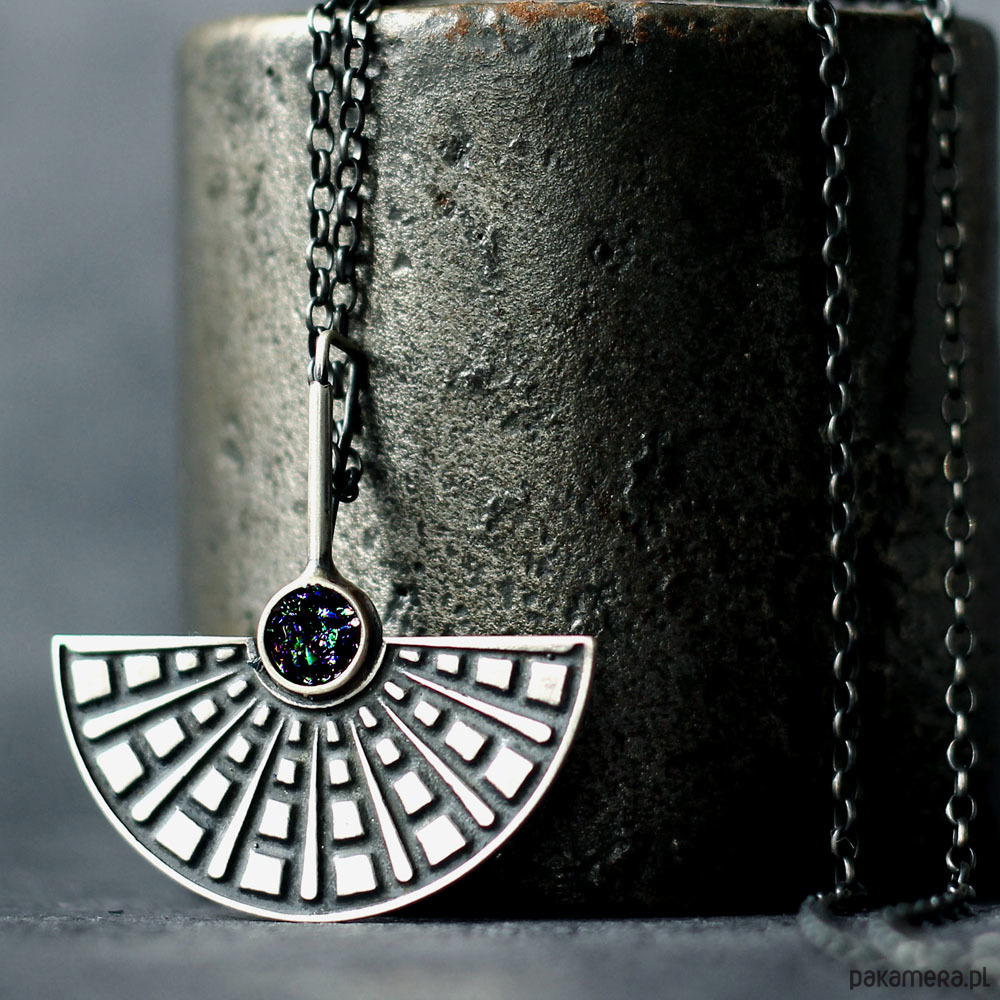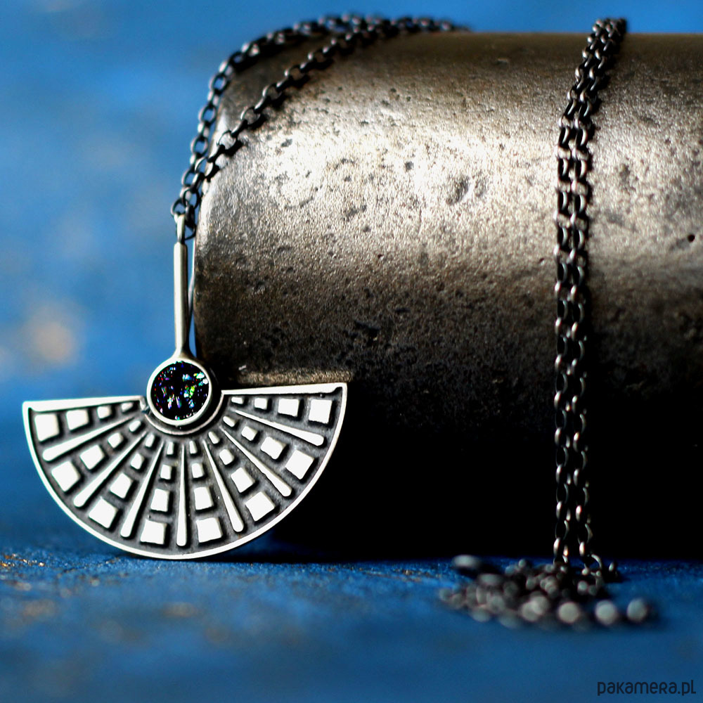 Piękna zawieszka inspirowana wzornictwem starożytnego Egiptu. Wykonana z oksydowanego srebra próby 925. Oczko pierścionka wypełniają druzy karborundu, minerału mieniącego się fantastyczną feerią barw.