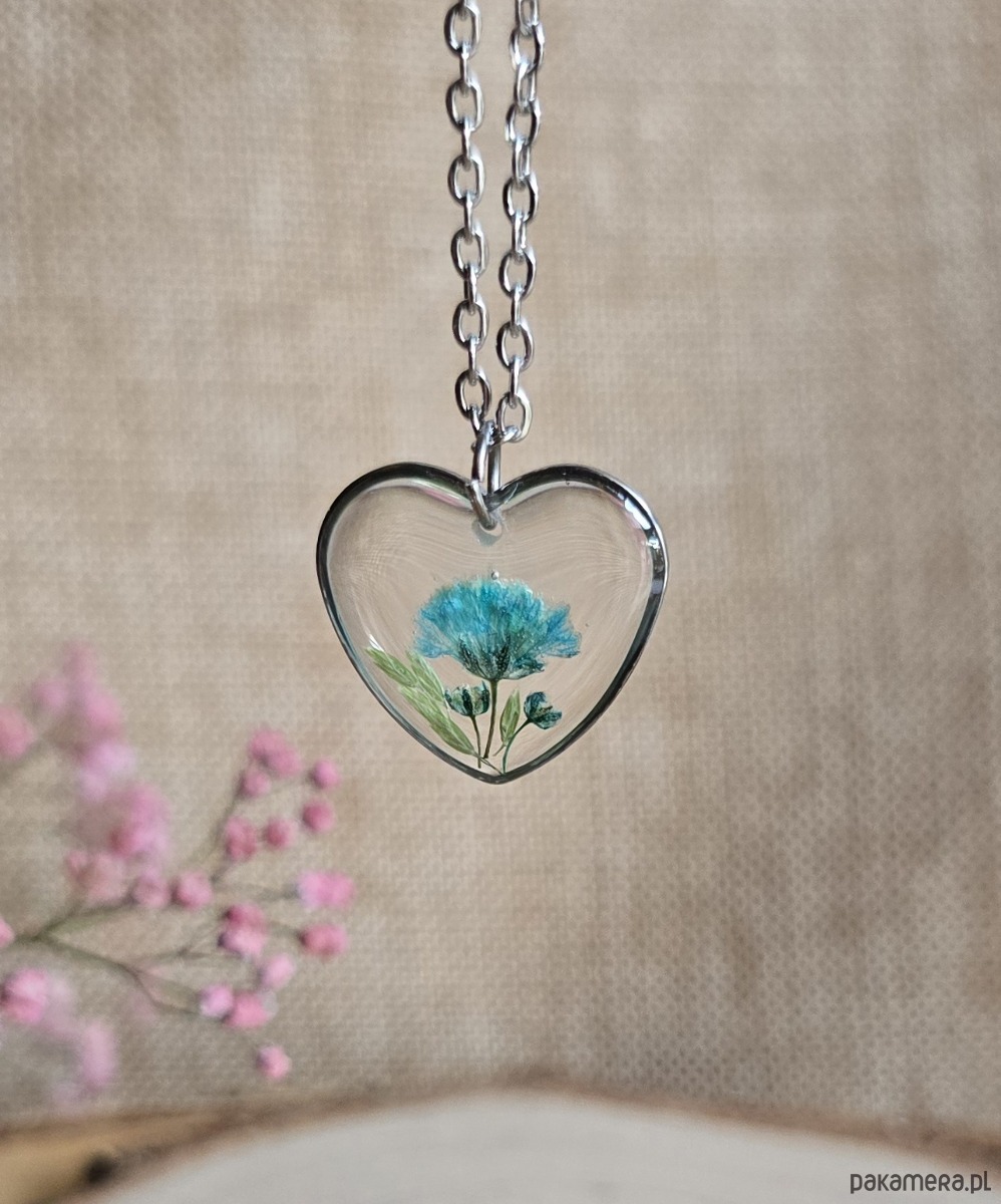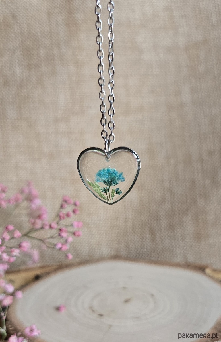 Oferuję Państwu unikalną biżuterię. Zawieszka jest wykonana z suszonych kwiatów i żywicy epoksydowej. Biżuteria jest wspaniałym i oryginalnym prezentem na lata.