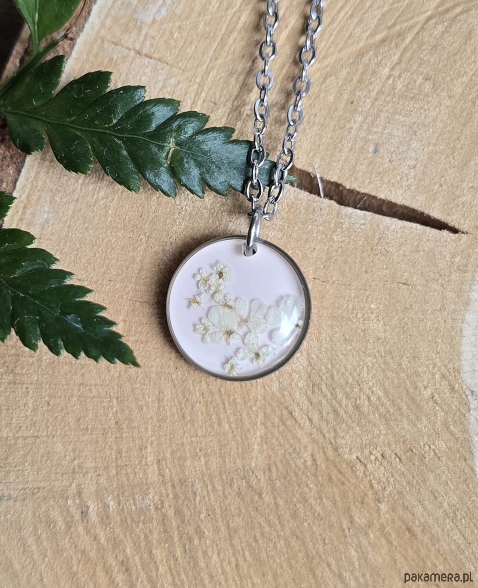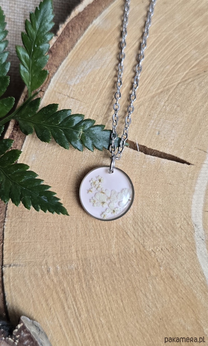 Oferuję Państwu unikalną biżuterię. Zawieszka jest wykonana z suszonych kwiatów i żywicy epoksydowej. Biżuteria jest wspaniałym i oryginalnym prezentem na lata.