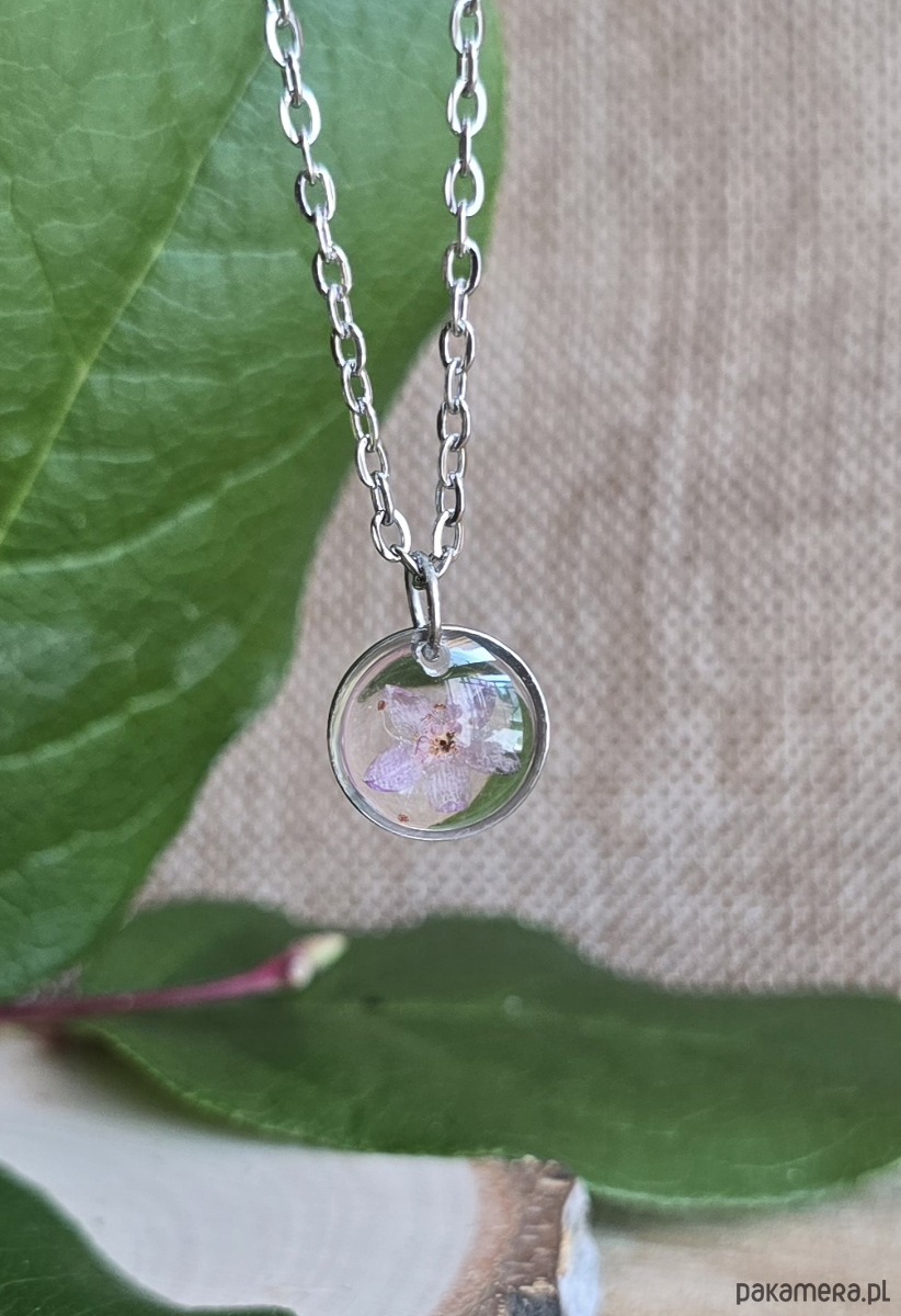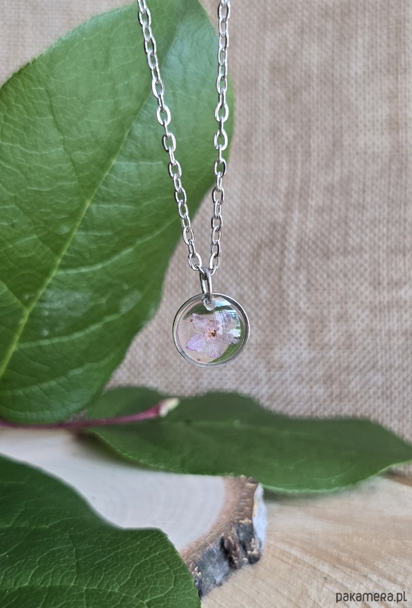 Oferuję Państwu unikalną biżuterię. Zawieszka jest wykonana z suszonych kwiatów i żywicy epoksydowej. Biżuteria jest wspaniałym i oryginalnym prezentem na lata.