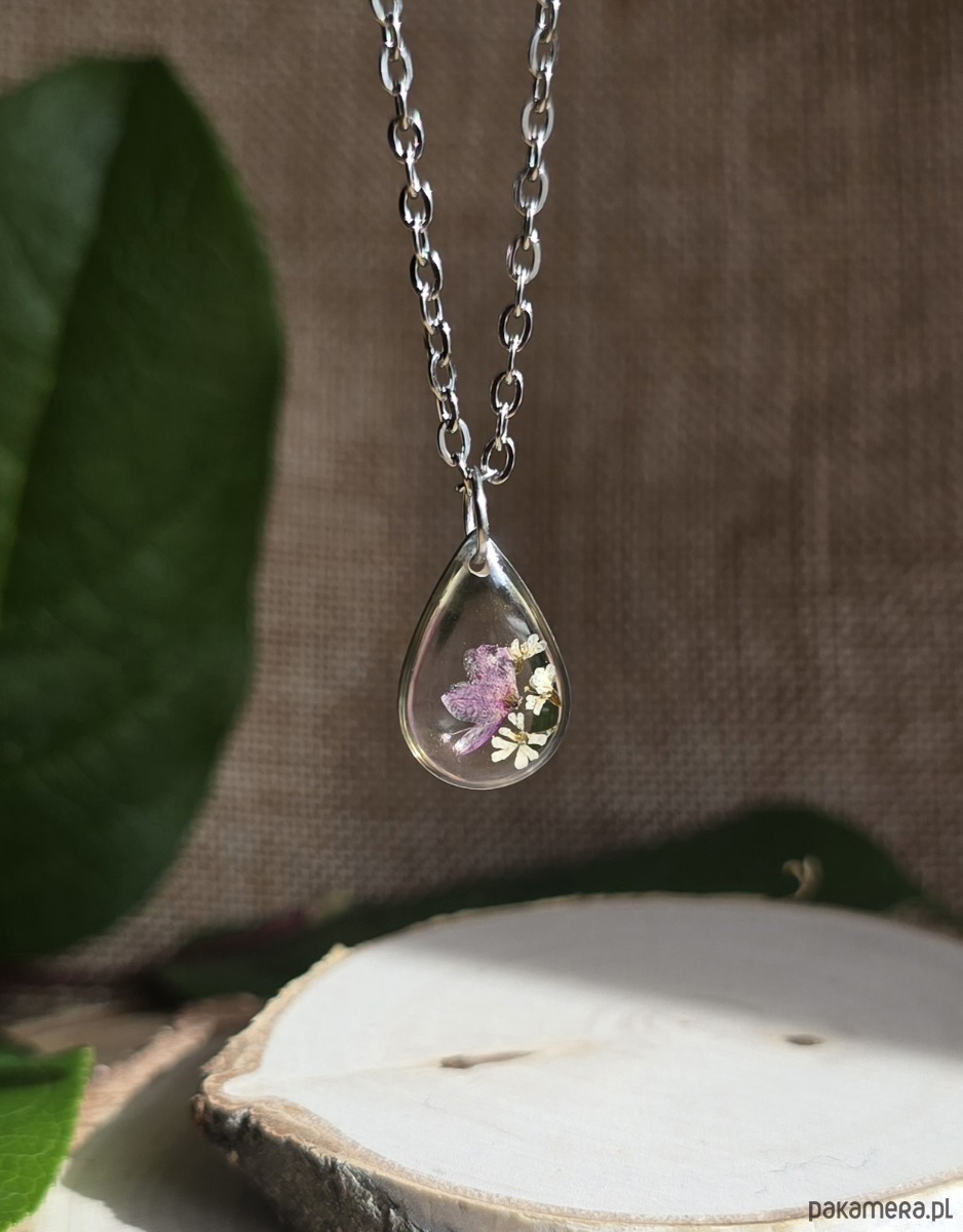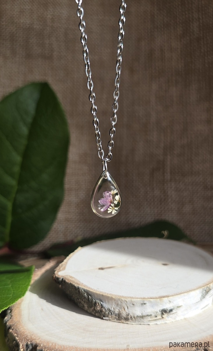 Oferuję Państwu unikalną biżuterię. Zawieszka jest wykonana z suszonych kwiatów i żywicy epoksydowej. Biżuteria jest wspaniałym i oryginalnym prezentem na lata.