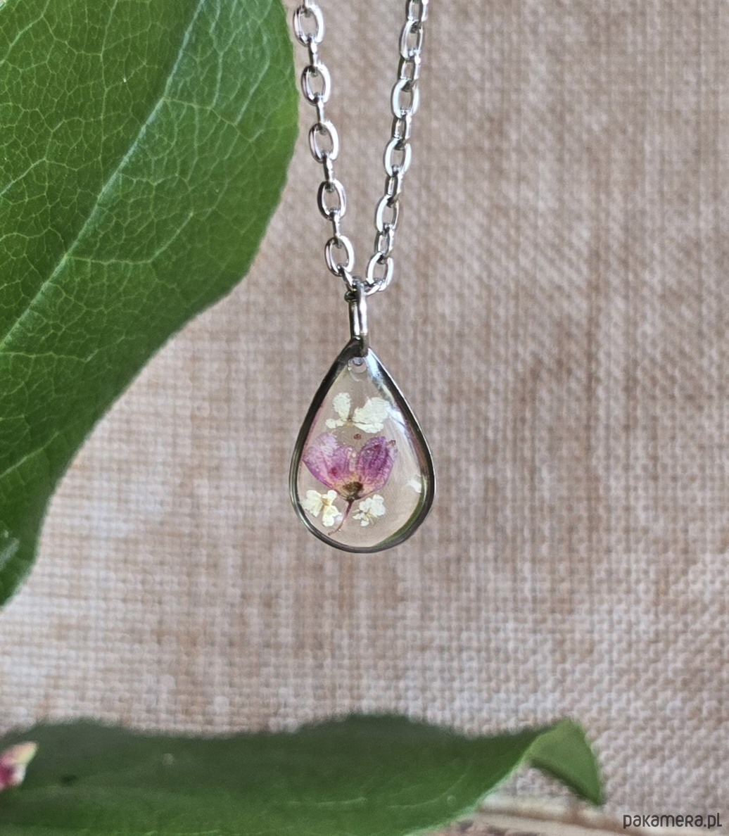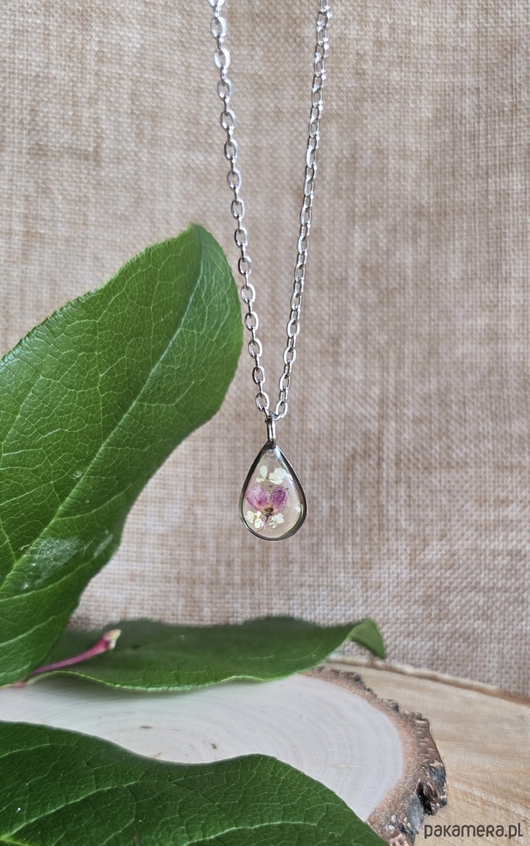 Oferuję Państwu unikalną biżuterię. Zawieszka jest wykonana z suszonych kwiatów i żywicy epoksydowej. Biżuteria jest wspaniałym i oryginalnym prezentem na lata.