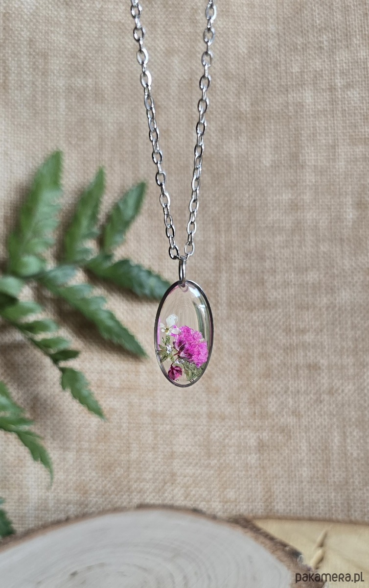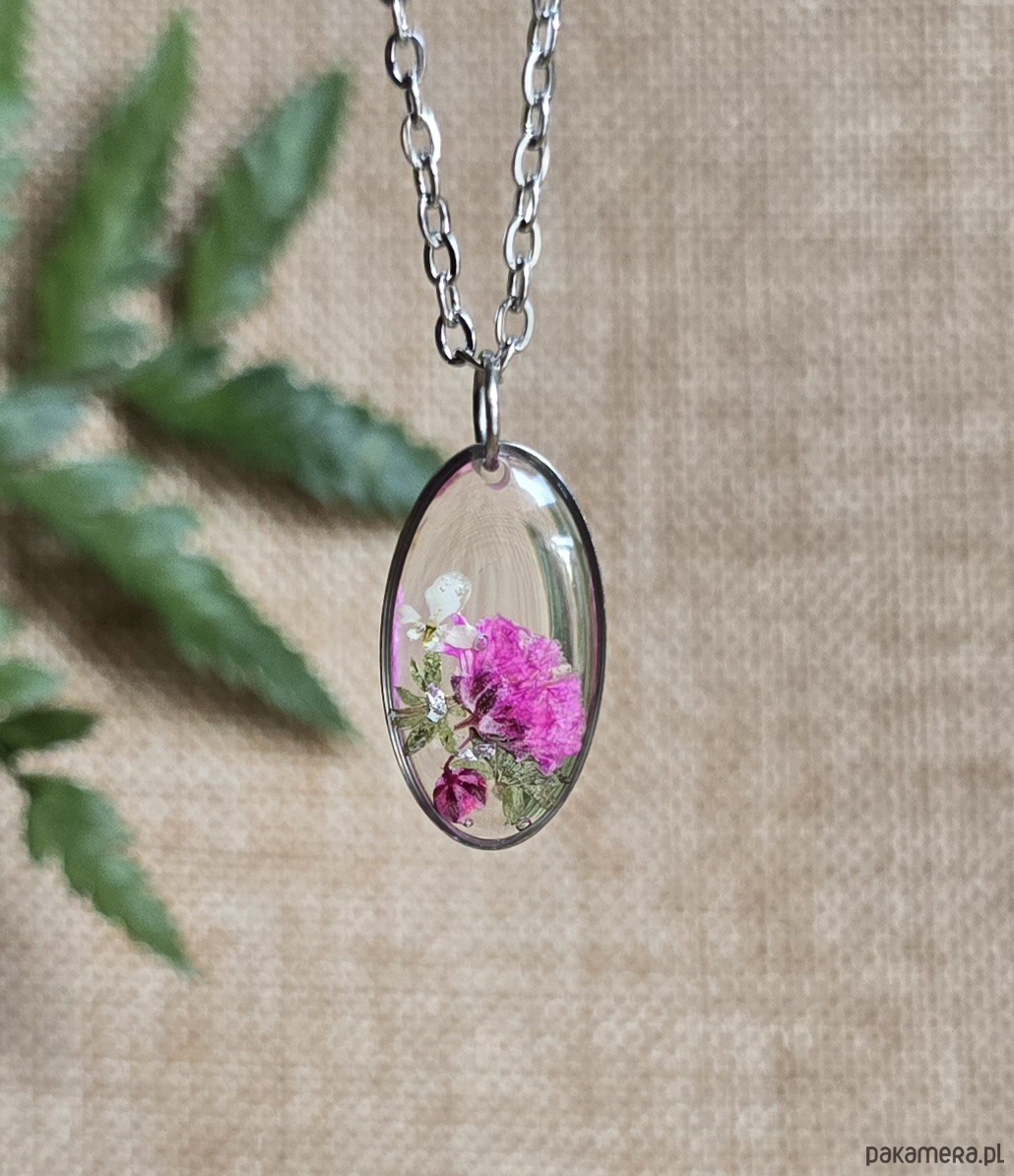 Oferuję Państwu unikalną biżuterię. Zawieszka jest wykonana z suszonych kwiatów i żywicy epoksydowej. Biżuteria jest wspaniałym i oryginalnym prezentem na lata.