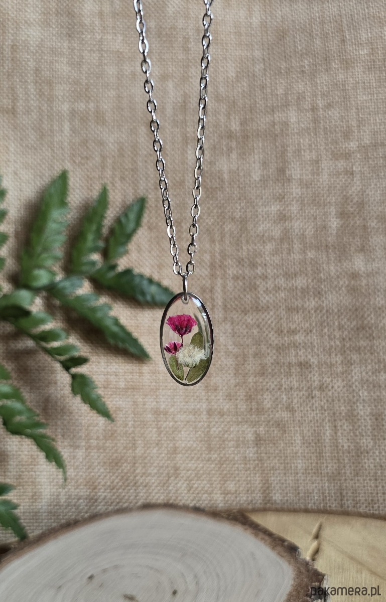 Oferuję Państwu unikalną biżuterię. Zawieszka jest wykonana z suszonych kwiatów i żywicy epoksydowej. Biżuteria jest wspaniałym i oryginalnym prezentem na lata.