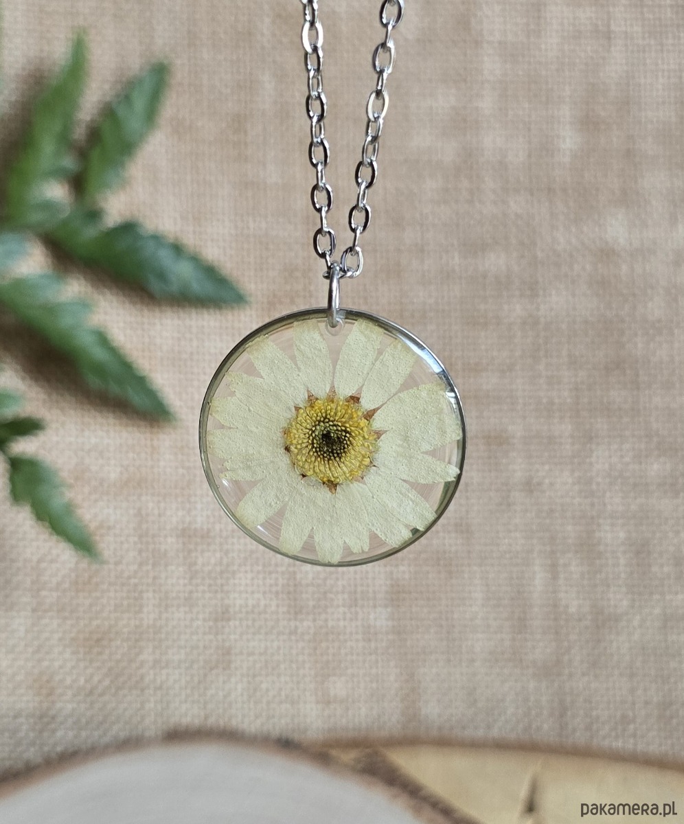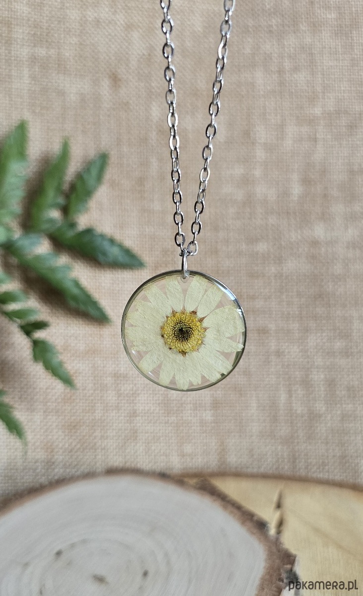 Oferuję Państwu unikalną biżuterię. Zawieszka jest wykonana z suszonych kwiatów i żywicy epoksydowej. Biżuteria jest wspaniałym i oryginalnym prezentem na lata.