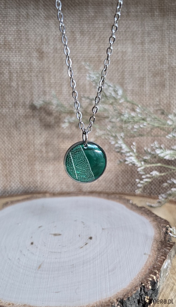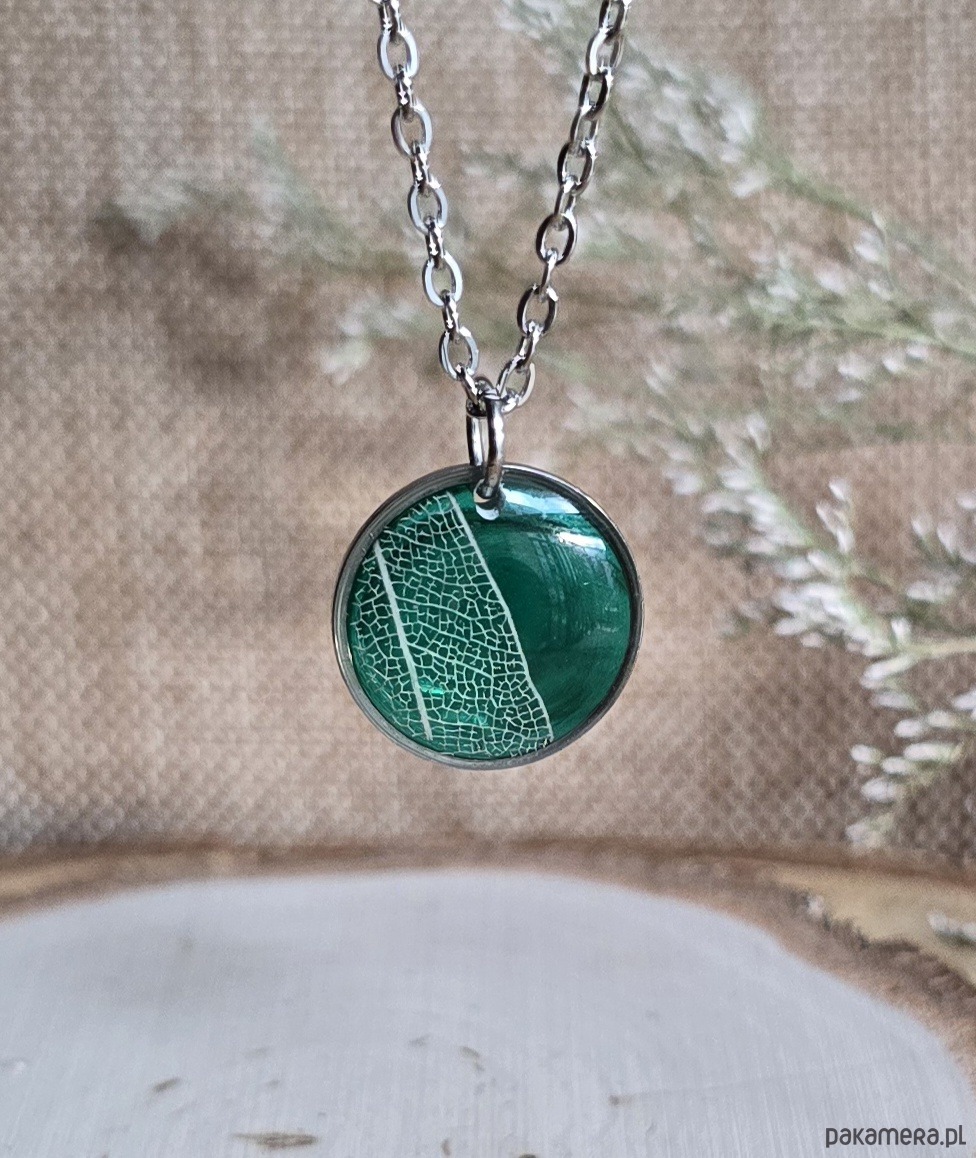 Srebrny wisiorek srebrna zawieszka medalion liść z liścien zielona