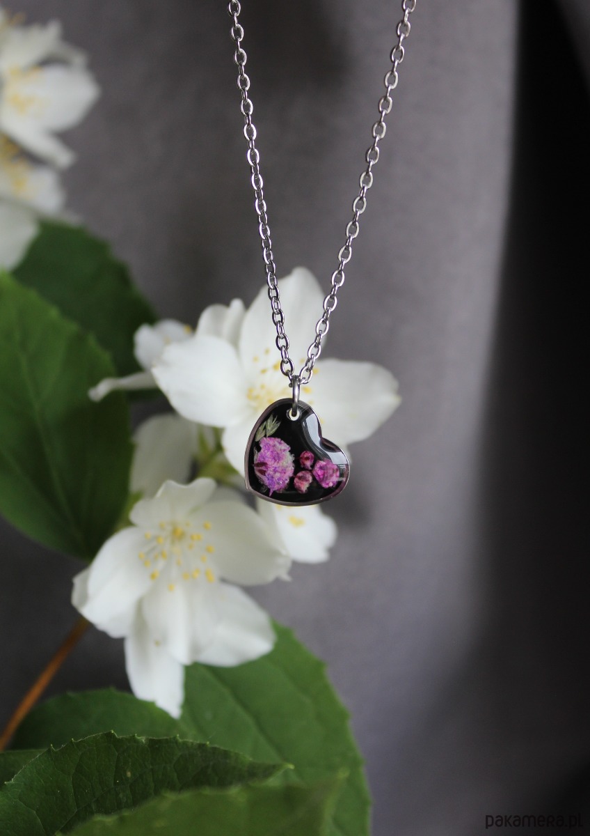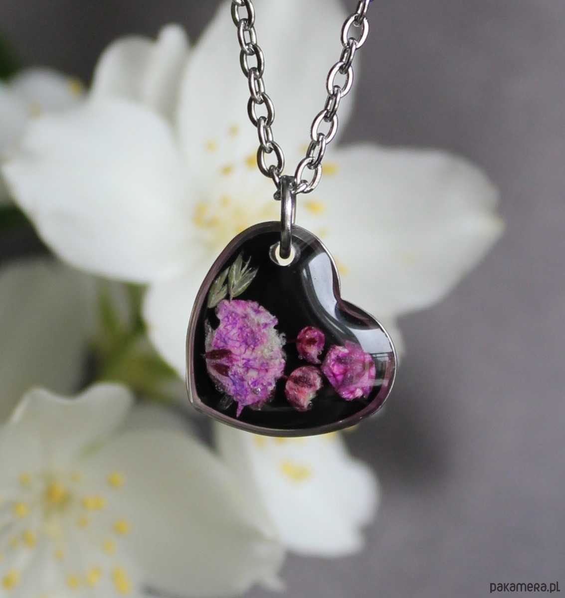 Oferuję Państwu unikalną biżuterię. Zawieszka jest wykonana z suszonych kwiatów i żywicy epoksydowej. Biżuteria jest wspaniałym i oryginalnym prezentem na lata.