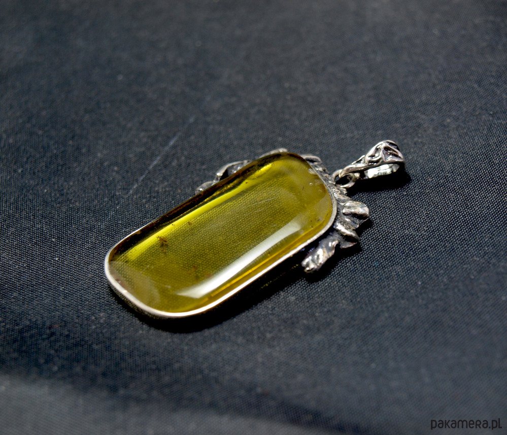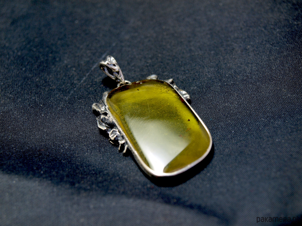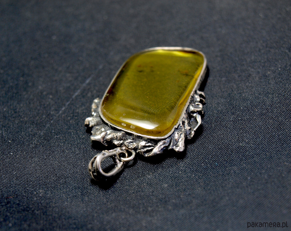 Ręcznie wykonany wisiorek z naturalnego bursztynu i srebra próby 925. Całość oprawiono w delikatną, srebrną ramkę z dekoracją.